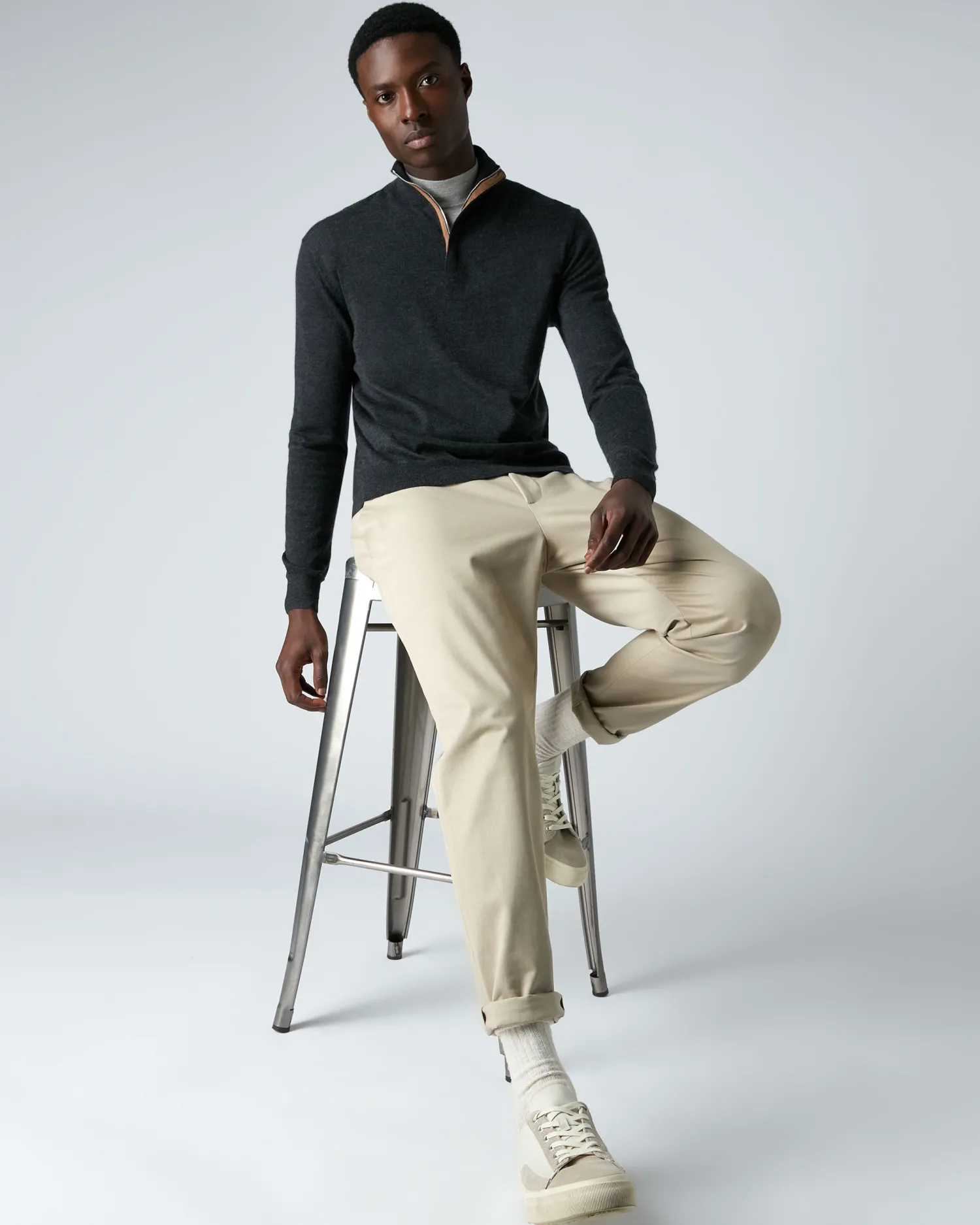The Regent, our half zip fine gauge Summer weight sweater. Made using a worsted yarn comprising 70% Cashmere and 30% Silk – A lighter Summer-weight garment – The perfect transitional piece – 30% Silk gives a coolness to the touch – Elegant half zip style with Alcantara trim – Great worn over formal shirts and T shirts alike – A sartorial staple, an investment in enduring style- Our fine gauge products have a naturally slimmer fit, if you’d like a looser fit (like our other products) or are between sizes, we suggest you size up- Model is wearing size Medium- Care: Dry Clean OnlynFind our full range of Men’s Fine Gauge Cashmere here.