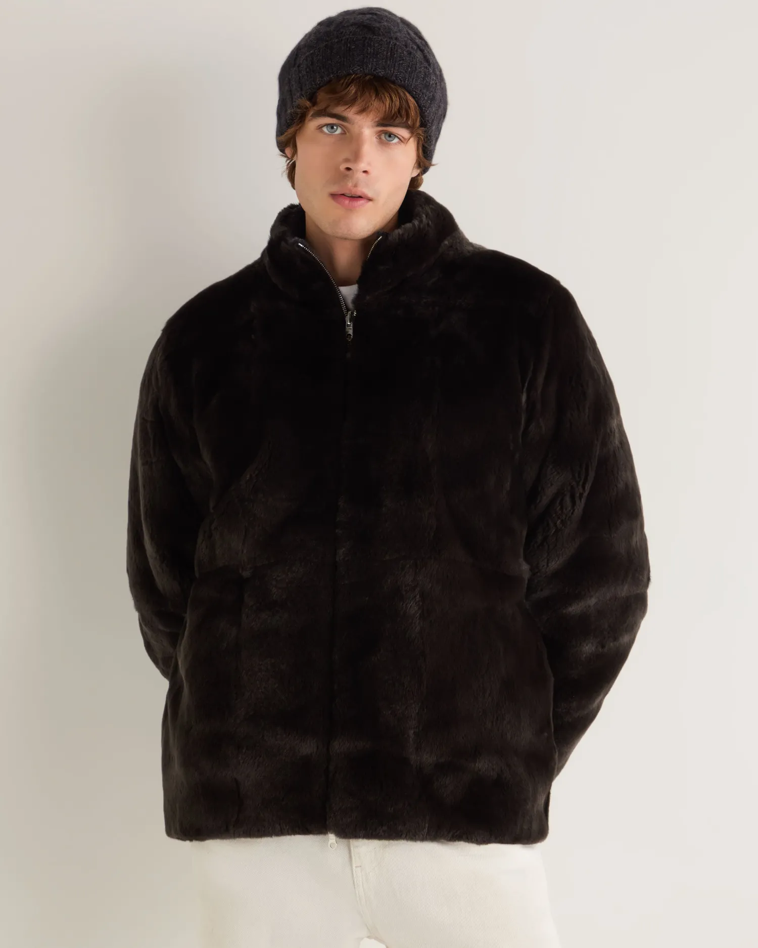 The opulence of a fur lined cashmere cable cardigan, a truly unique N.Peal piece. 100% Mongolian cashmere and Rex fur – Deep pile velvety dark brown Rex fur full lining – Beautiful cable knit cashmere – Two zip pockets – Full length two way zip – Fully reversible – 3ply – Model is wearing size Medium – Care: Dry Clean Only