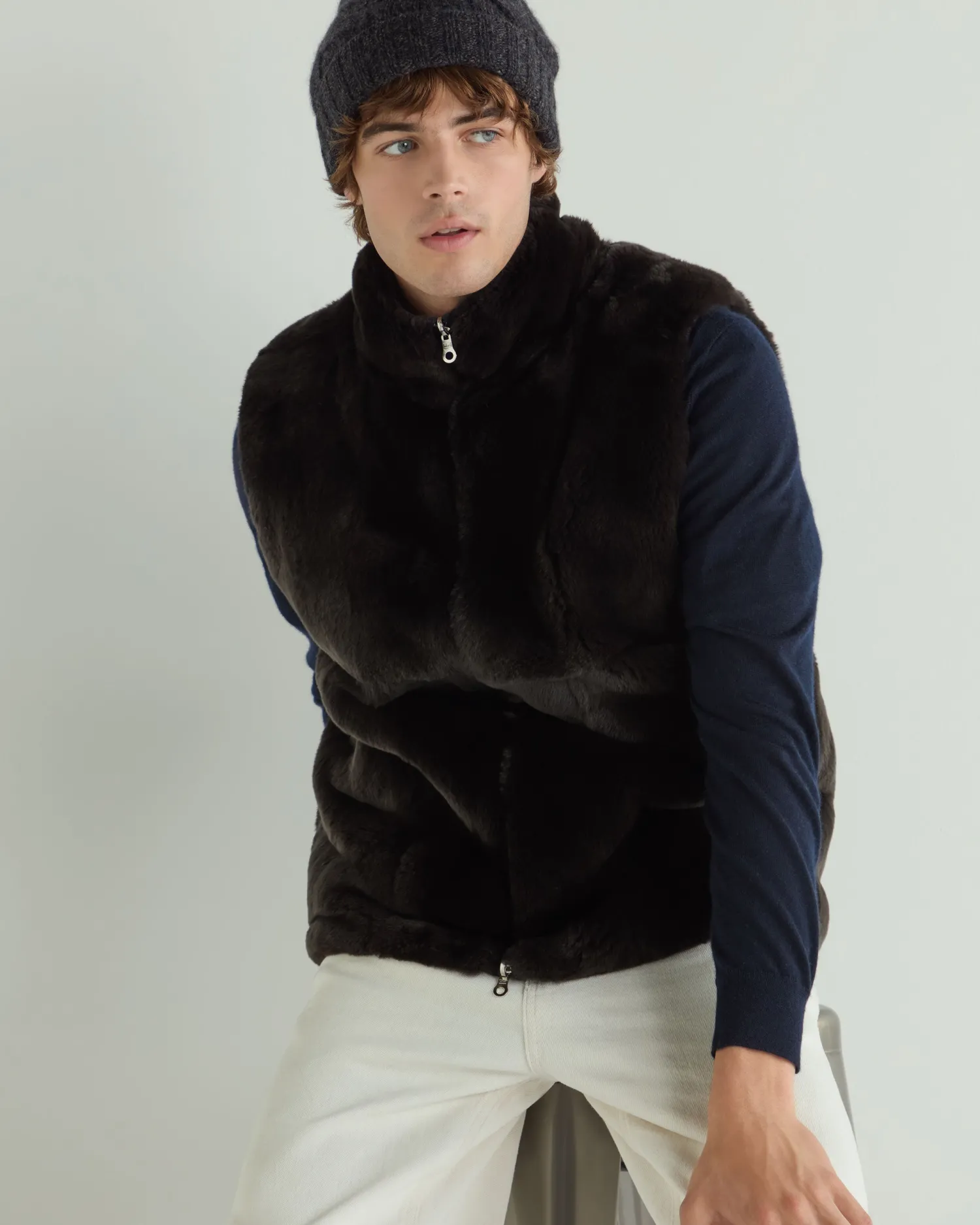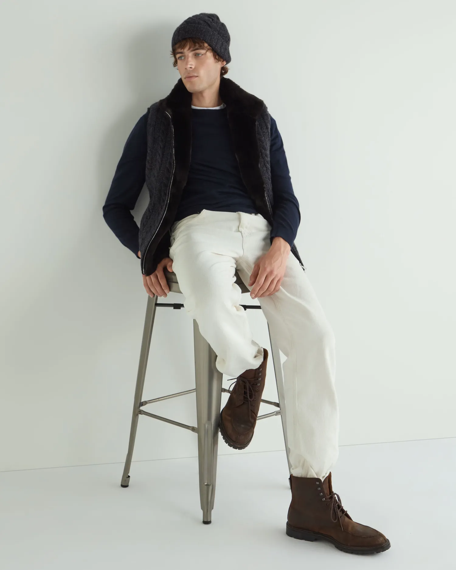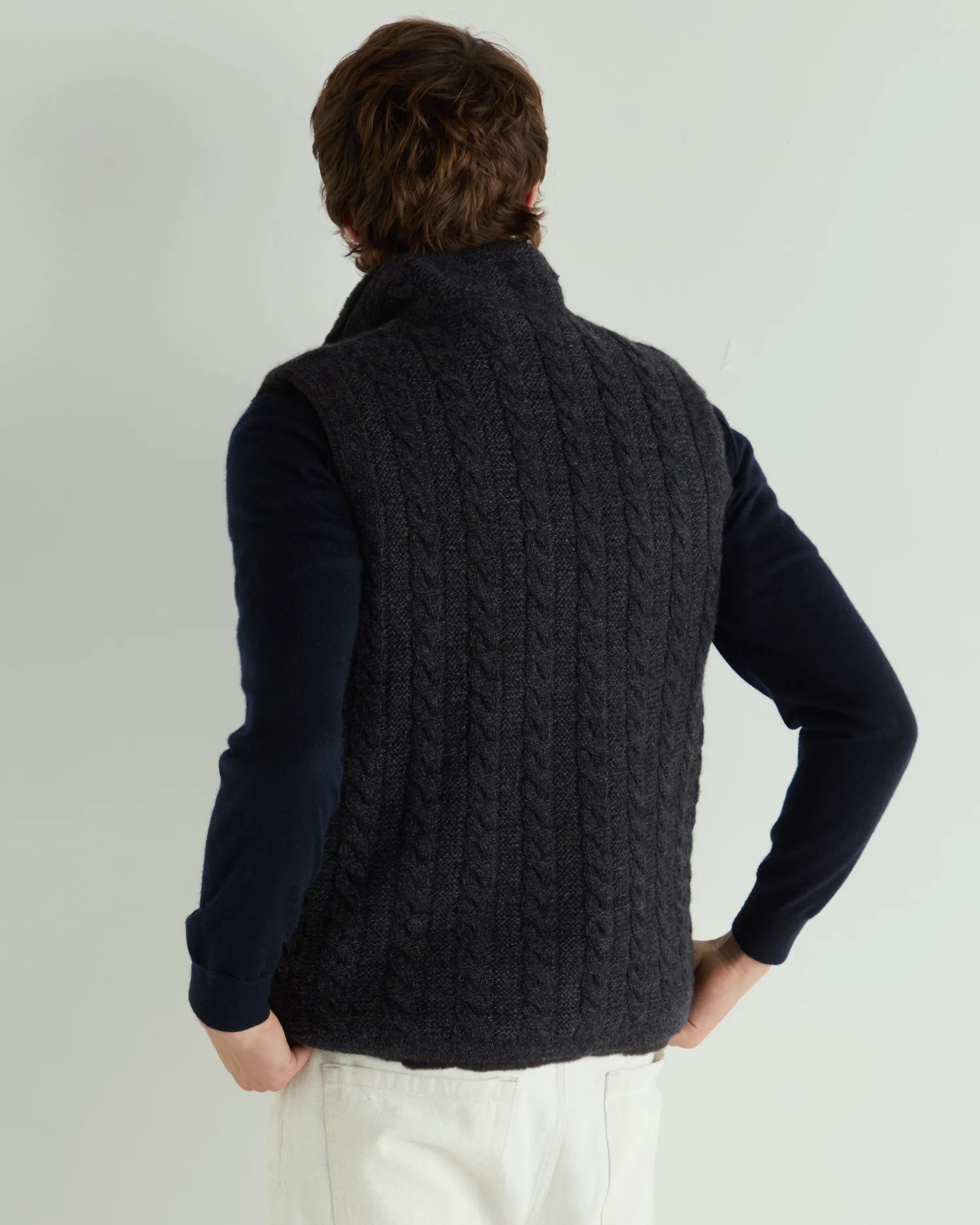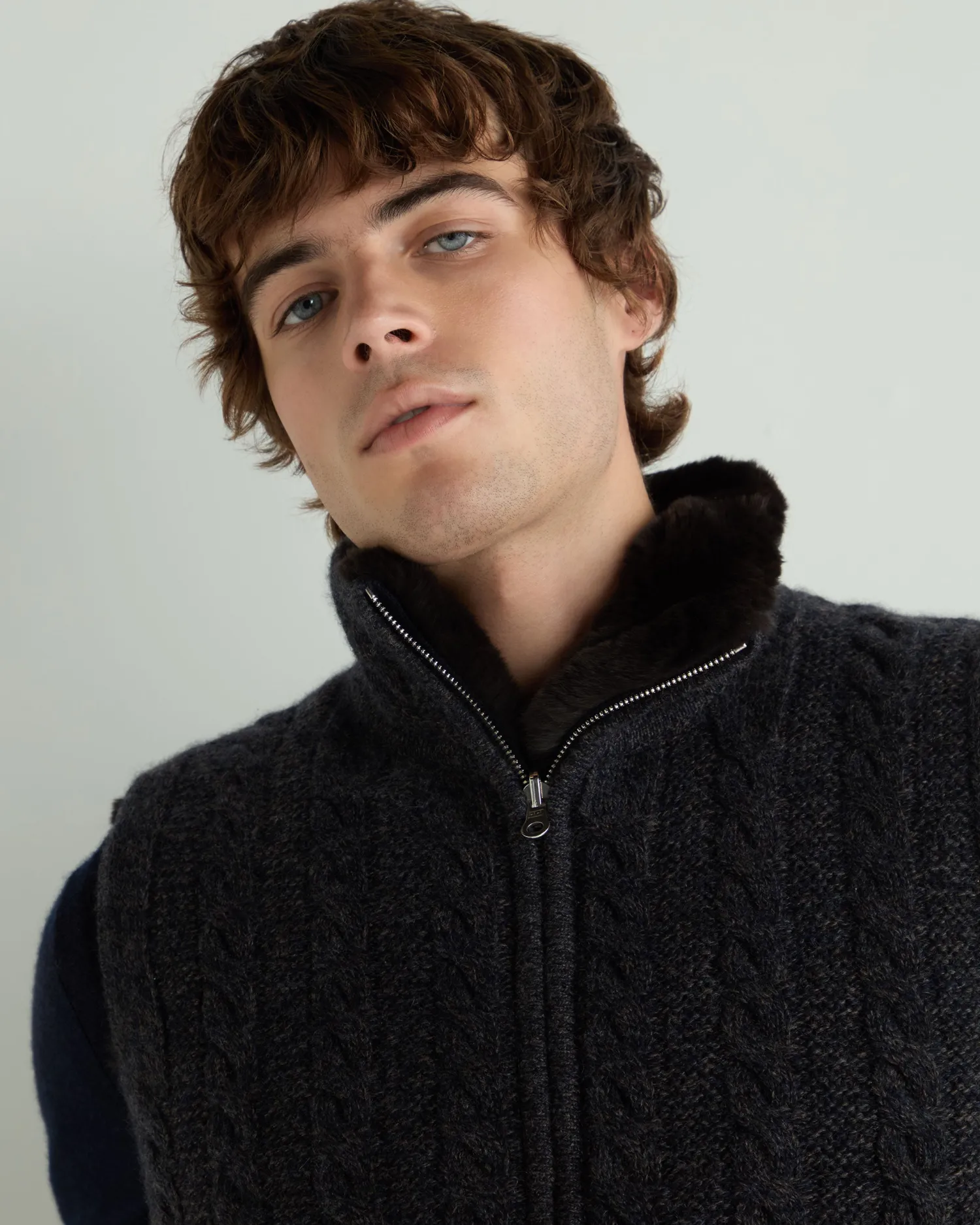 Cashmere and cable combine to make the finest possible fur lined gilet. 100% Mongolian cashmere with dark brown Rex fur lining – Beautiful cable knit cashmere – Full length two-way zip – Two zipped pockets – Perfect layering piece – Number one for comfort and style – 3ply – Model is wearing size Medium – Care: Dry Clean Only