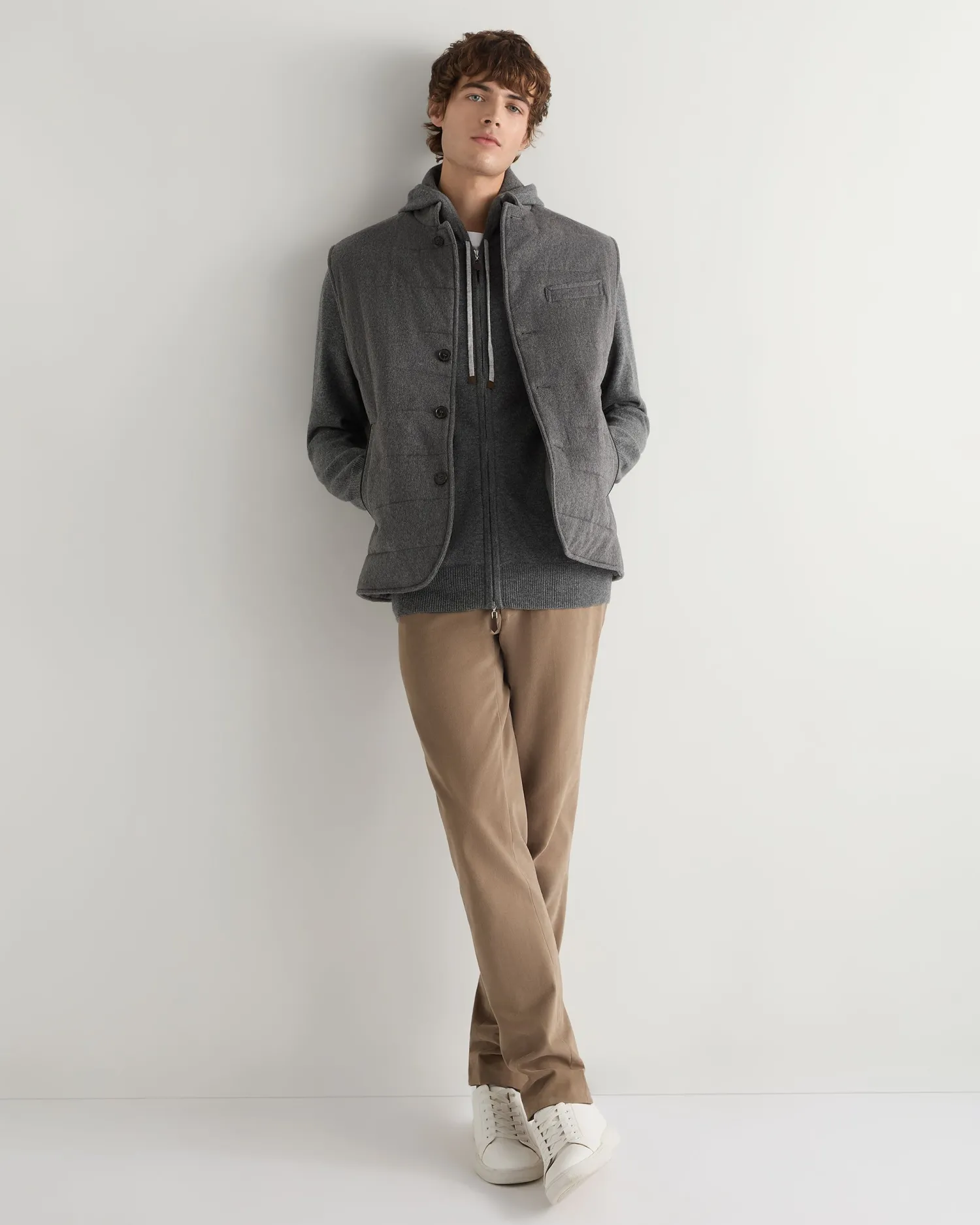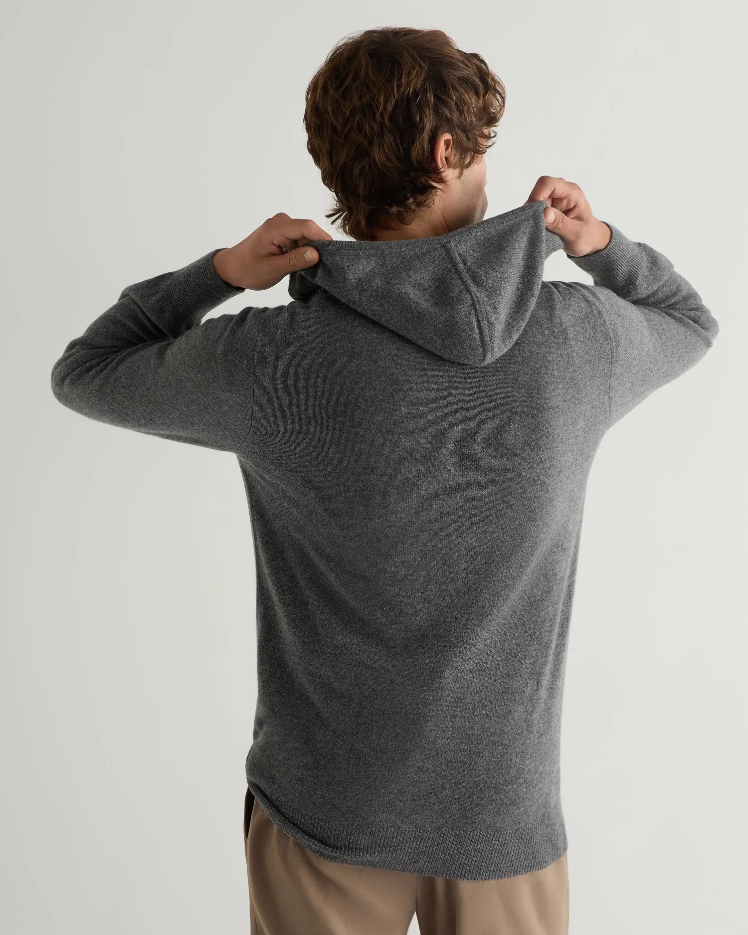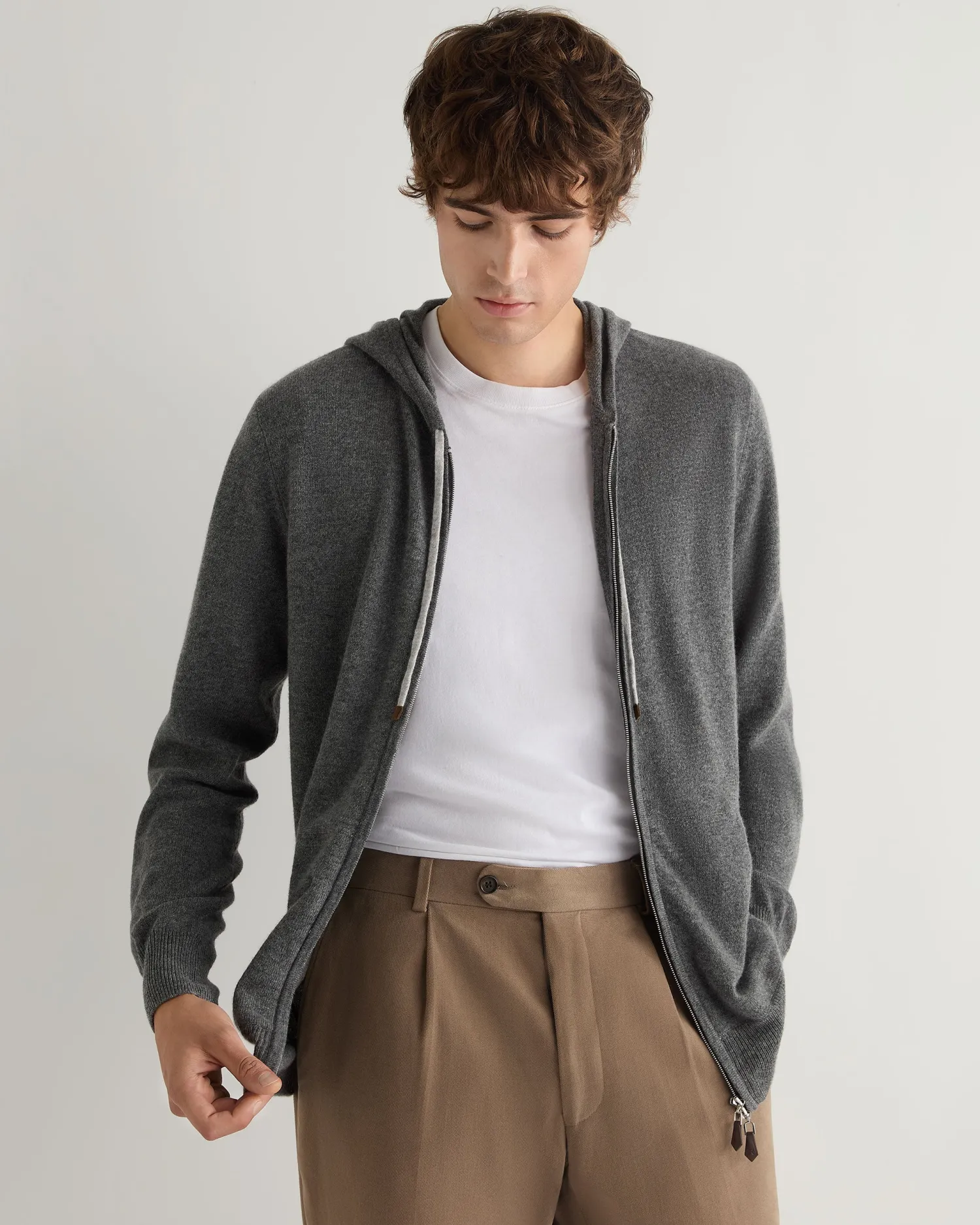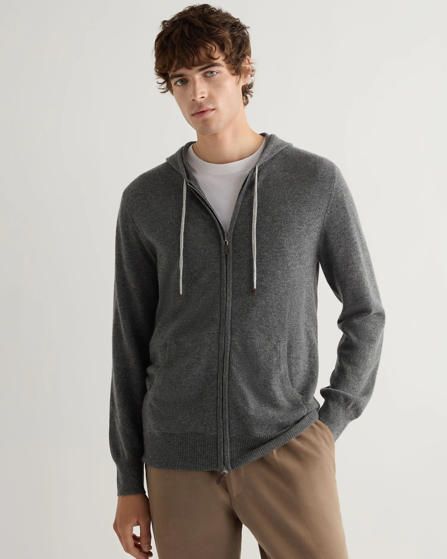 Leisure and luxury is combined here in a cashmere hooded zipped top. 100% Mongolian organic cashmere – Full length two-way zip – Smart leather toggle – Fumo grey contrast drawstring- Ultimate in casual cashmere – 1ply – Model is wearing size Medium – Care: Dry Clean Only Organic cashmere: organic dyes and detergents, free from fertilizer and pesticides, find out more here