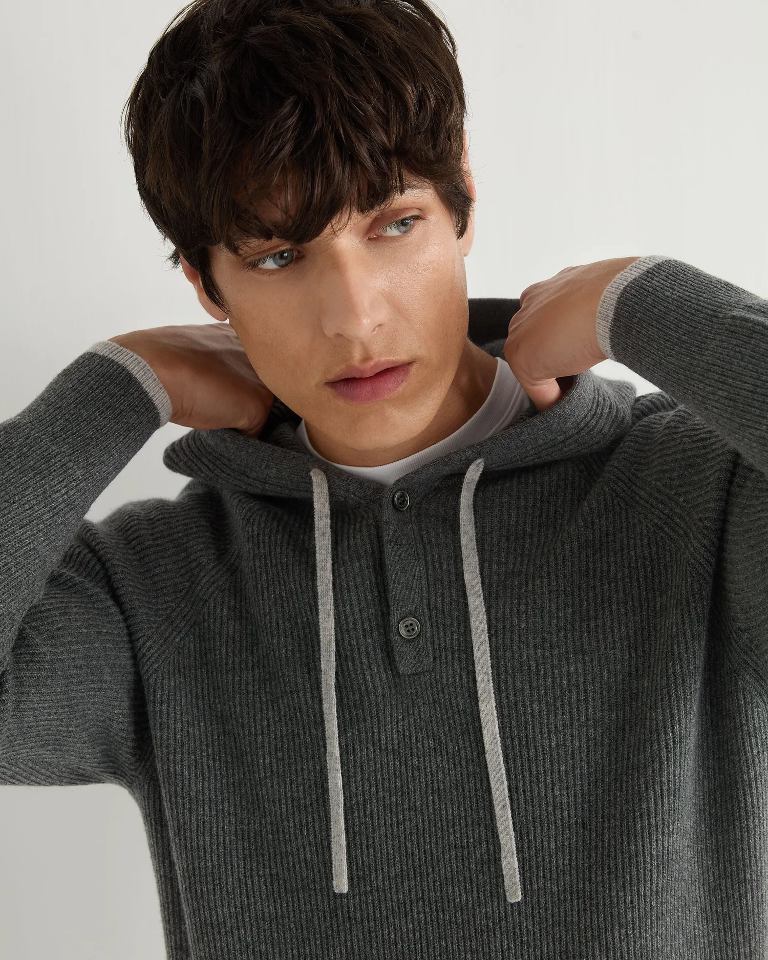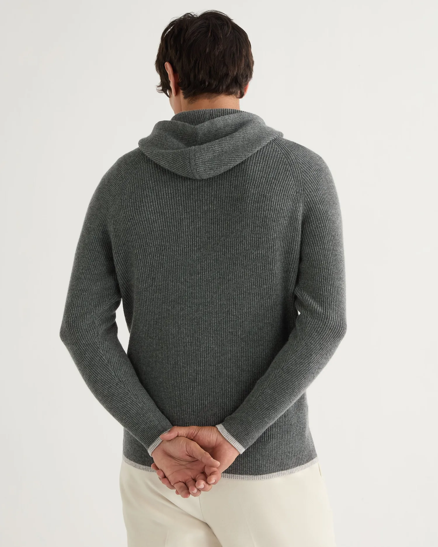 Another beautiful cashmere hoodie to add to your collection. Made from 100% organic Mongolian cashmere – Beautifully styled and supremely soft – Great over gym kit or around the house – Ideal for travelling – Generous rib stitch knit – Fumo grey contrast drawstring and tipping – Easy-to-wear, warm and comfortable- 1Ply – Model is wearing size Medium – Care: Hand Wash Organic cashmere: organic dyes and detergents, free from fertilizer and pesticides, find out more here