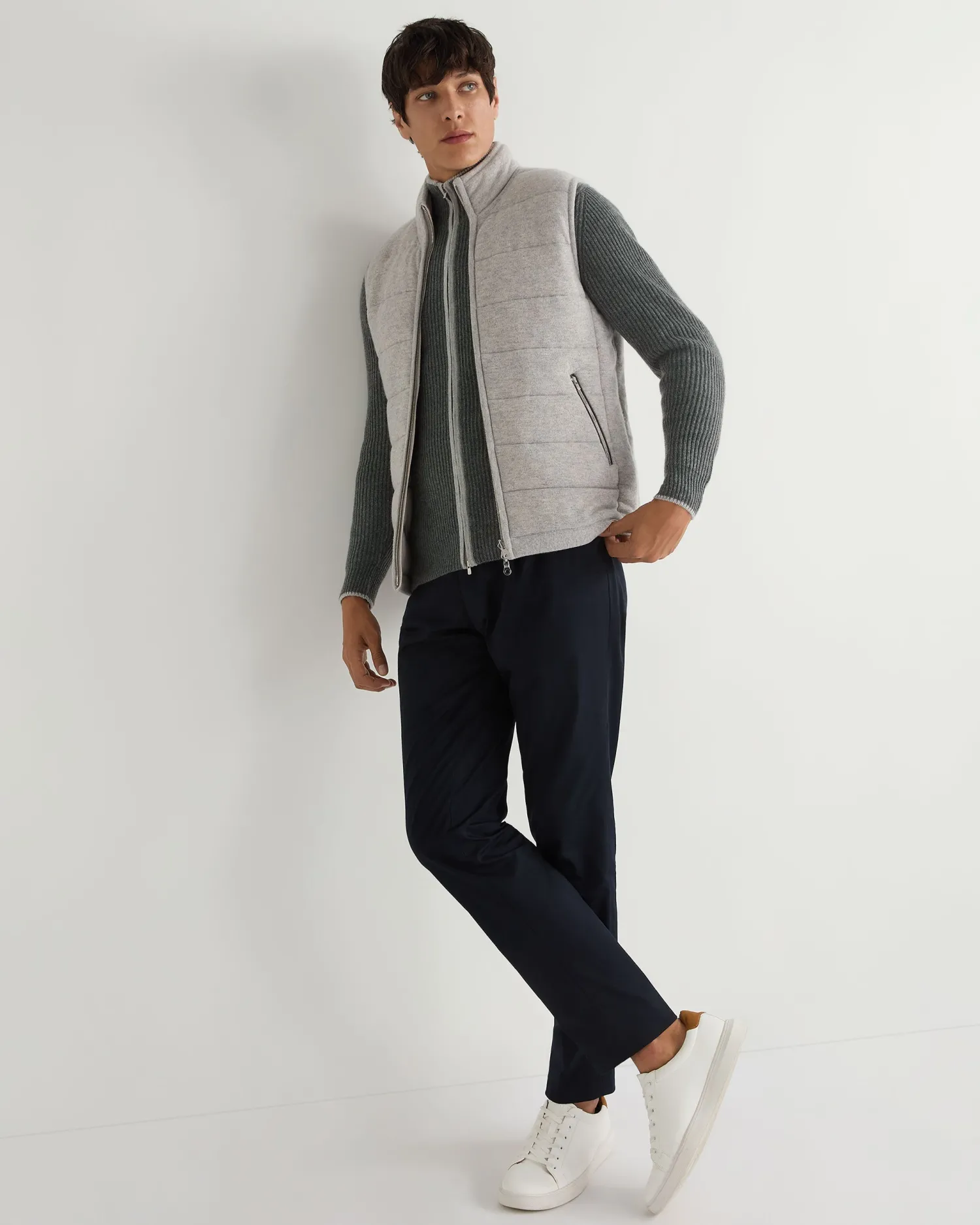 Another popular zip through cardigan style. Made from 100% organic Mongolian cashmere – Smart two-way zip – Enhanced with delightfully rib knitted cashmere – Great design and subtle stretch – Flattering vertical rib structure – Fumo grey contrast edging and collar – Great worn over our polo necks or a shirt/T shirt- 2Ply- Model is wearing size Medium – Care: Hand Wash Organic cashmere: organic dyes and detergents, free from fertilizer and pesticides, find out more here