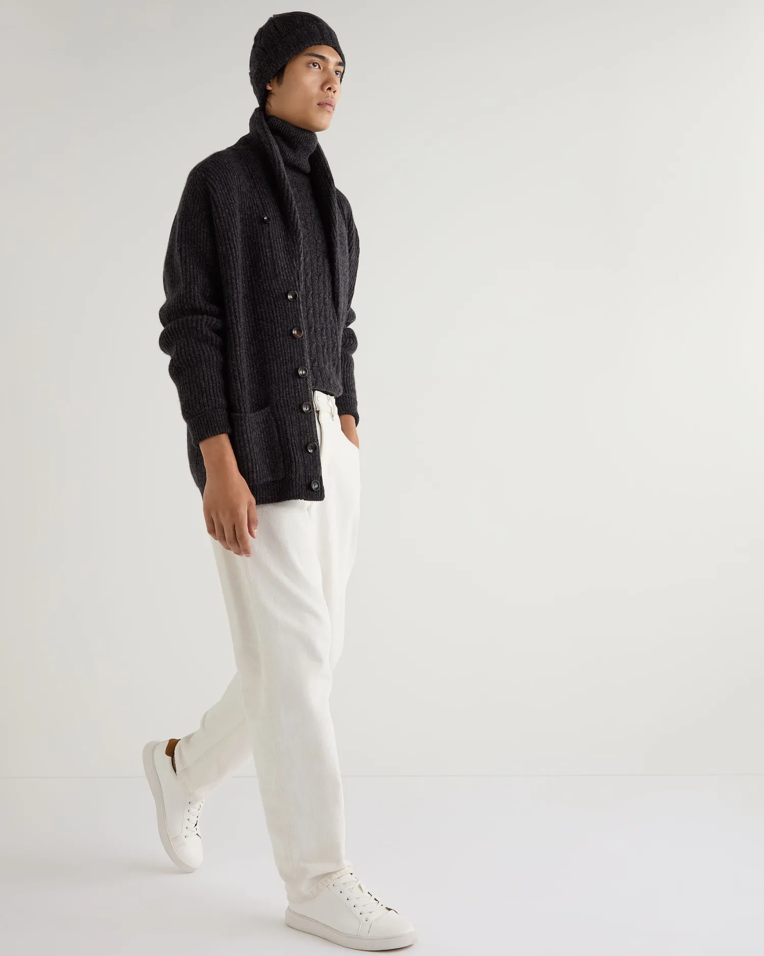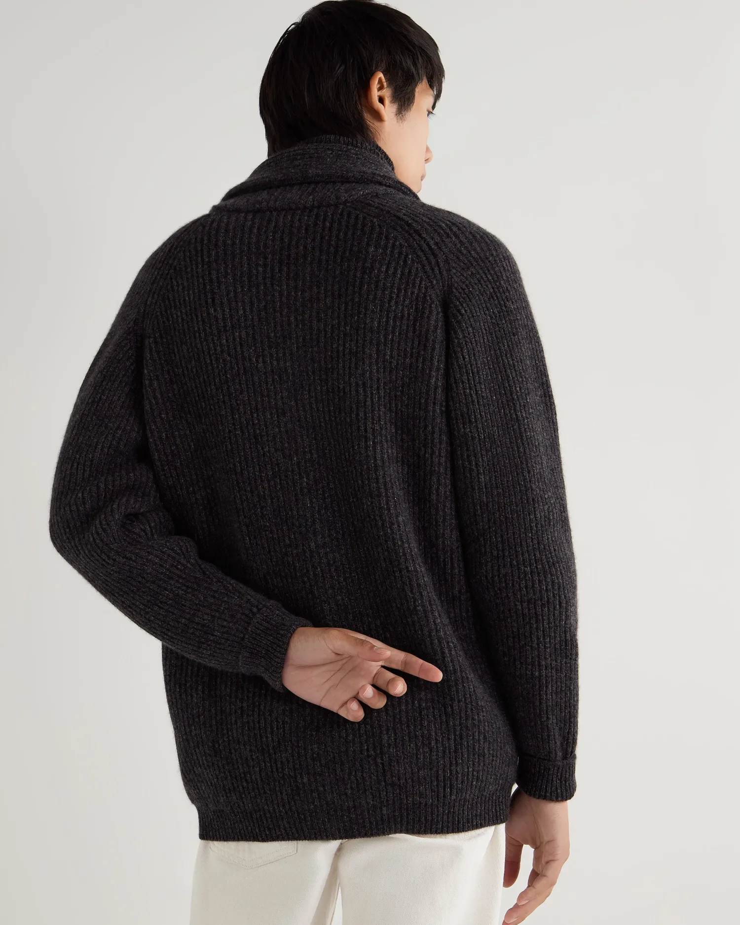 The ultimate in cashmere cardigans, utterly beautiful in design and creation. n Made from 100% Mongolian cashmere Heavy rib knit Smart button fastening Two patch pockets Generous and luxurious shawl collar design Turned up cuff 3ply Model is wearing size Medium Care: Hand Wash