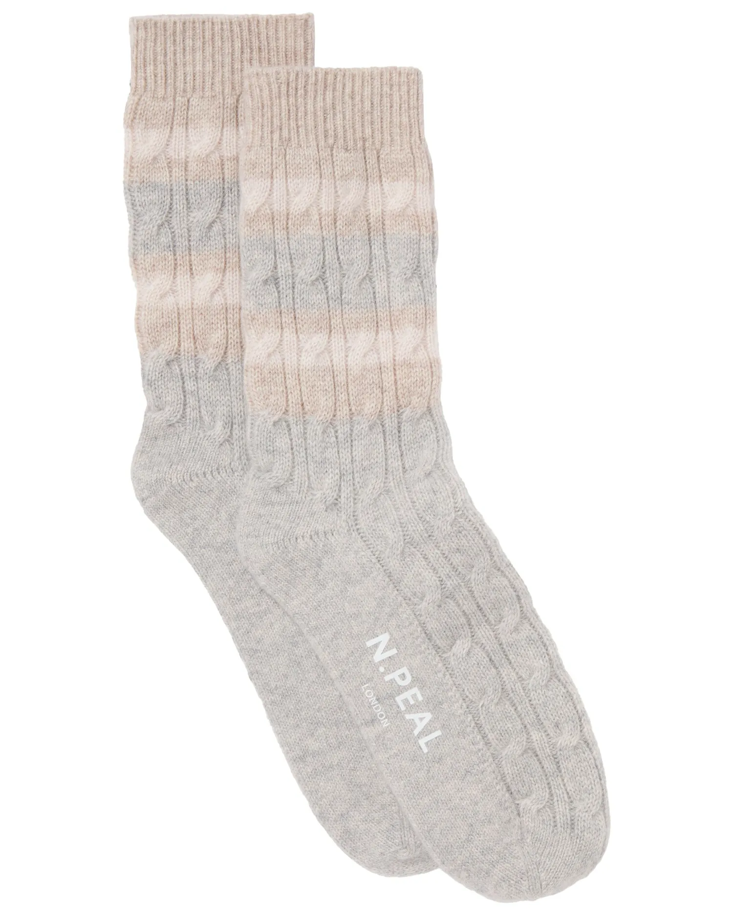 Upgrade your sock game with our new striped cable socks. Made from 94% organic Mongolian cashmere and 6% Nylon – A classic cable knit design and bold stripes in sand brown and frost white- Luxuriously soft and comfortable – Perfect for cold weather – The perfect winter gift – 2ply – Care: Hand Wash