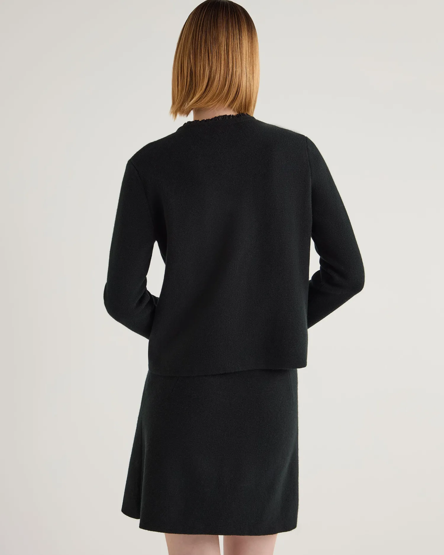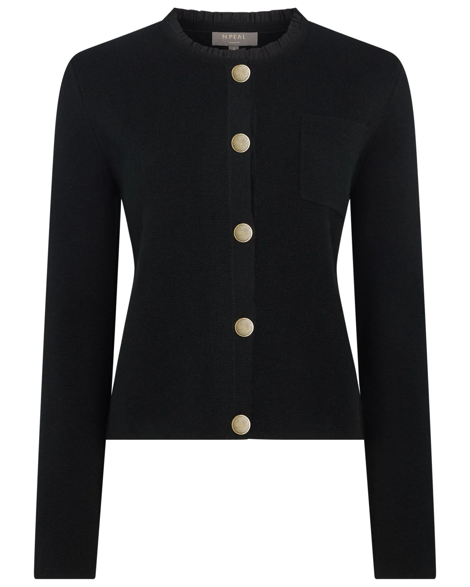 Made from the finest cashmere, our new ruffle collar jacket offers both style and comfort. Made from 100% organic Mongolian cashmere of the finest quality – Featuring a delicate 100% Cotton ruffle collar which sets it apart from the ordinary – Beautiful gold buttoned down front – Either could be worn over a dress for an evening out or paired with trousers with a chic daytime look – Luxuriously soft and comfortable, yet still so stylish – Perfect for layering in the cooler months – Featuring a convenient chest pocket – 1ply – Model is wearing size Small – Care: Hand Wash Organic cashmere: organic dyes and detergents, free from fertilizer and pesticides, find out more here