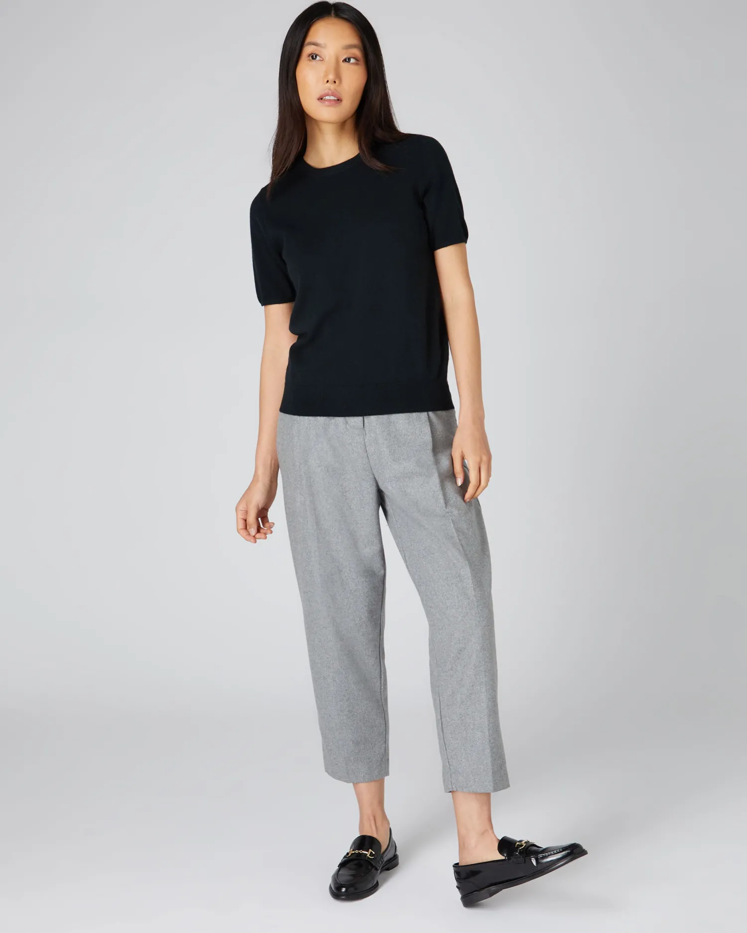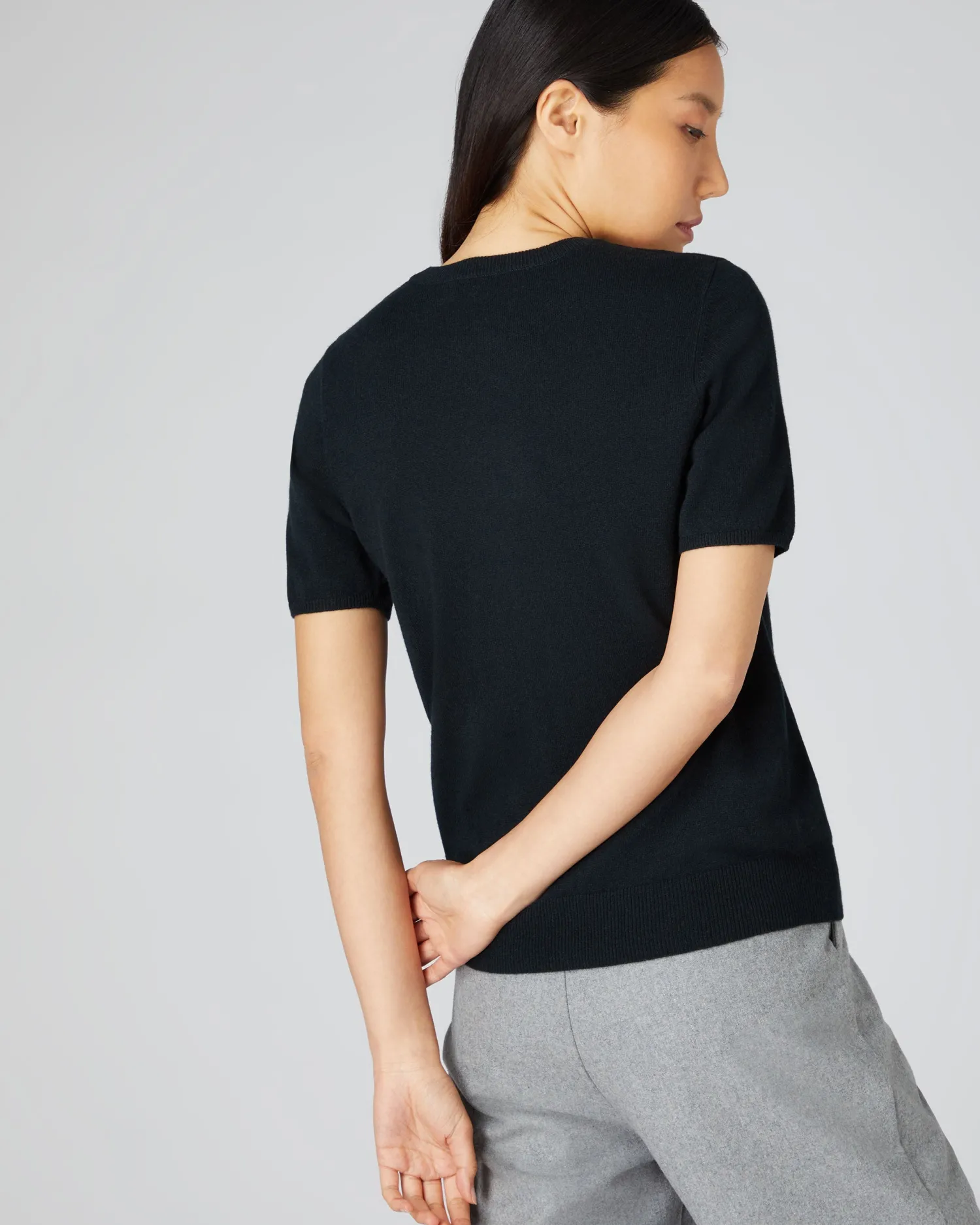 A fabulous piece to dress up or down – the cashmere round neck T shirt. 100% Mongolian Organic Cashmere – Flattering round neck style – Short sleeves – Perfect layering piece – Neat matching trim finish- Model is wearing size Small- Care: Hand Wash Organic cashmere: organic dyes and detergents, free from fertilizer and pesticides, find out more herenFind our full range of Women’s Cashmere T-Shirts here.
