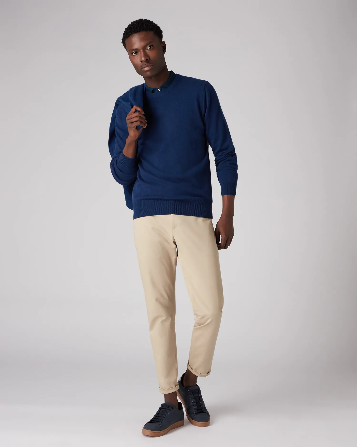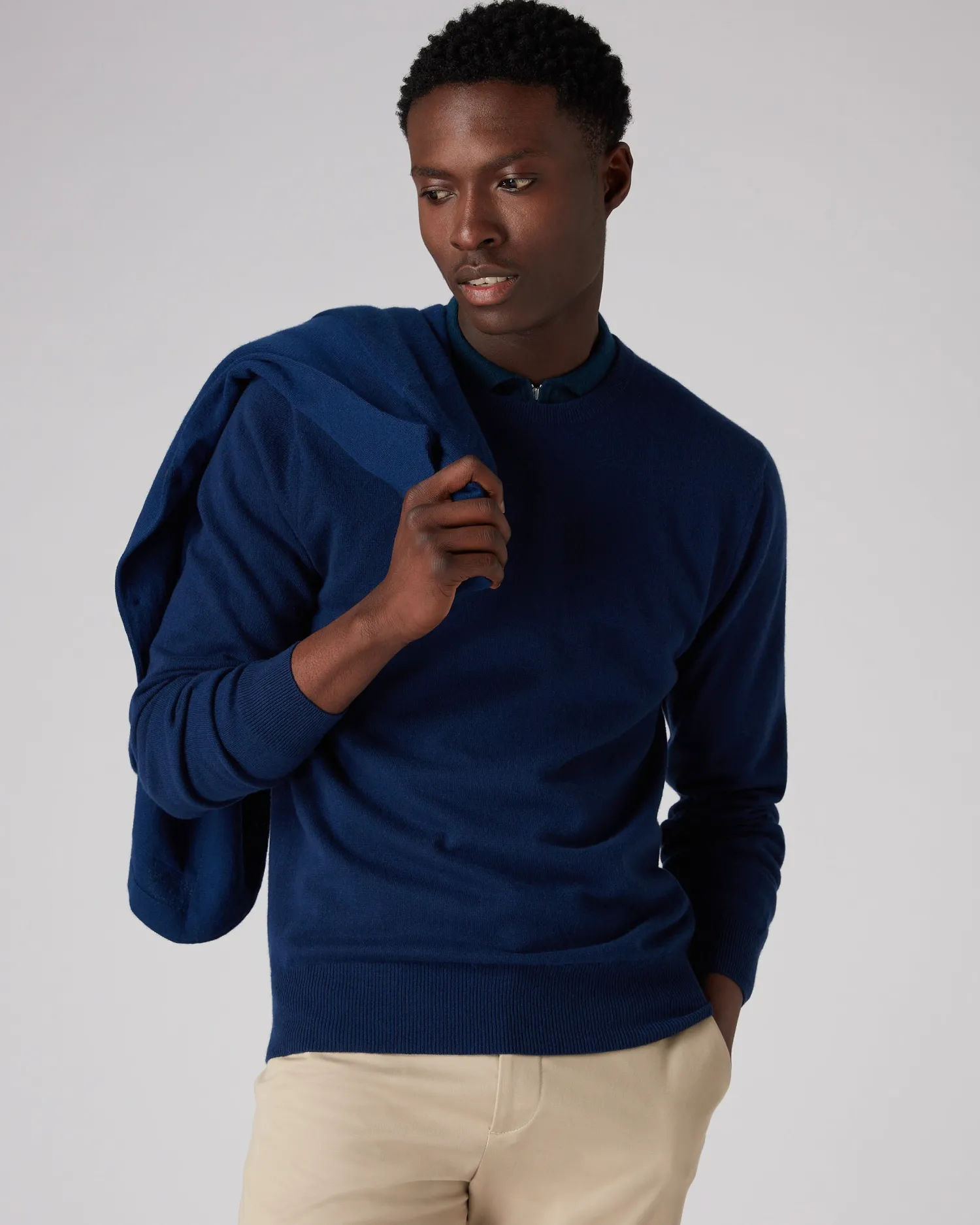 N.Peal’s best selling Oxford round neck cashmere sweater in 1ply, true luxury in cashmere. Crafted from 100% Mongolian organic cashmere – The most famous N.Peal sweater out there! – As worn by the character of James Bond in Skyfall – Extremely popular piece due to its 007 credentials – A luxurious sartorial staple – Perfect for all seasons – Sells out regularly, particularly in Blue Wave! – Male model is wearing size Medium- Care: Hand Wash Organic cashmere: organic dyes and detergents, free from fertilizer and pesticides, find out more here