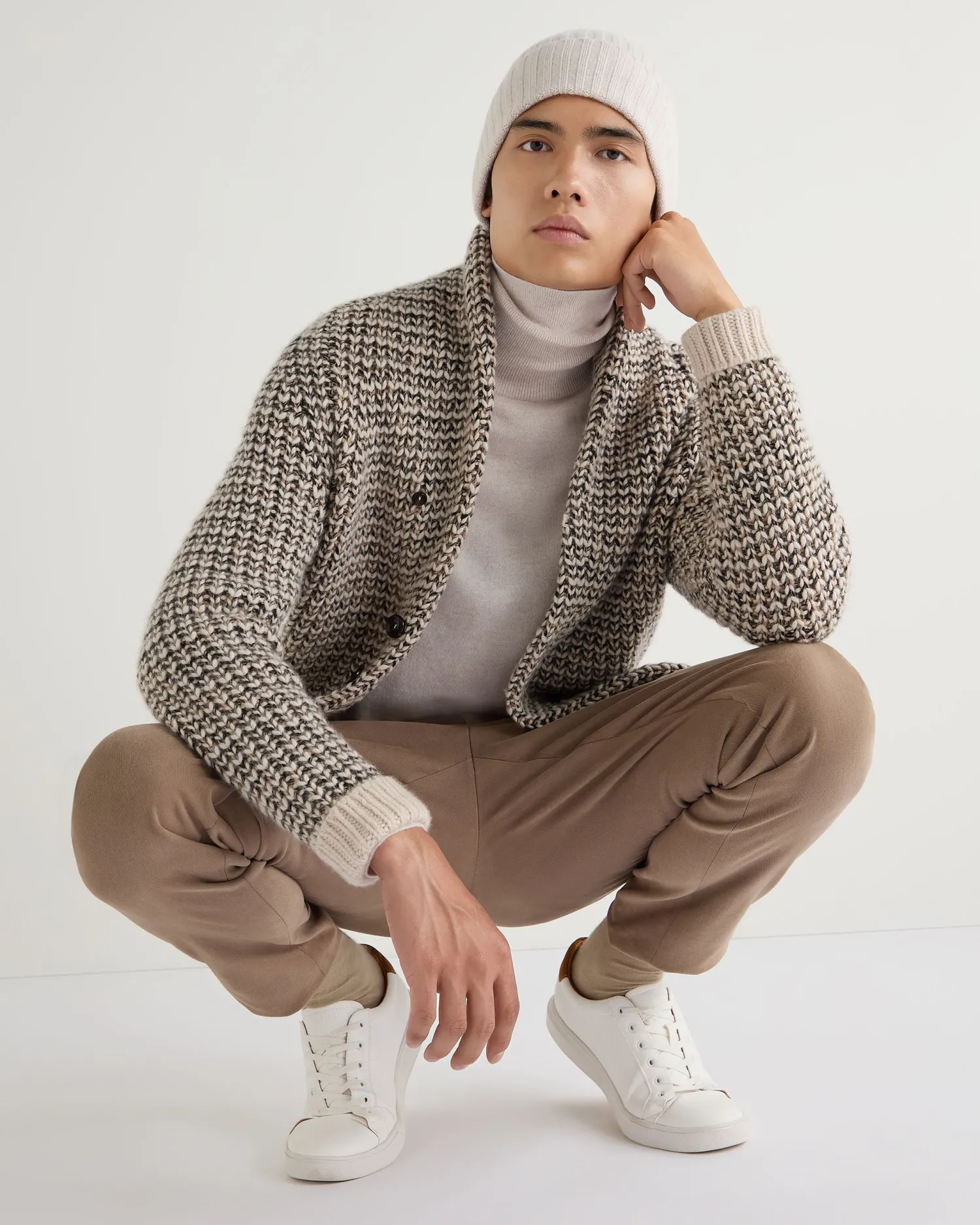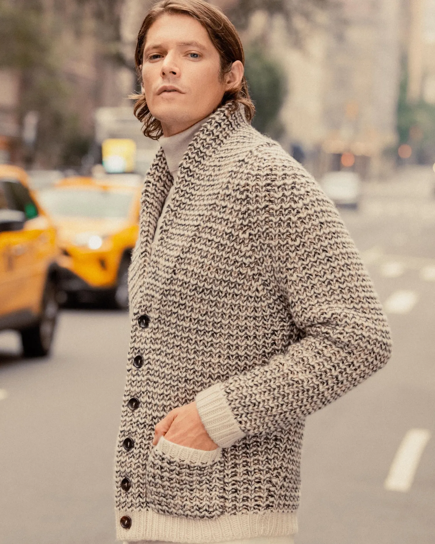 The new mens marl Kensington cardigan is a versatile piece which effortlessly transitions from casual to smart occasions. Made from 100% organic Mongolian cashmere – Unparalleled level of softness and warmth – Featuring ribbed cuffs and hem – Button down front – Ideal for layering over a crisp shirt for the office or a simple T-shirt for relaxed weekends – An essential addition to any wardrobe – The unique marl texture adds depth and character in a blend of ecru, black and camel- 10ply – Model is wearing size Small-Medium – Care: Hand Wash Organic cashmere: organic dyes and detergents, free from fertilizer and pesticides, find out more here