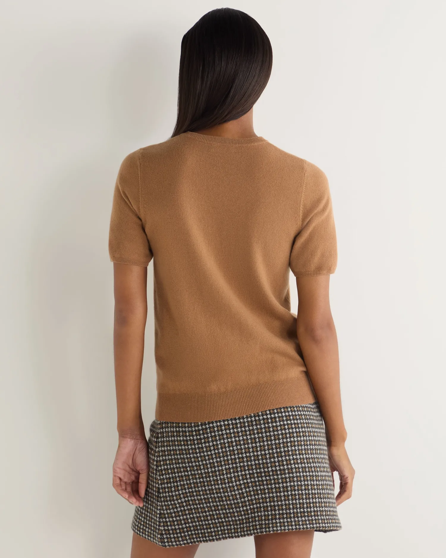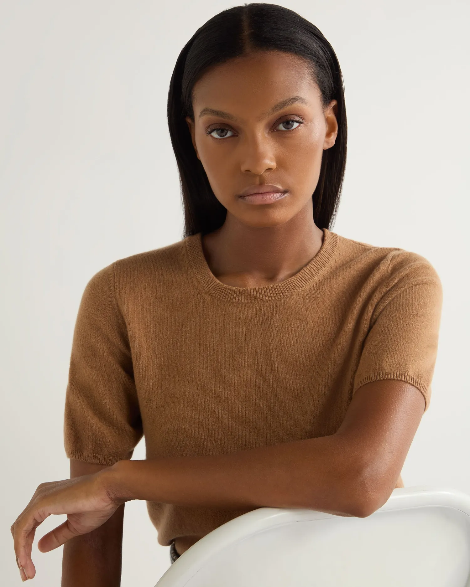 A fabulous piece to dress up or down – the cashmere round neck T-shirt. 100% Mongolian organic cashmere – Flattering round neck style – Short sleeves – Perfect layering piece – Neat matching trim finish – 1ply – Model is wearing size Small – Care: Hand Wash Organic cashmere: organic dyes and detergents, free from fertilizer and pesticides, find out more here