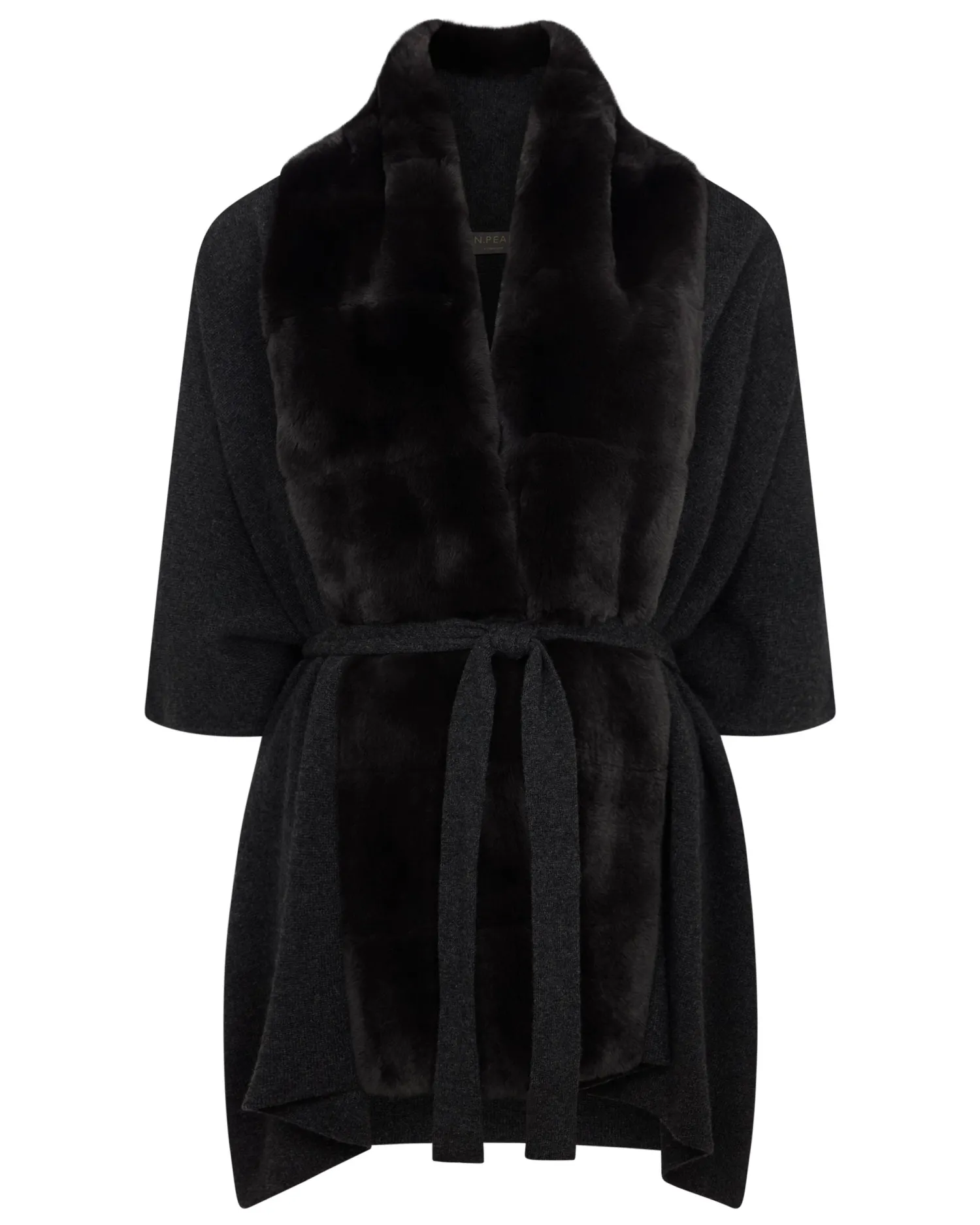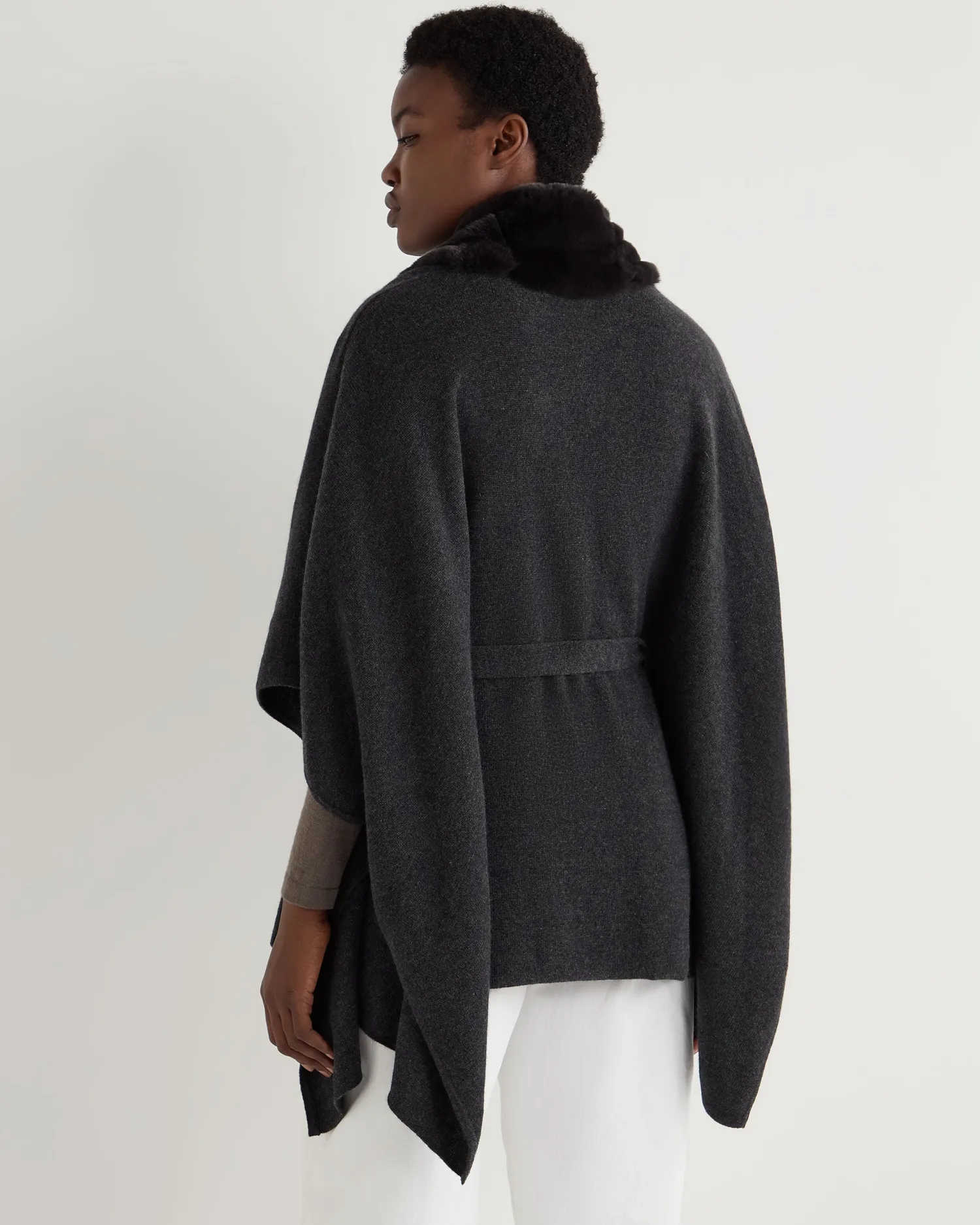 A generously sized and luxurious cape. Made from 100% Mongolian cashmere with a Rex fur trim – Extravagant cape style – Beautiful dark grey Rex placket trim – Matching knitted belt with slits to feed it through – Fabulous worn over a smart dress – Equally at home with jeans and boots – Perfect for those colder days – Perfect layering piece – 1ply – Care: Dry Clean Only