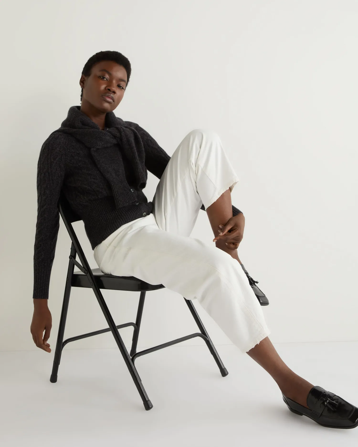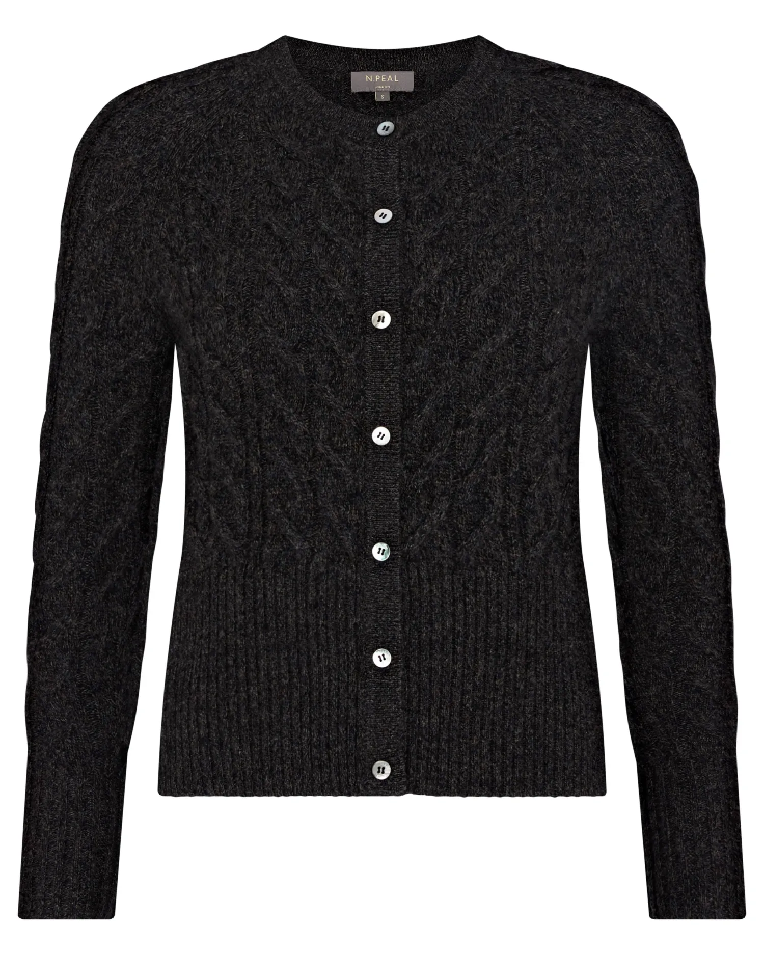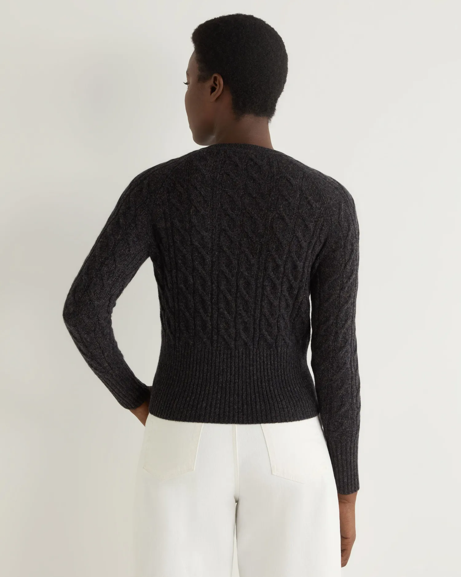 A wonderfully simple and stylish cable cashmere cardigan. n Crafted from 100% Mongolian cashmere Popular cropped cardigan style Modern cable texture Mother of pearl buttons Deep ribbed hem and matching cuffs 2ply Model is wearing size Small Care: Hand Wash
