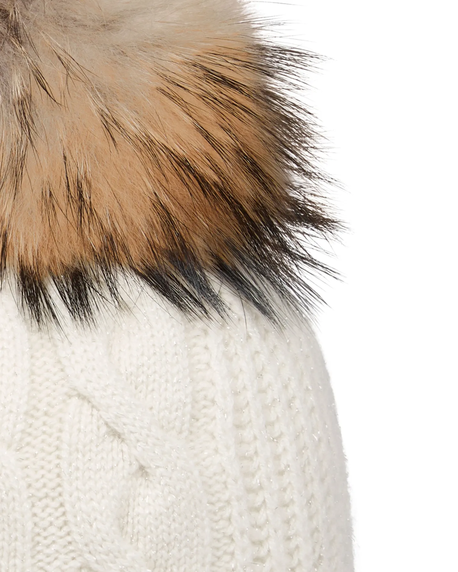 A lovely new cable design on a popular hat style with pom, now with added Lurex.n Made from 92% organic Mongolian cashmere and 8% Lurex Interesting and attractive cable and rib combination Supersoft against the skin and hair Detachable raccoon pom for ease of cleaning Matches perfectly with N.Peal cable gloves and scarves 3ply Care: Dry Clean Only