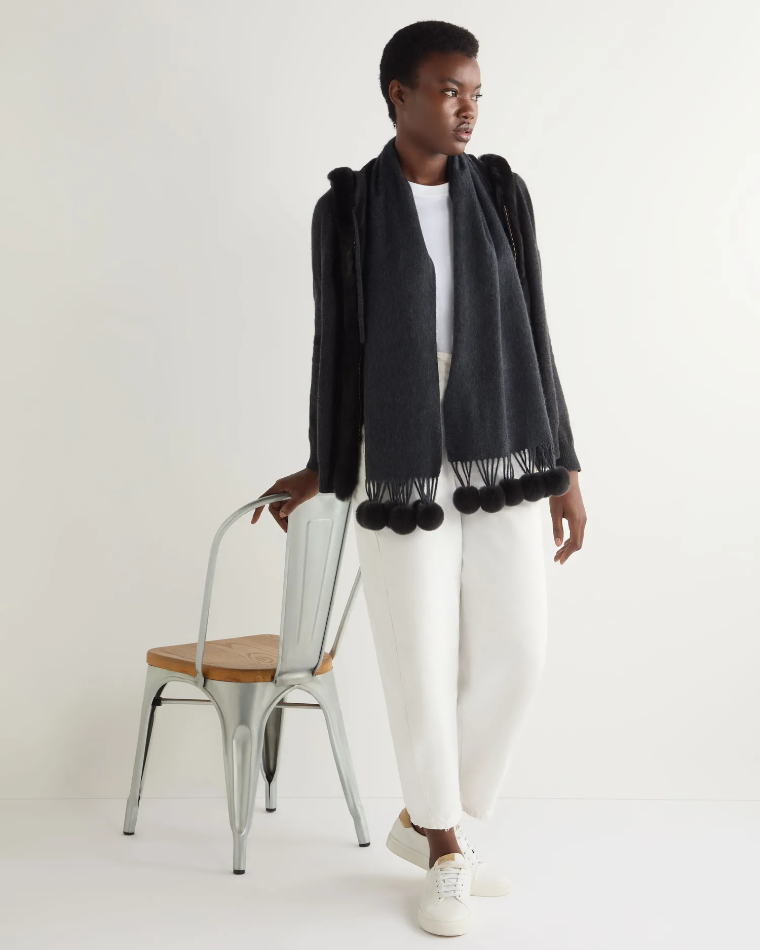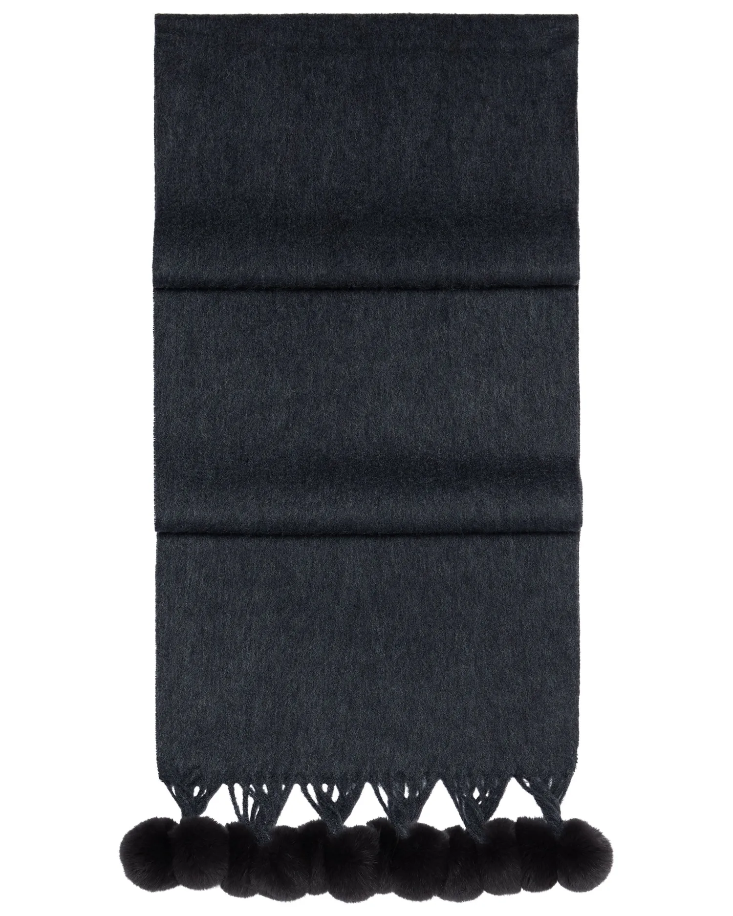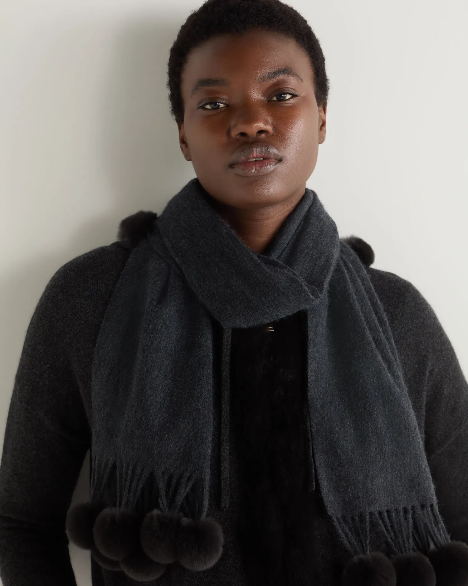 Our fabulous fur bobble woven scarf, a great favourite with many. Made from 100% Mongolian cashmere – Dark grey Rex fur bobbles on tassels at both ends – Measures 150x30cm plus the tassel/bobble – Beautiful high quality product – Can be worn casually with jeans – Equally great with a smarter outfit – Would make a wonderfully generous gift – Care: Dry Clean Only