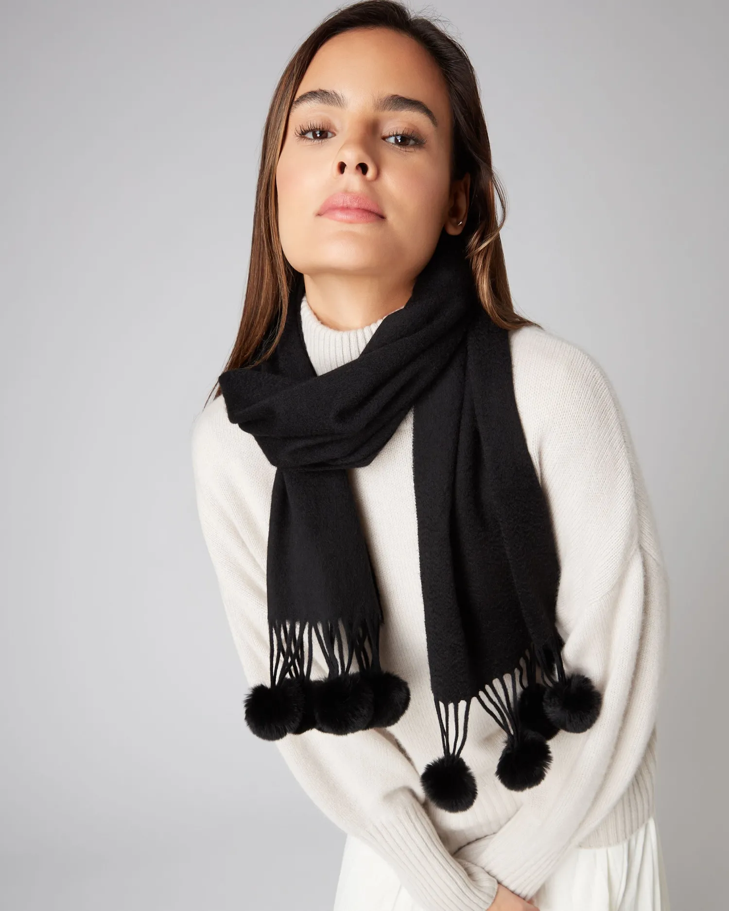 Our fabulous fur bobble woven scarf, a great favourite with many. Made from 100% Mongolian Cashmere – Black Rex fur bobbles on tassels at both ends – Measures 150x30cm plus the tassel/bobble – Beautiful high quality product – Can be worn casually with jeans – Equally great with a smarter outfit – Would make a wonderfully generous gift- Care: Dry Clean Only