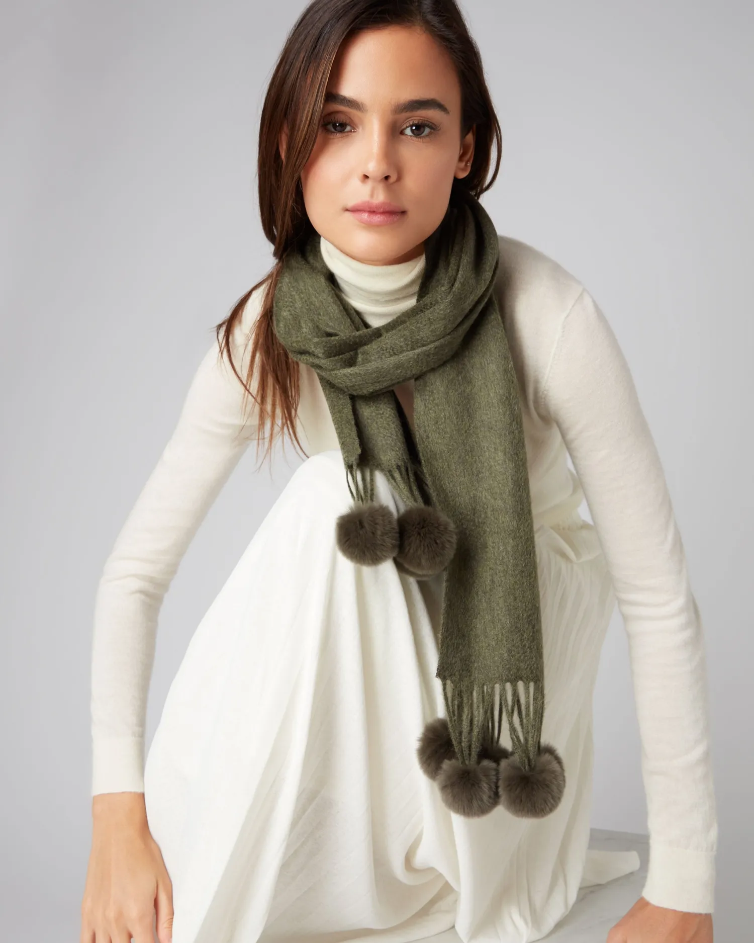 Our fabulous fur bobble woven scarf, a great favourite with many. Made from 100% Mongolian Cashmere – Dark olive green Rex fur bobbles on tassels at both ends – Measures 150x30cm plus the tassel/bobble – Beautiful high quality product – Can be worn casually with jeans – Equally great with a smarter outfit – Would make a wonderfully generous gift- Care: Dry Clean Only