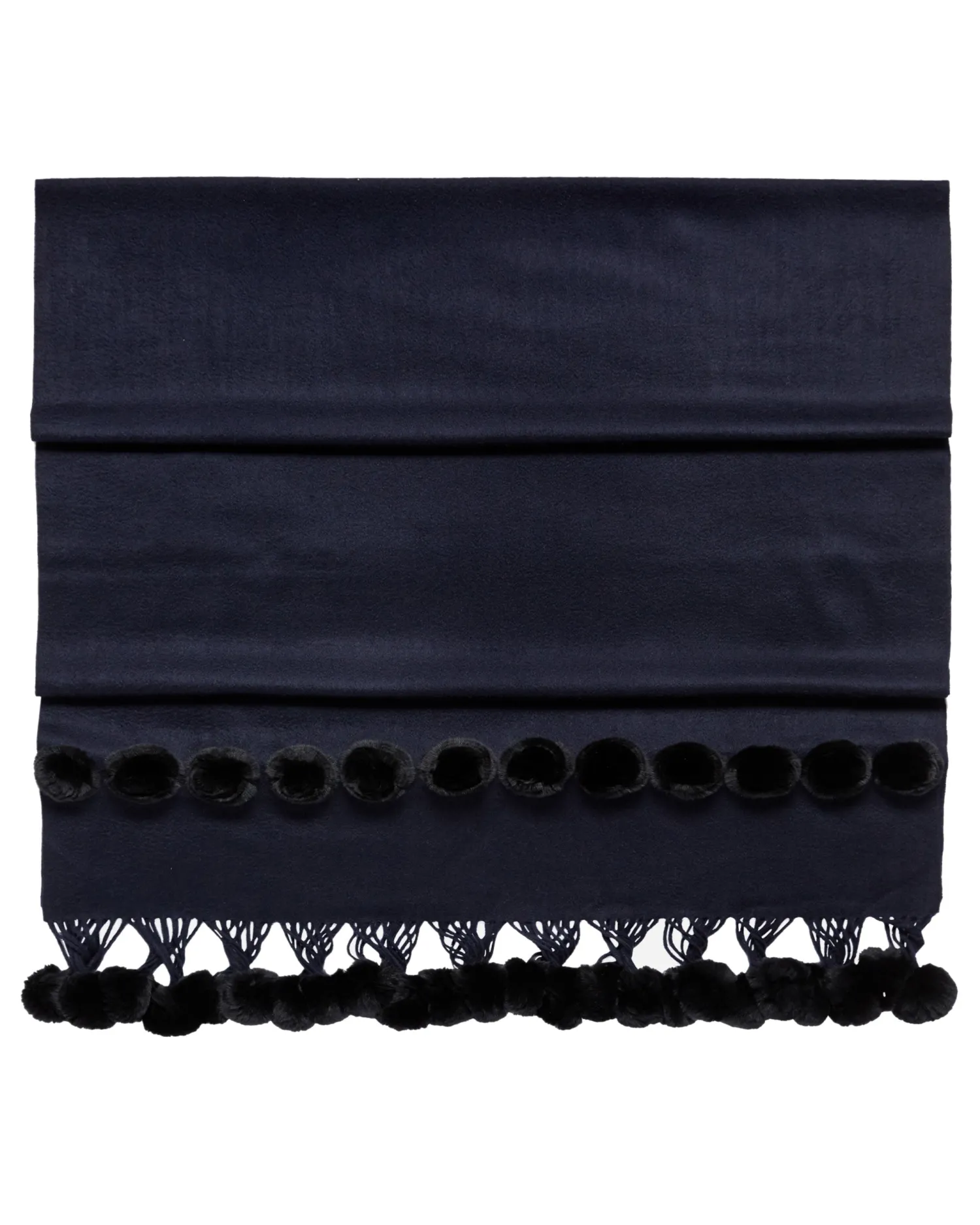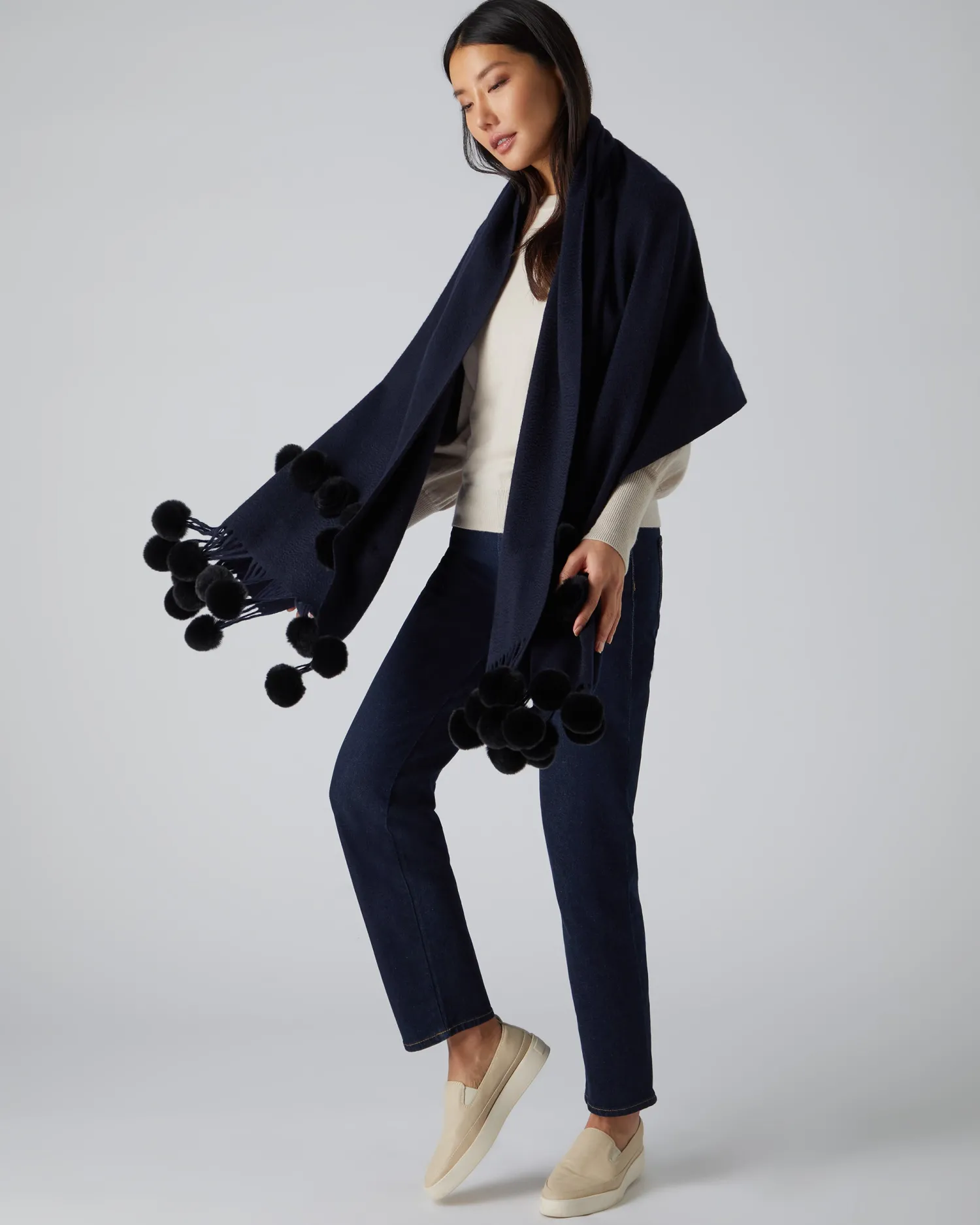 Envelop yourself in luxury – here we see the fur bobble woven shawl. 100% Mongolian Cashmere with Rex Fur trim – N.Peal classic woven shawl – Embellished with navy blue Rex fur bobbles – Makes an amazing gift- Care: Dry Clean OnlynFind our full range of Women’s Cashmere Scarves here.