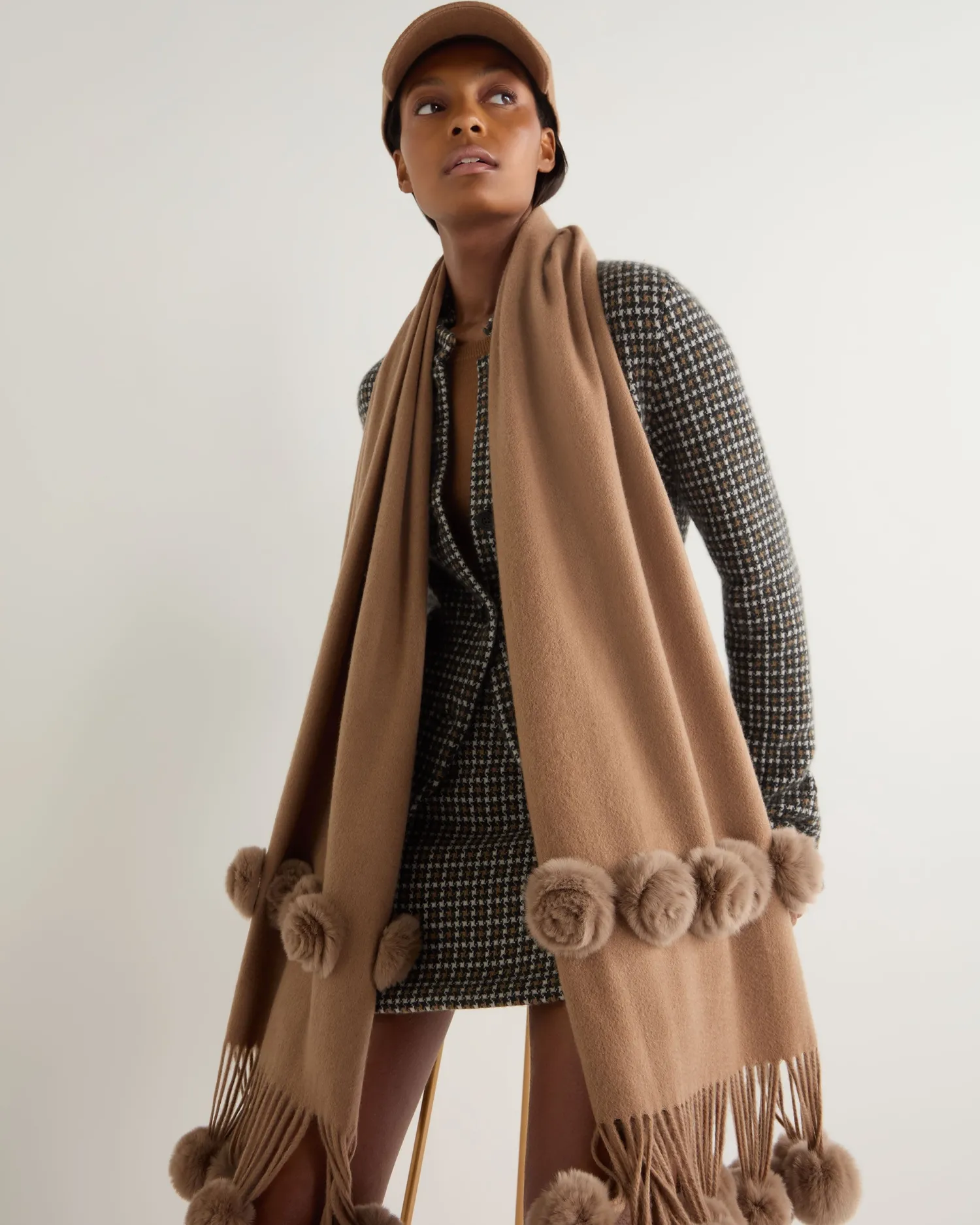 Envelop yourself in luxury – here we see the fur bobble woven shawl. 100% Mongolian cashmere with Rex fur trim – N.Peal …