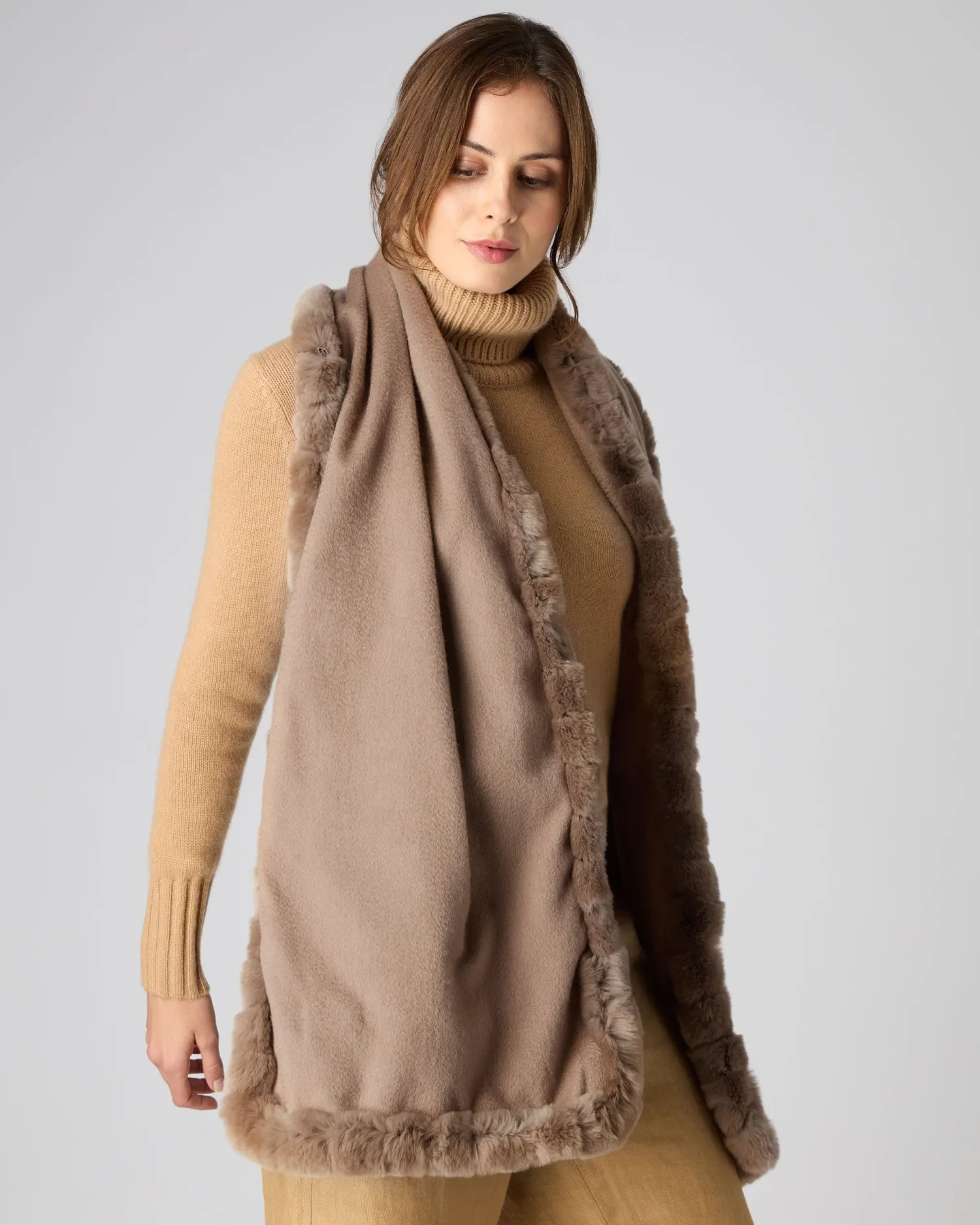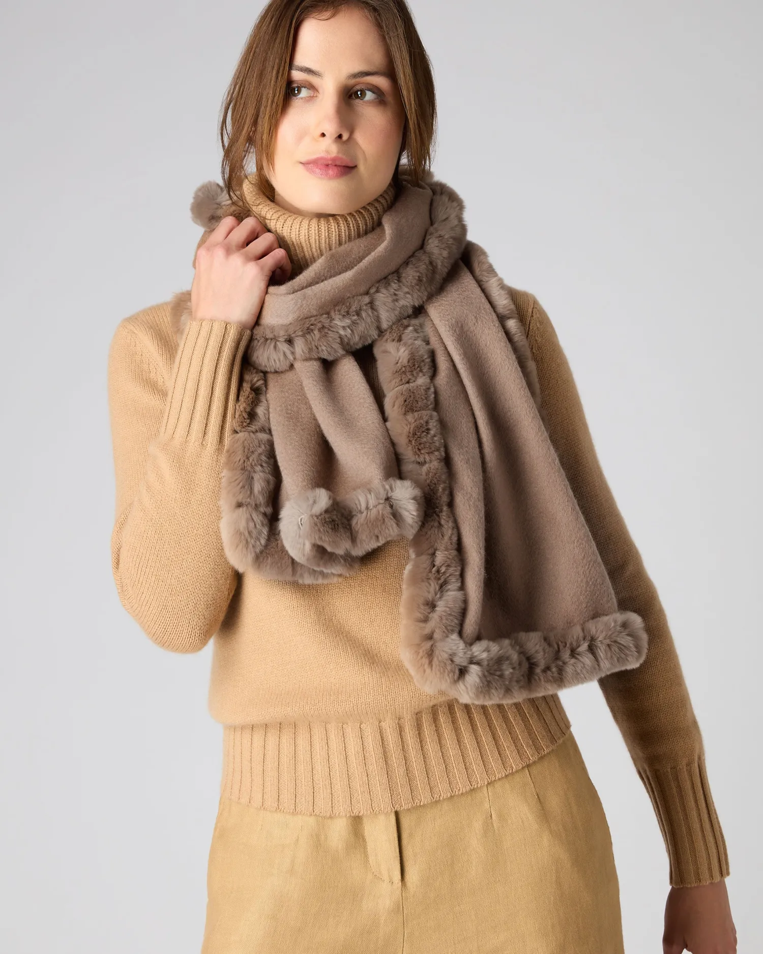 Luxury is personified here in our woven cashmere scarf with Rex fur trim to all sides. 100% organic Mongolian Cashmere body with wrap around dark tan Rex fur – Measures 180×37.5cm – Fabulous worn casually with jeans – Great worn with a smarter outfit – Beautiful versatile N.Peal style – Would make a wonderful gift – Care: Dry Clean Only