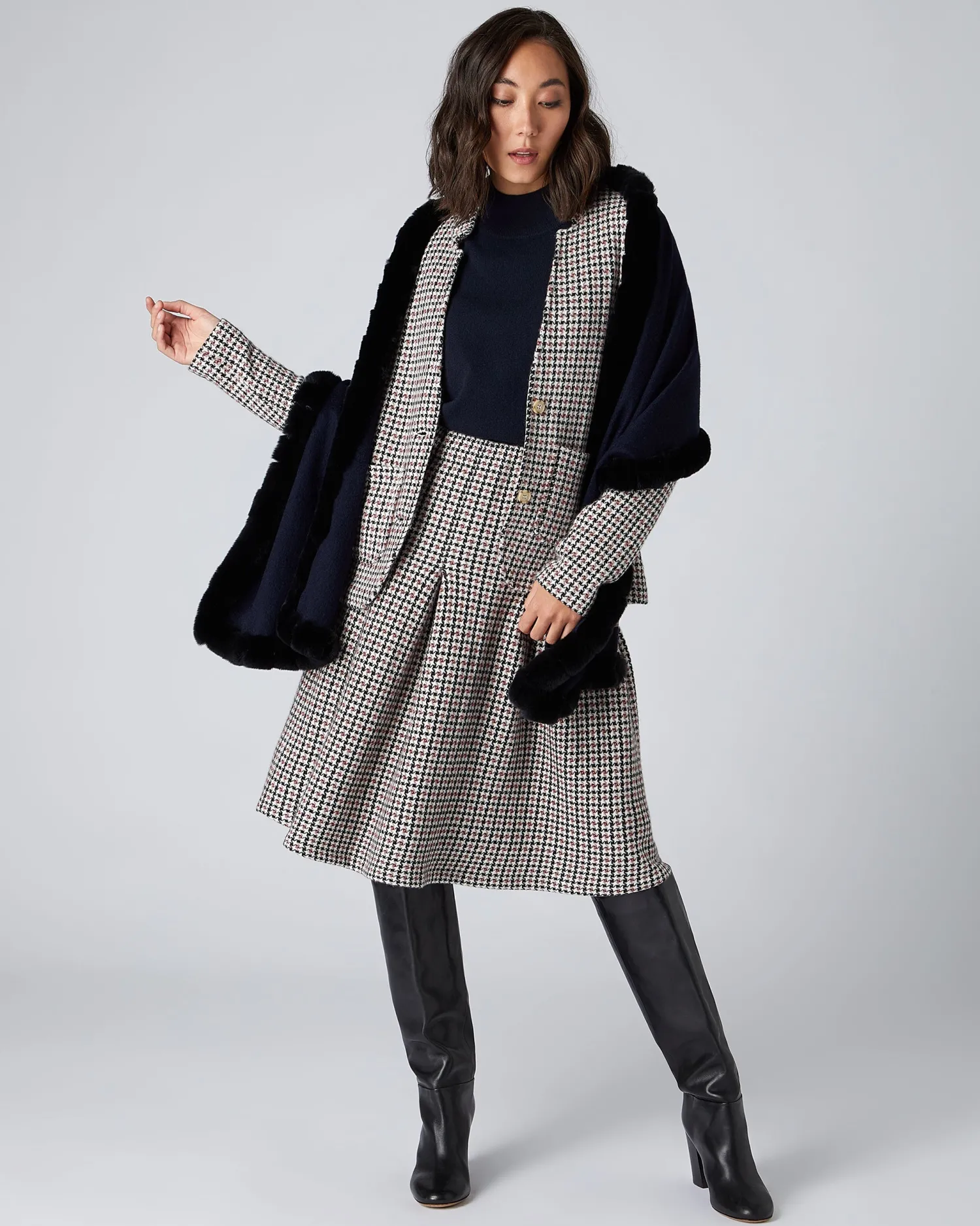 Luxury is personified here in our woven cashmere scarf with Rex fur trim to all sides. 100% Mongolian Cashmere body with wrap around navy blue Rex fur – Measures 180×37.5cm – Fabulous worn casually with jeans – Great worn with a smarter outfit – Beautiful versatile N.Peal style – Would make a wonderful gift- Care: Dry Clean Only