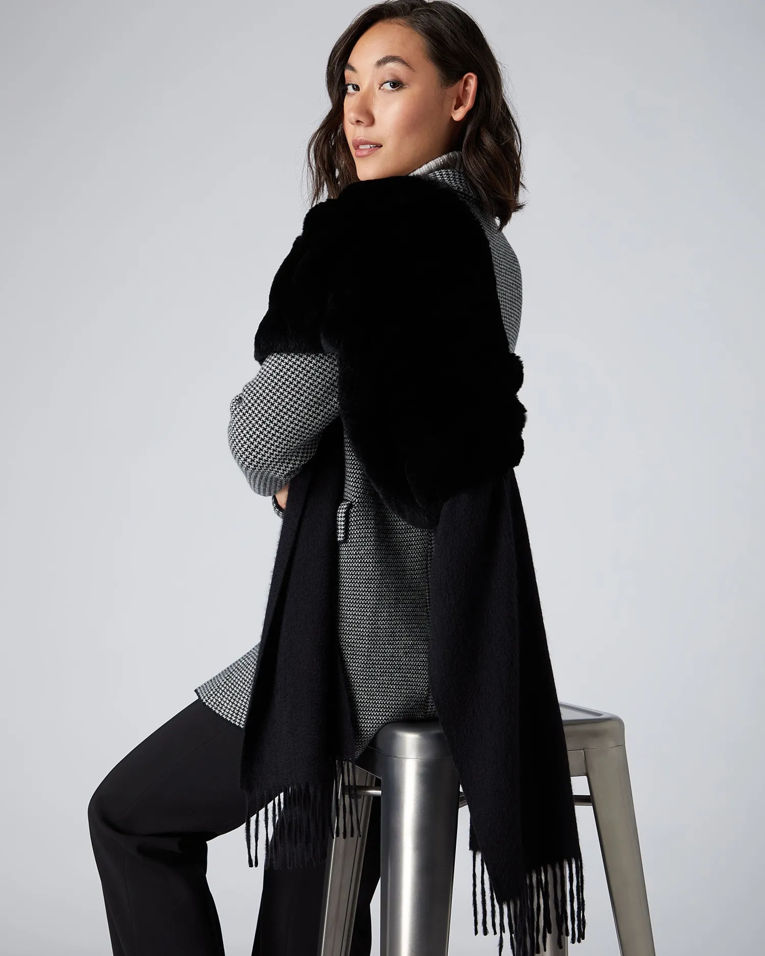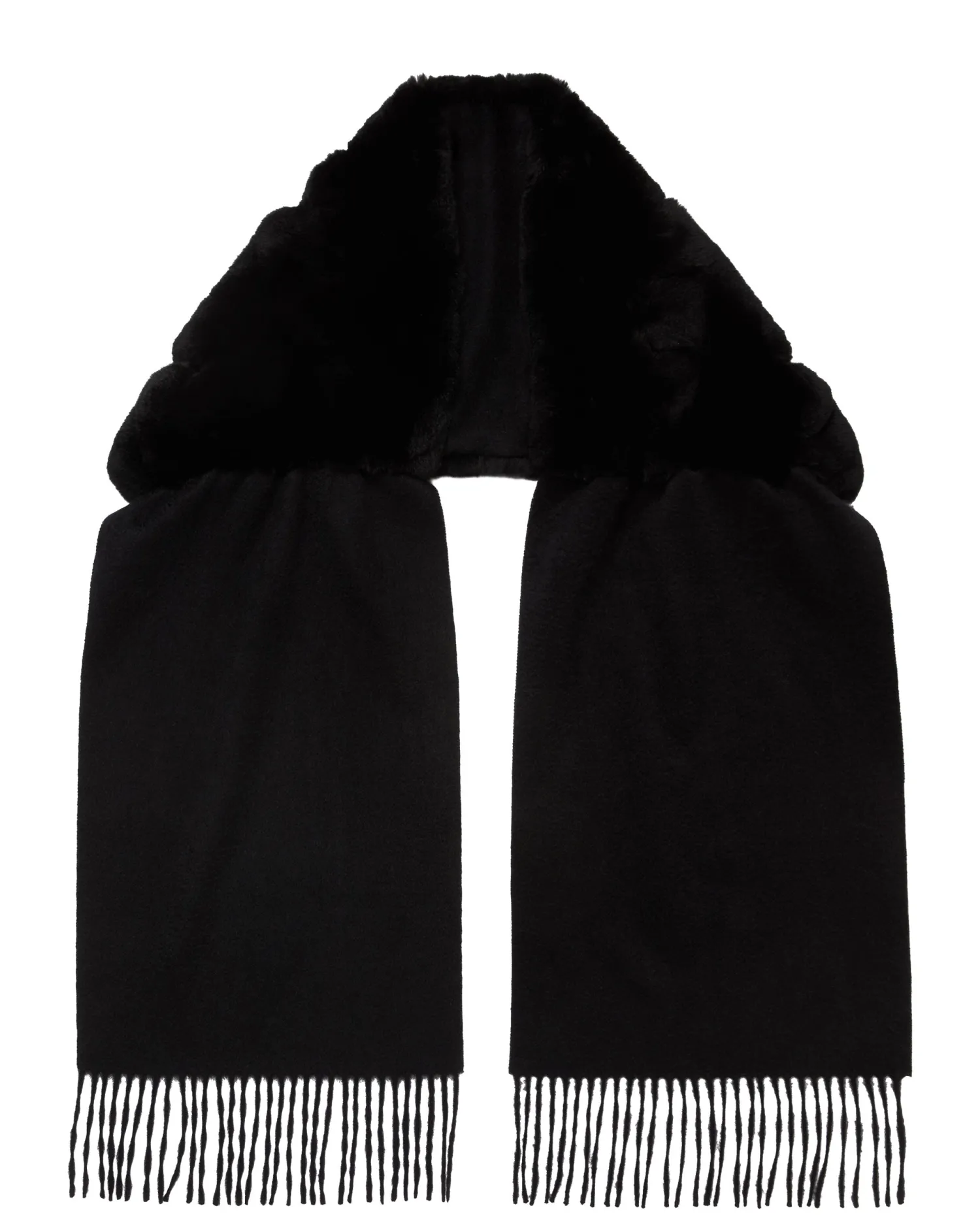 A super soft and deep pile Rex rabbit fur scarf. 100% Mongolian Cashmere with black Rex Fur trim – Woven scarf – Deep pile fur attached by hand – Fur ‘ripple’ look via small incisions – Popular style in great colourways- Care: Dry Clean Only