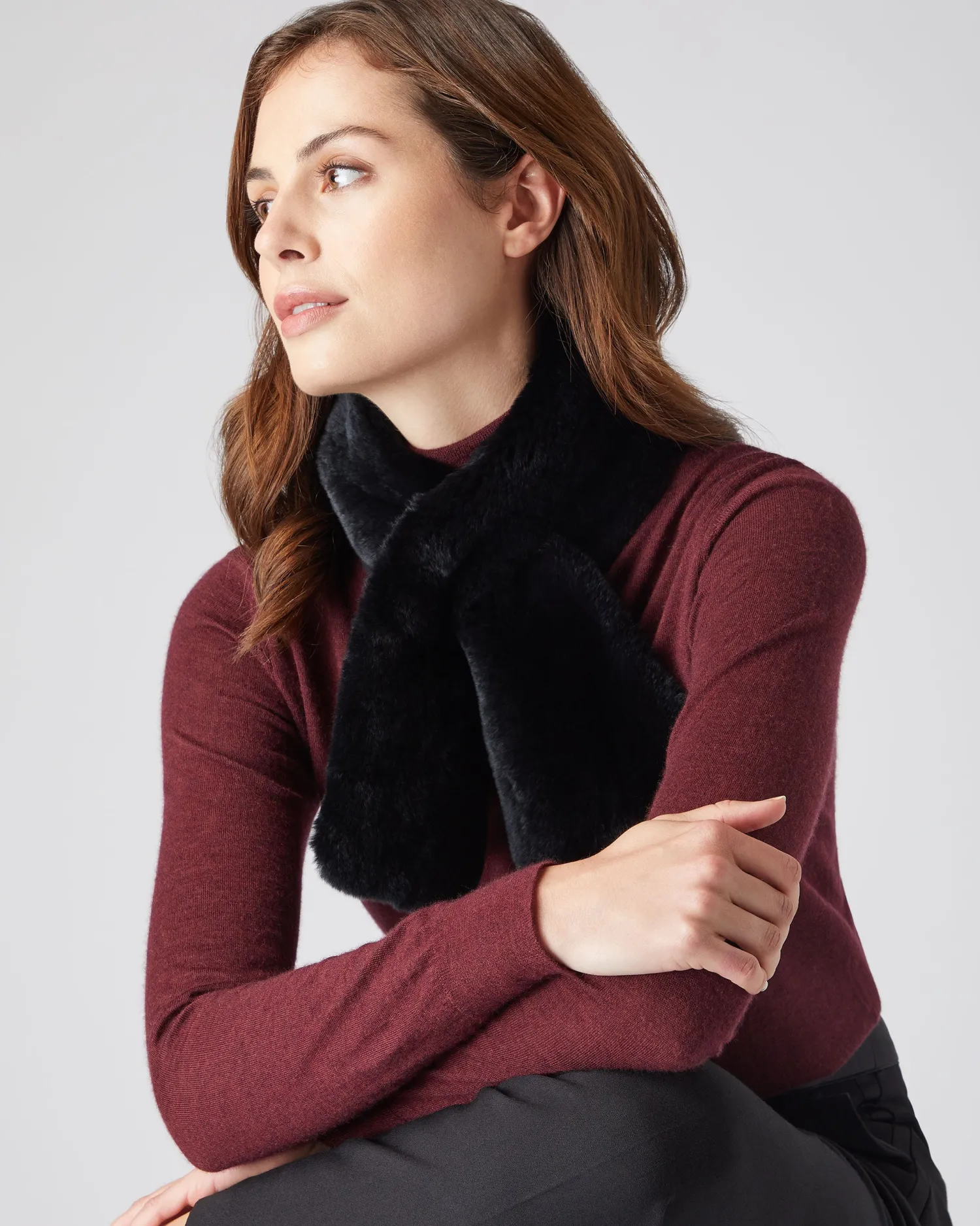 A firm favourite amongst the N.Peal audience – the Rex fur neck warmer. Made from supersoft black Rex fur with a 100% Mongolian cashmere reverse in a ribbed stitch – Welcome addition to any wardrobe – Available in a lovely colour selection – Hidden slit to wear the neck warmer in a crossover style – Cosy, comfortable and warm – Care: Dry Clean Only