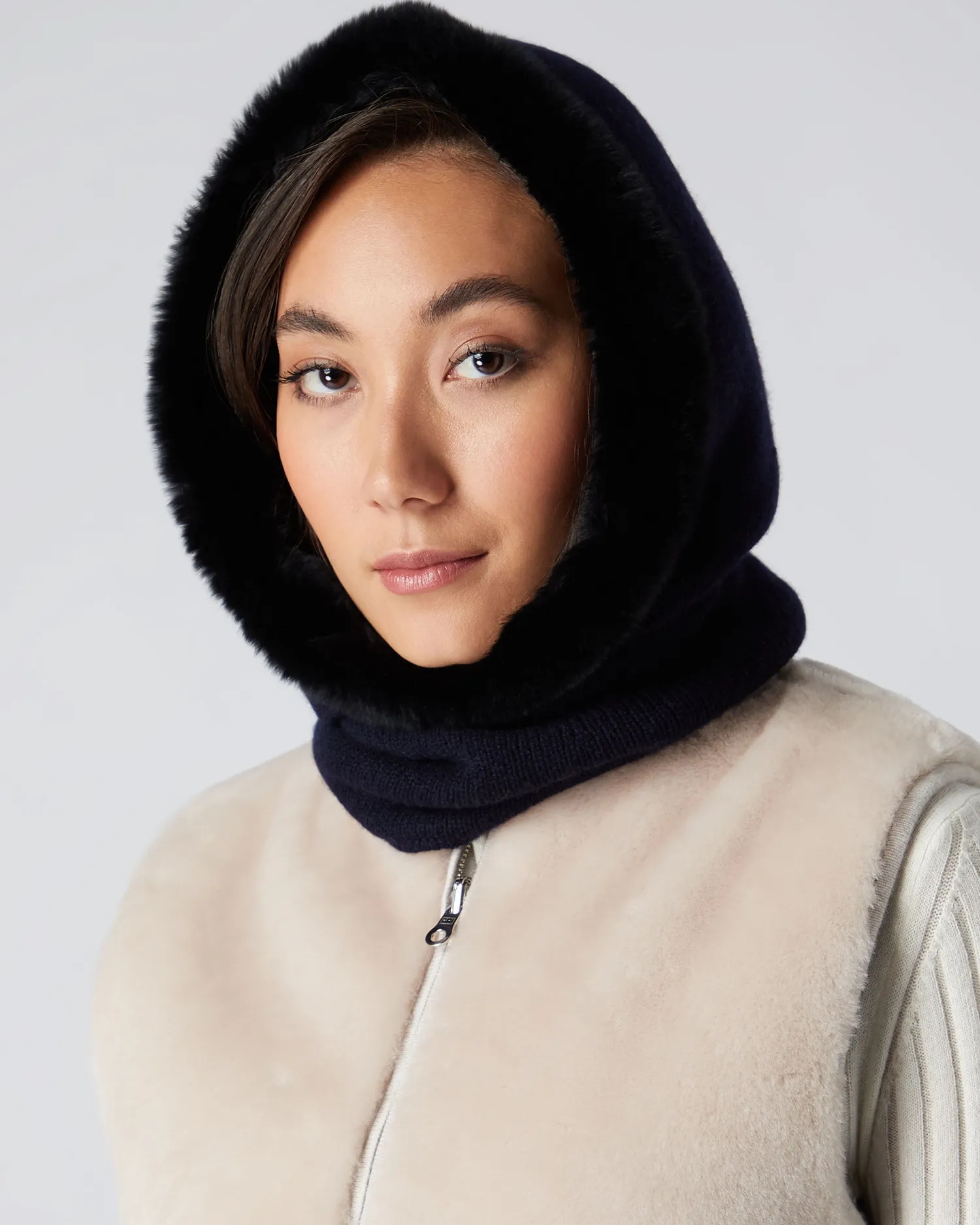 A wonderful and super soft ski hood, suitable for all outdoor occasions. Made from 100% Mongolian Cashmere with navy blue Rex fur trim – Hood style to wear with any outfit – Would make an interesting gift- 2Ply- Care: Dry Clean Only