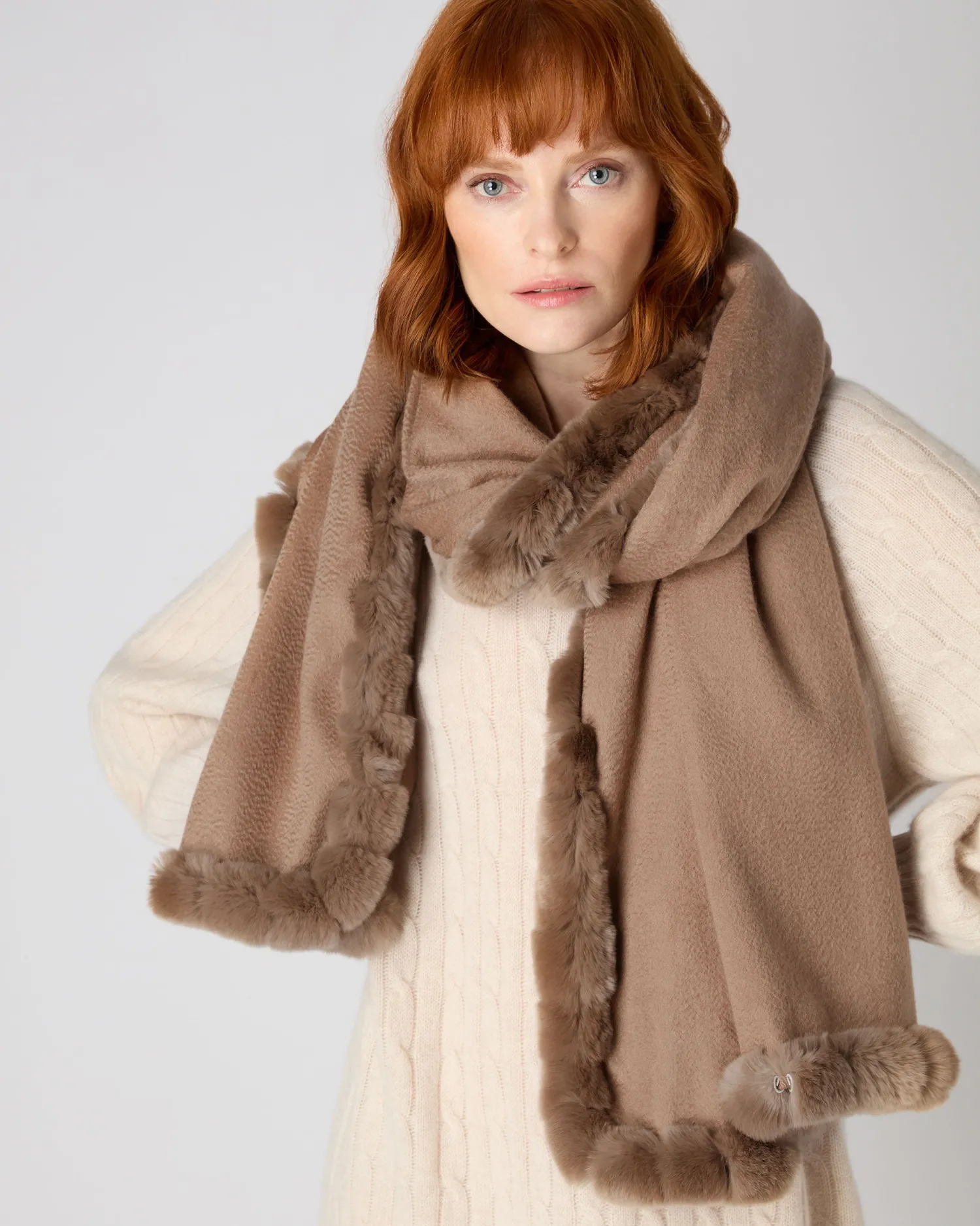 Wrap yourself in the sheer luxury of a trim woven shawl. Made from 100% Mongolian Cashmere with Rex fur trim – Generously sized at 200x75cm – Dark tan Fur trim around all edges – Can be worn casually with jeans or dressed up – Would make a fabulous gift – Care: Dry Clean Only