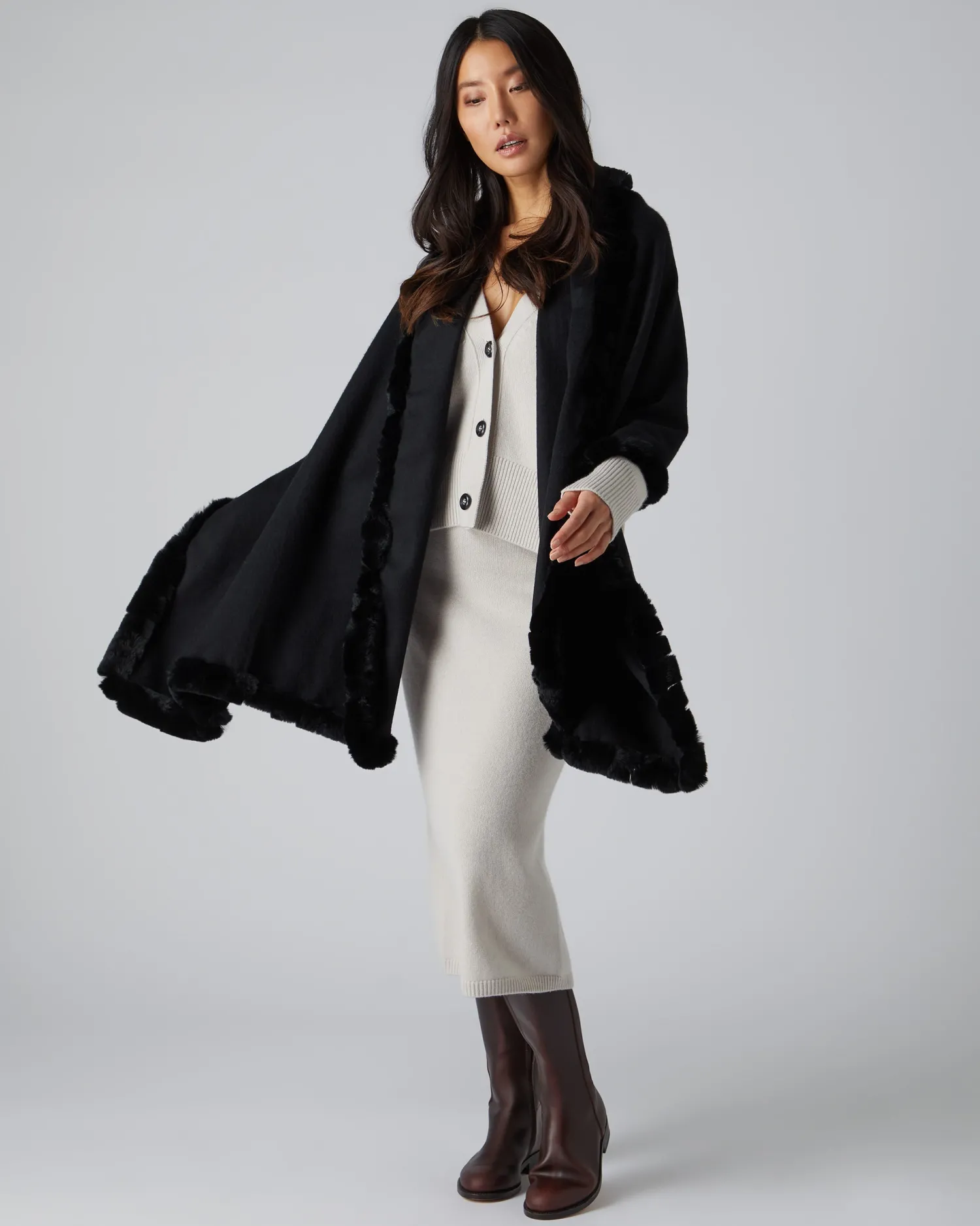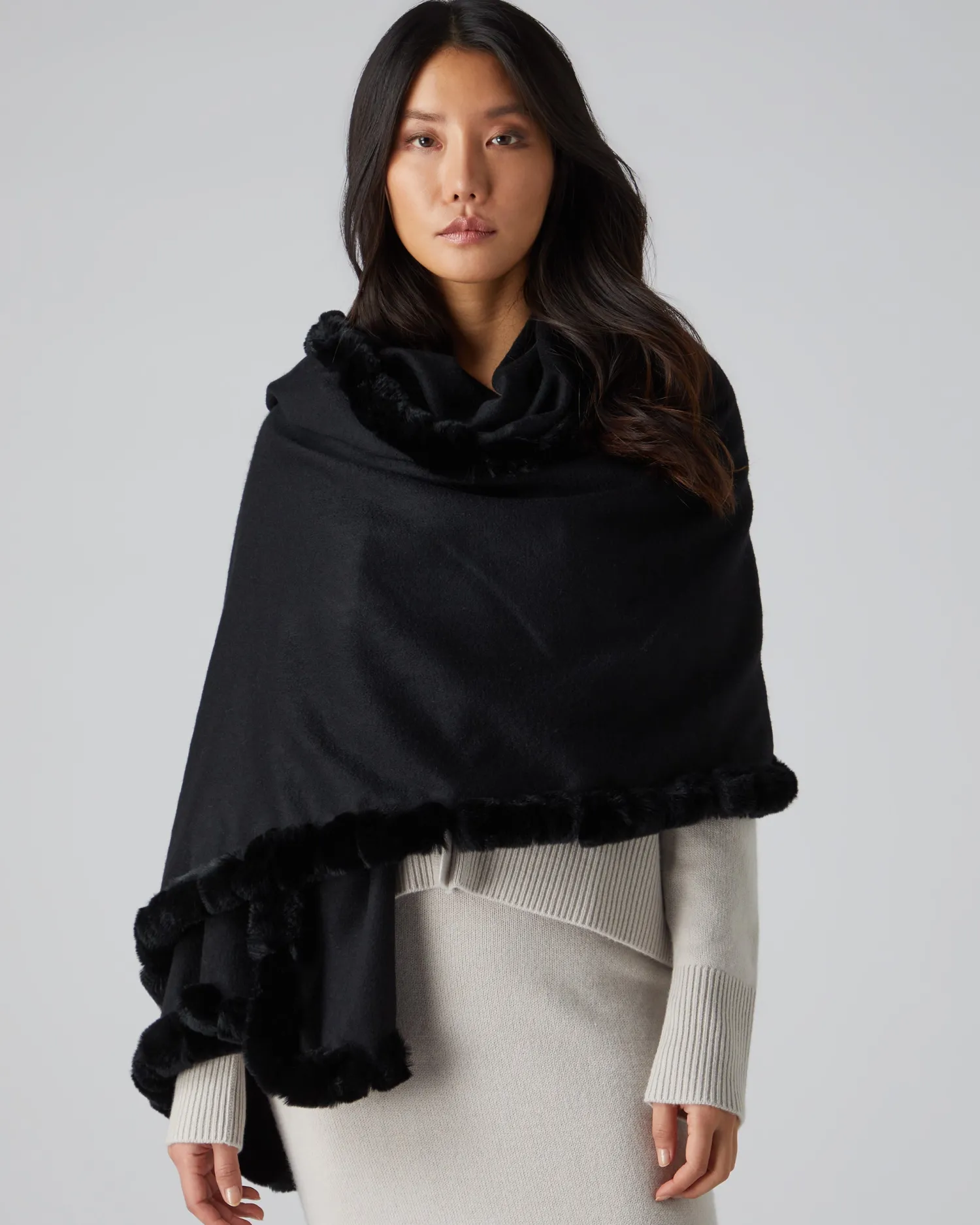 Wrap yourself in the sheer luxury of a fur trim woven shawl. Made from 100% Mongolian Cashmere with Rex Fur trim – Generously sized at 200x75cm – Black fur trim around all edges – Can be worn casually with jeans or dressed up – Would make a fabulous gift- Care: Dry Clean OnlynFind our range of Cashmere Pashminas, Wraps and Shawls here.