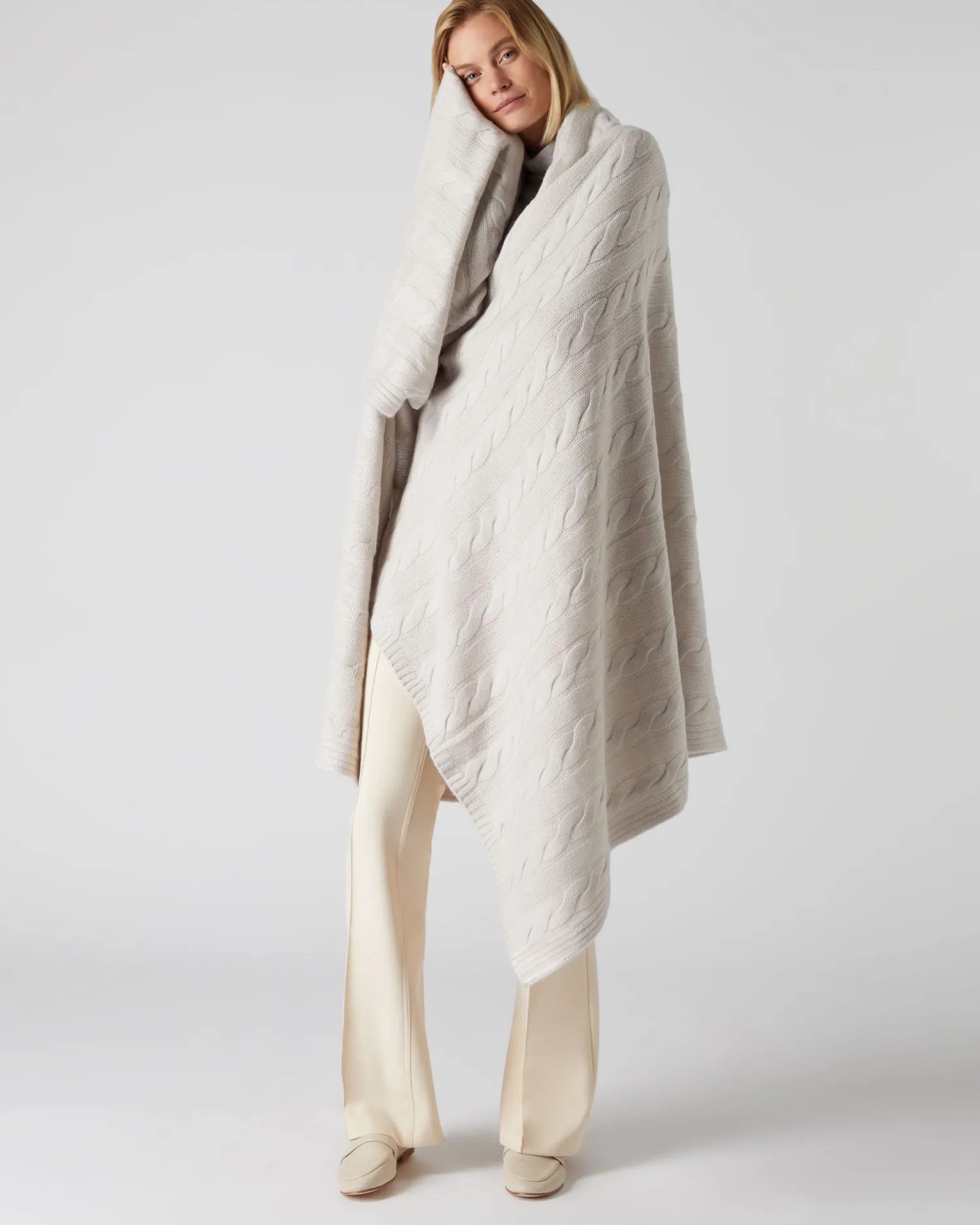 The wow factor for your bed or sofa – a cable cashmere throw. n Made from 100% Mongolian Cashmere Beautiful cable pattern knit Perfect over a sofa or across a bed Measures 177x122cm – Care: Hand Wash