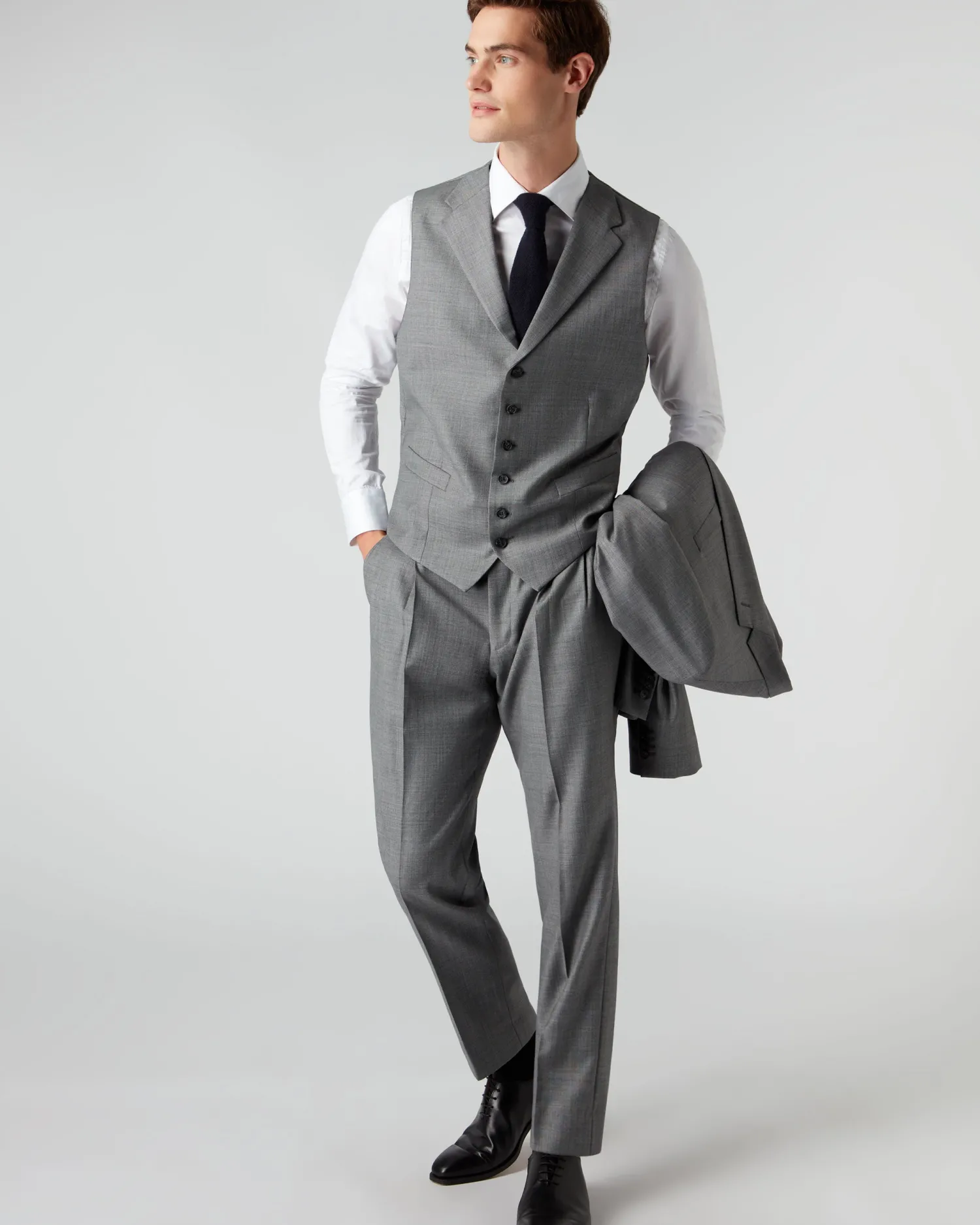 A first for N.Peal, but an obvious choice as worn so elegantly by Bond in GOLDFINGER (1964).- Made from 100% Wool, woven expertly for a fine finish – Exquisite detailing to reflect the original worn in the movie- Available only as a full 3 piece suit – jacket, trouser and waistcoat- Jacket: single breasted, relaxed fit, grey viscose satin lining, two button fastening, notch neck lapel, central back vent, interior pockets, front flap and ticket pockets, four buttons on each sleeve- Trouser: slim leg, double pleated front, slanted side pockets, back jetted pockets, regular rise, zip fly, belt loops, unfinished leg length so they can be altered, waistband suitable for alteration- Waistcoat: single breasted, six button fastening, grey viscose satin lining, notch neck lapel, welt pockets, standard back strap with buckle adjuster- This style will be delivered in a suit carrier instead of our bespoke Bond packaging, this is to ensure the product arrives with you in the best possible condition- Model is wearing size 42 suit (size 42 jacket and waistcoat, size 36 trouser)- Care: Dry Clean OnlynInspired by the scene in GOLDFINGER (1964) where after narrowly avoiding death by high powered laser at the hands of GOLDFINGER, a drugged Bond wakes to find himself on GOLDFINGER’S private jet where he meets the pilot, Pussy Galore.n007 and related James Bond Indicia © 1962-2024 Danjaq and MGM. 007 and related James Bond Trademarks are trademarks of Danjaq. All Rights Reserved.