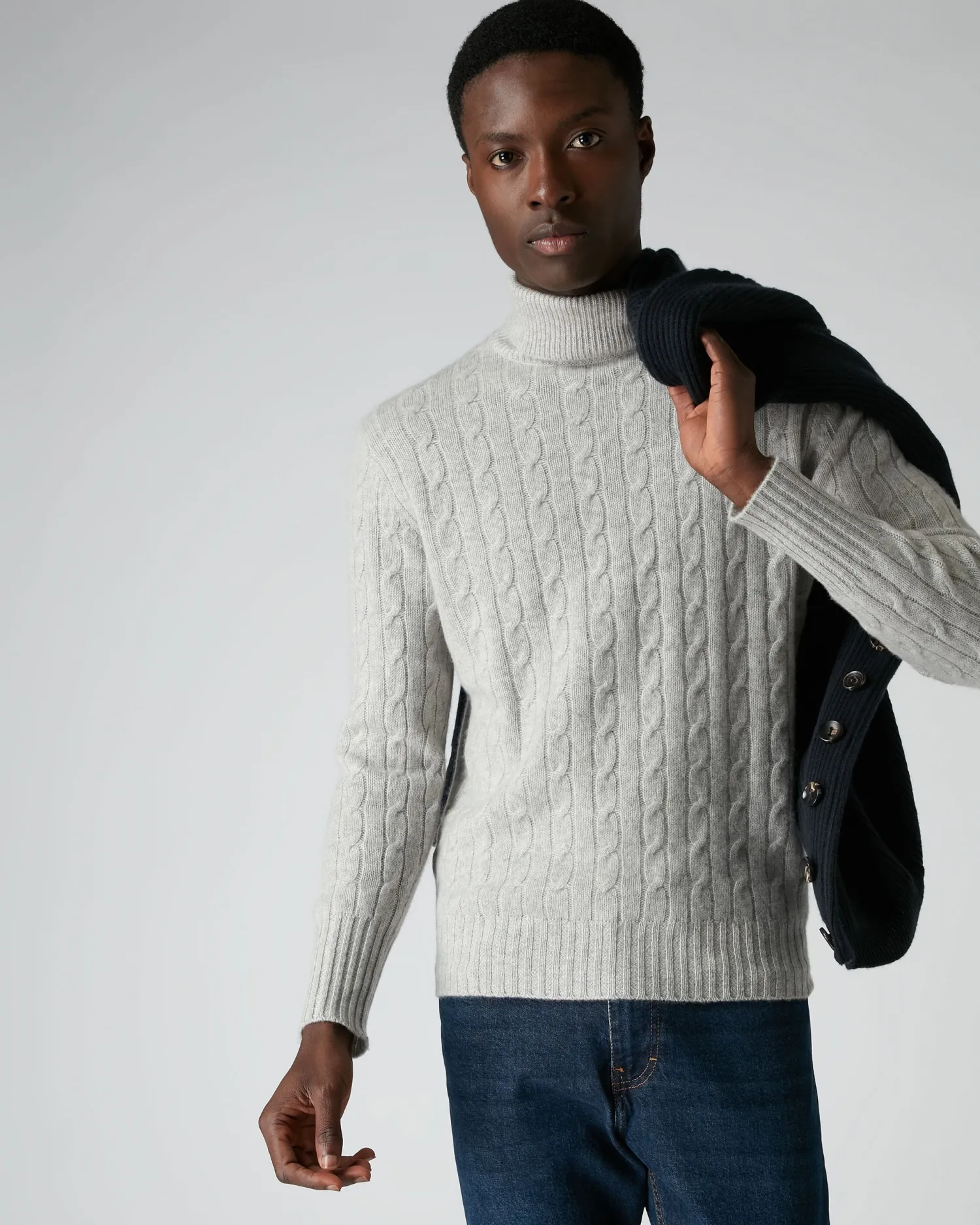 This fabulous 100% Mongolian cashmere cable roll neck is super stylish and truly luxurious in fumo grey, as worn by Bond in SPECTRE (2015).- 100% Mongolian Cashmere- Cable knit pattern- Ribbed roll neck- Matching rib on hem and cuffs- Model is wearing size Medium- Care: Hand WashWorn by Bond when he visits the remote Austrian cabin where he believes his old nemesis Mr. White to reside, hoping to unravel the clue which untangles the web of Spectre, in the film of the same name. Designed specifically for 007 in SPECTRE (2015).n007, James Bond and related James Bond Indicia © 1962-2024 Danjaq and MGM. 007, James Bond and related James Bond Trademarks, TM Danjaq. All Rights Reserved. us.007Store.com