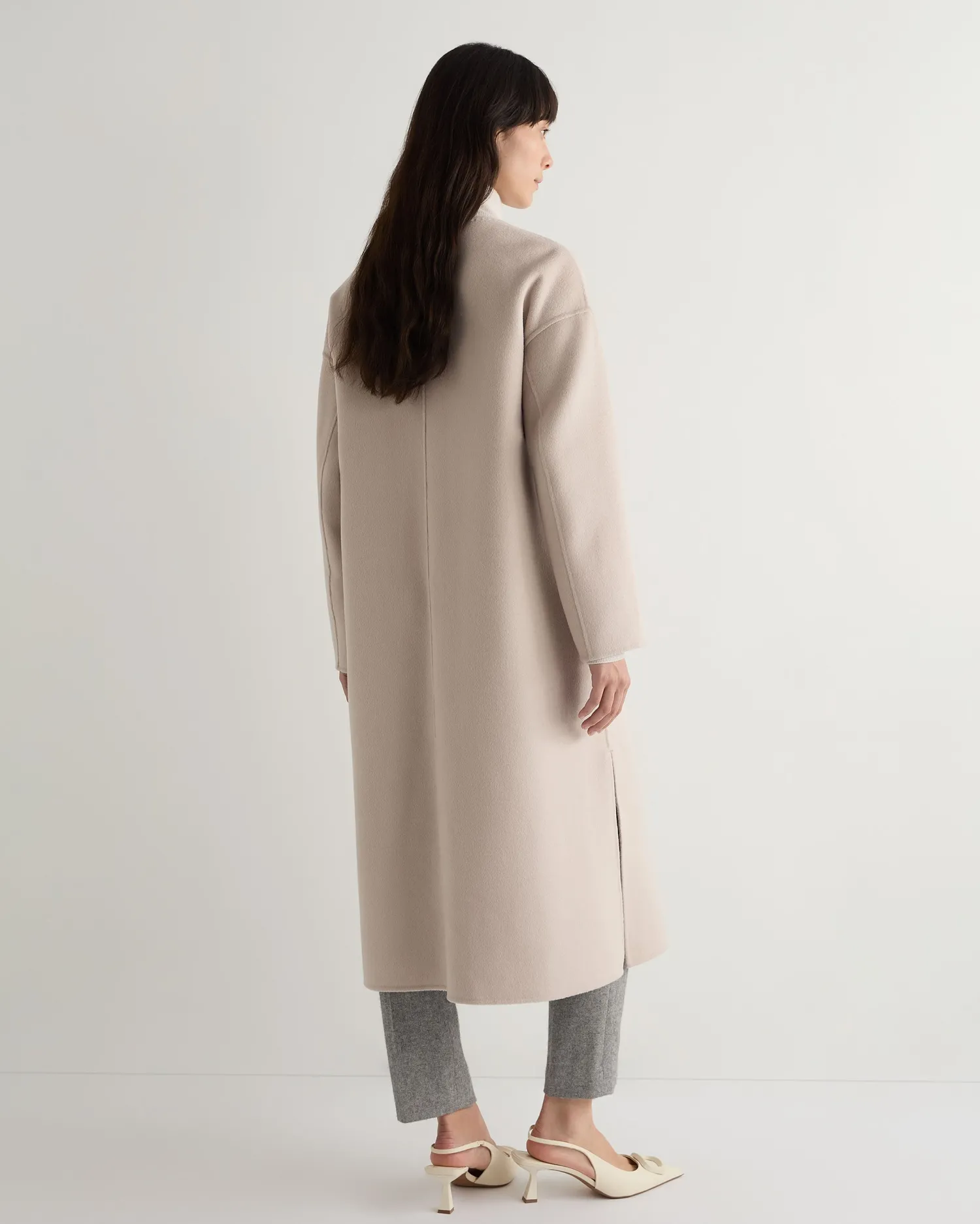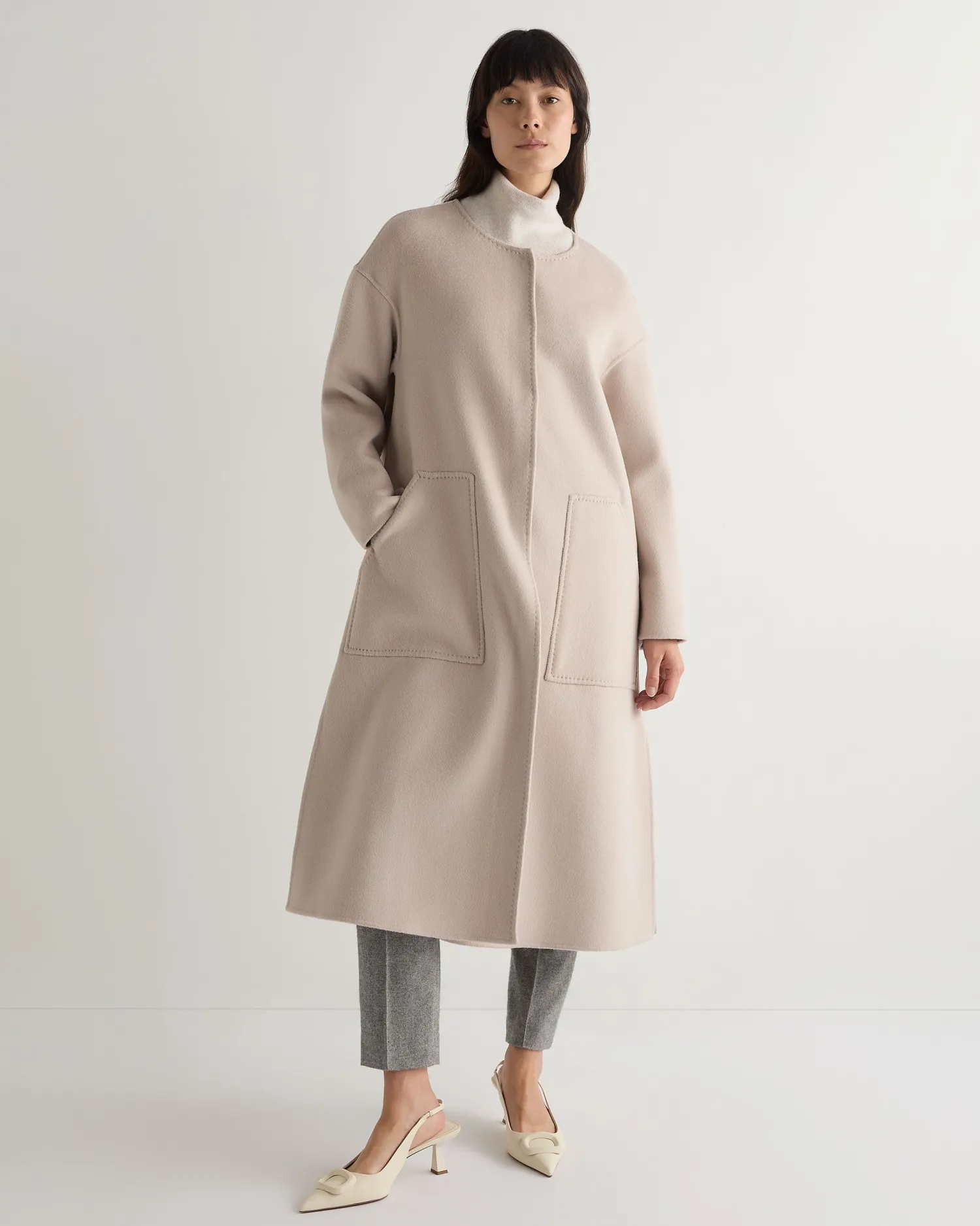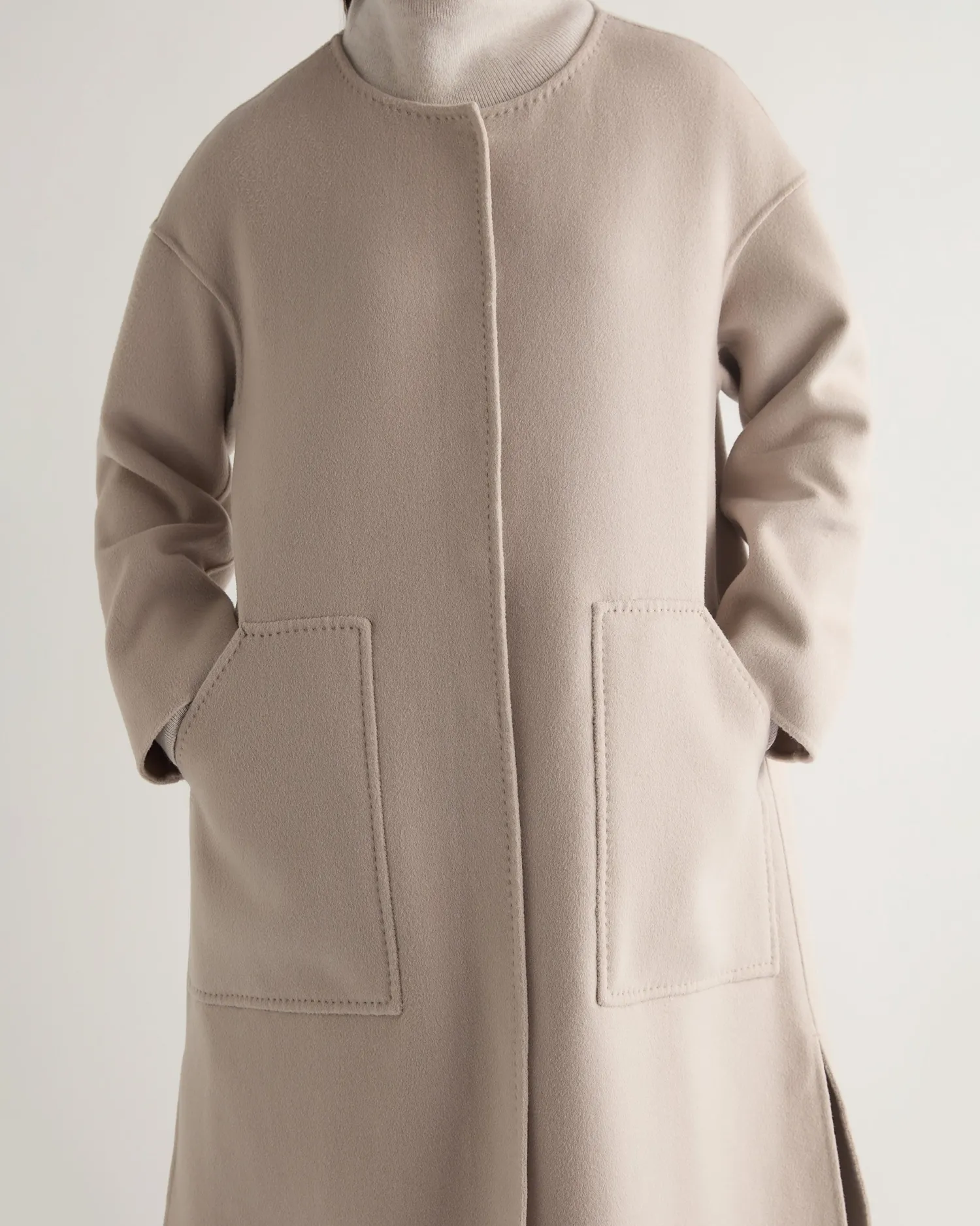 Our new round neck woven coat is a masterpiece of timeless elegance and contemporary design. Made from 70% wool, 20% silk and 10% Mongolian cashmere – The most perfect coat for colder weather – The longline silhouette provides a flattering fit – Perfect for both casual and formal occasions – Ideal for layering over a sweater in cold weather – Model is wearing size Small – Care: Dry Clean Onlyn