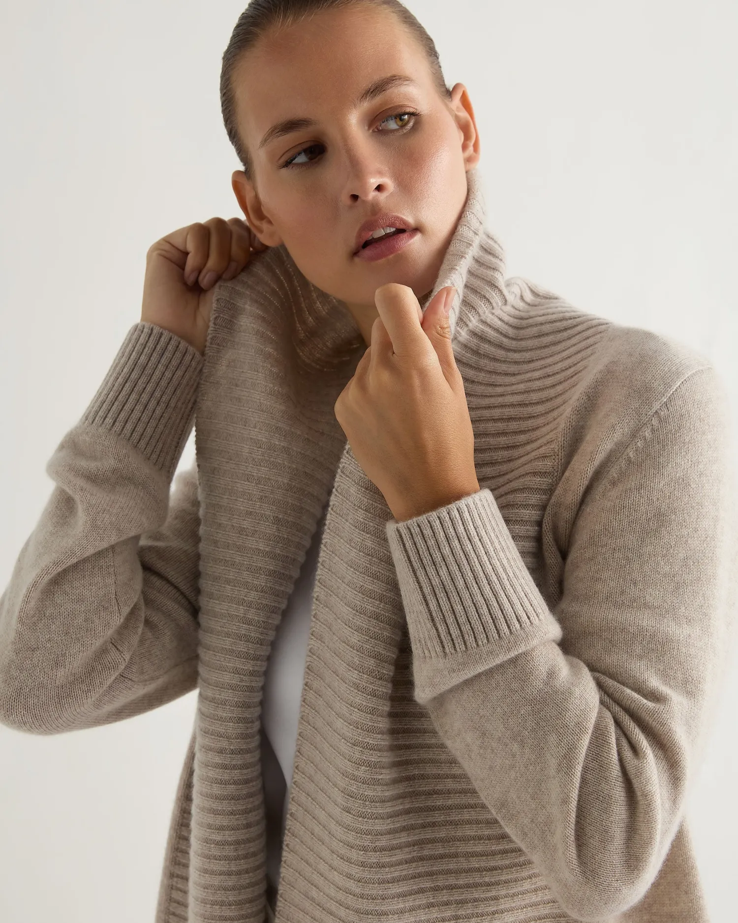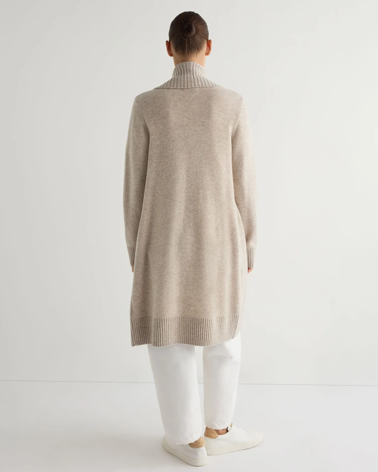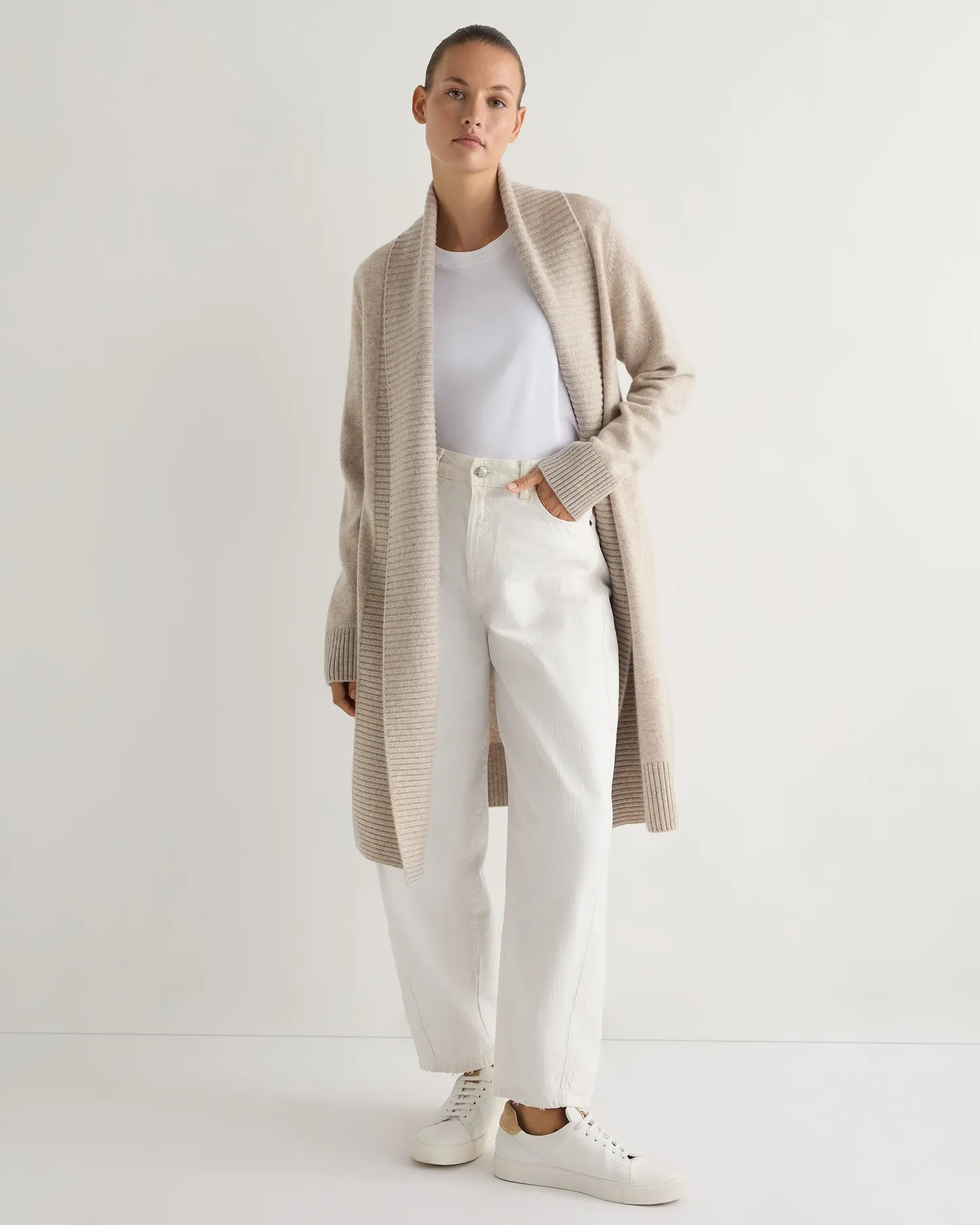 A new longer line cardigan with strong detailing, perfect for layering. Made from 100% organic Mongolian cashmere of the highest quality – Shawl collar style, comfort and warmth guaranteed! – Smart wide rib detailing on the edge to edge plackets with matching hem and cuffs – Great worn loose or can be belted for a modern twist – 3ply – Model is wearing size Small – Care: Hand Wash Organic cashmere: organic dyes and detergents, free from fertilizer and pesticides, find out more here