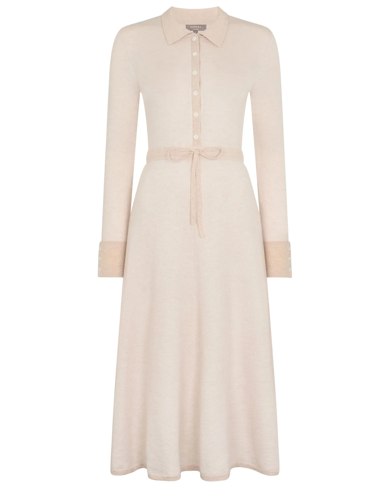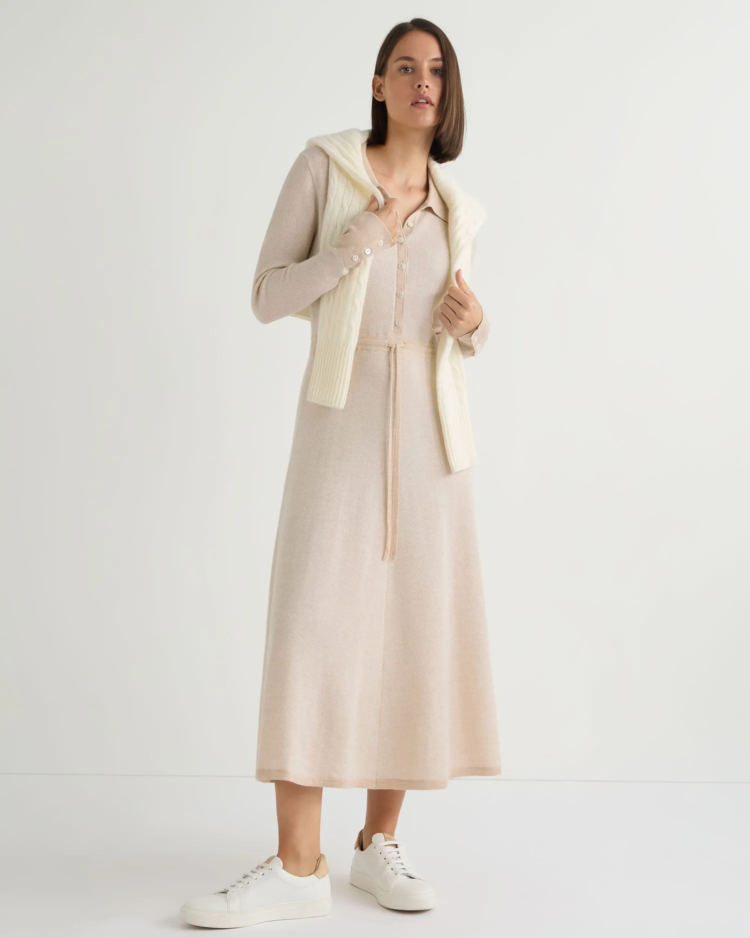 Our favourite dress design in a super elegant new colourway. – Made from our signature blend of 70% cashmere and 30% silk- In a beautiful sandstone brown and new ivory white Birdseye design – Elegant polo collar style dress with gentle drawstring waist – Sensationally soft against the skin, delightful to wear – 1ply- Model is wearing size Small – Care: Dry Clean Onlyn