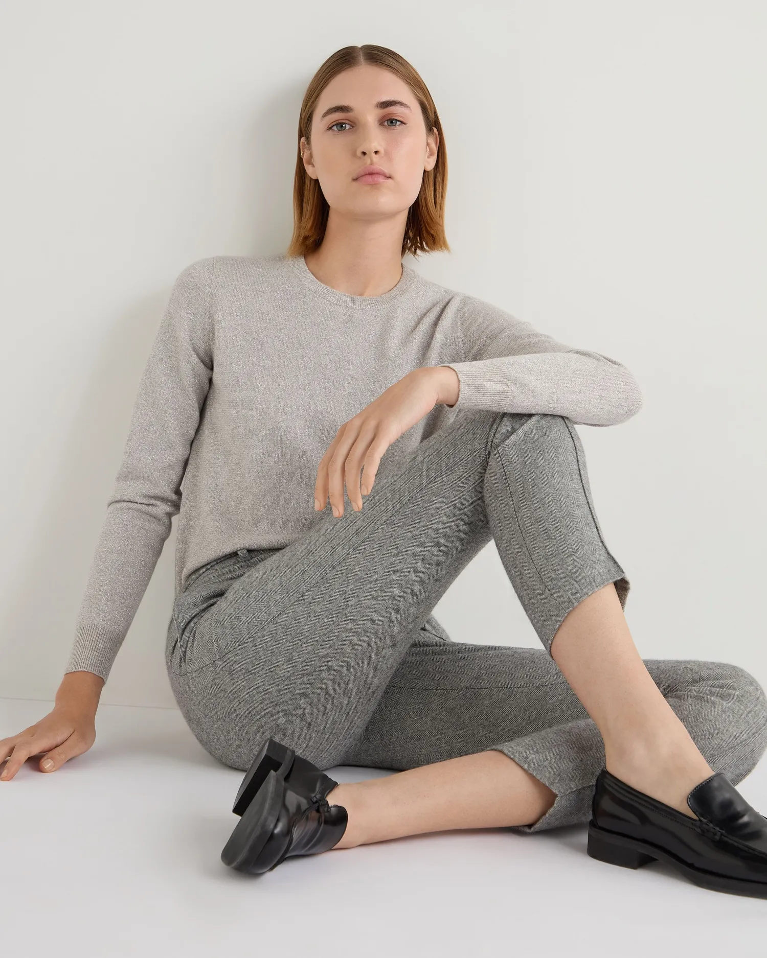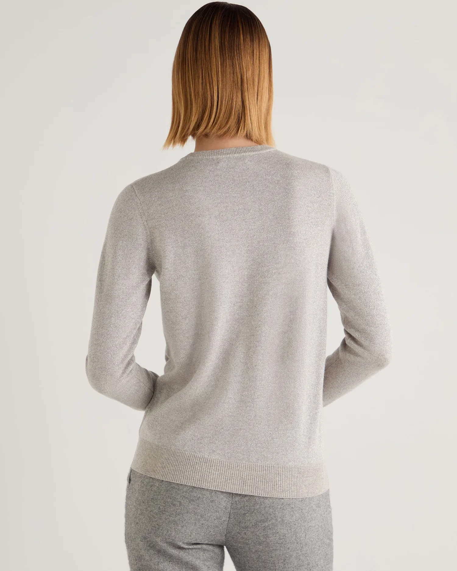 Our classic cashmere round neck sweater available in lovely shades and now with added Lurex.n 92% Mongolian cashmere 8% Lurex Elegant round neck style Wardrobe staple Luxuriously soft Perfectly cut Neat trim finishing Fabulous colour selection 1ply Model is wearing size Small Care: Hand Wash
