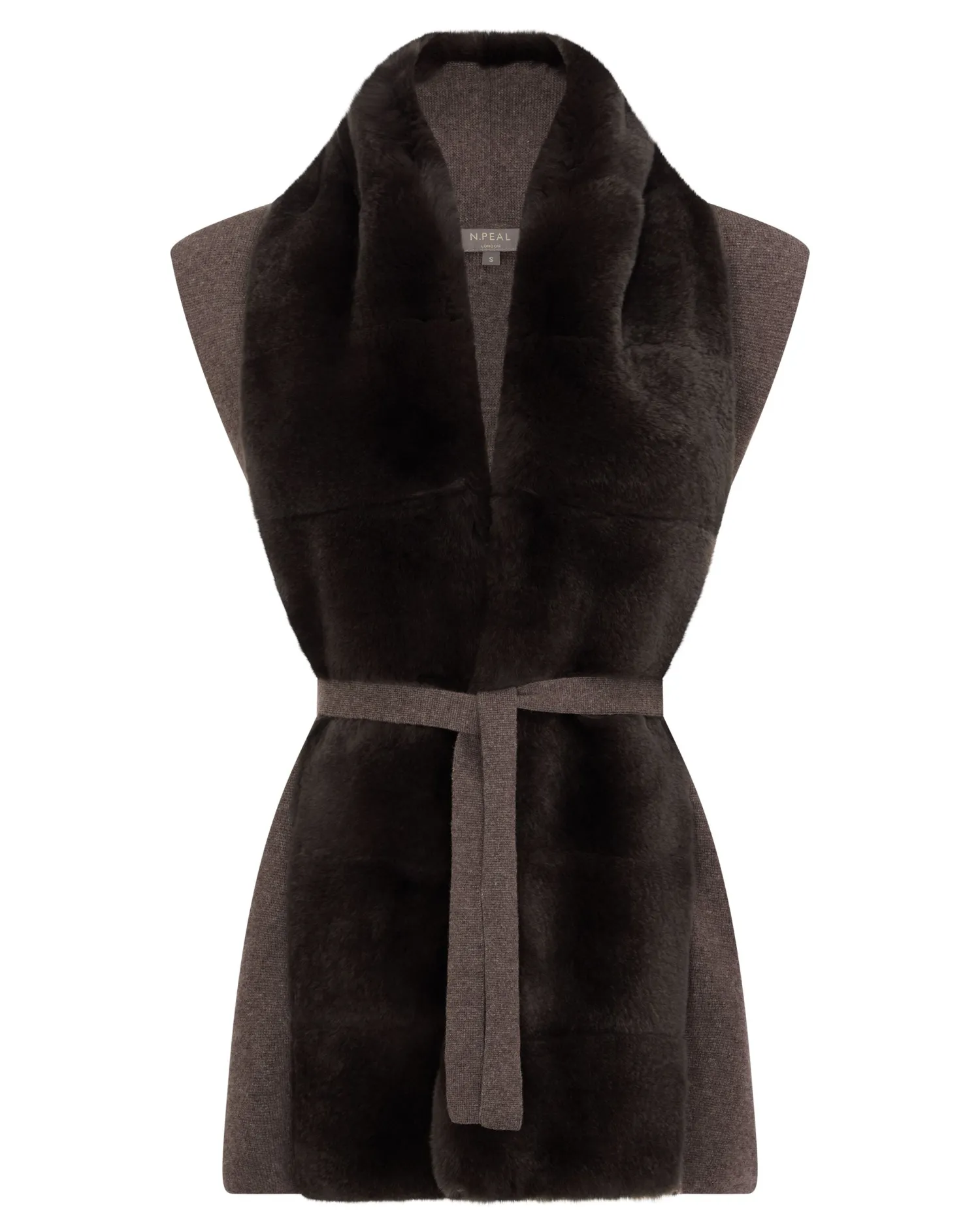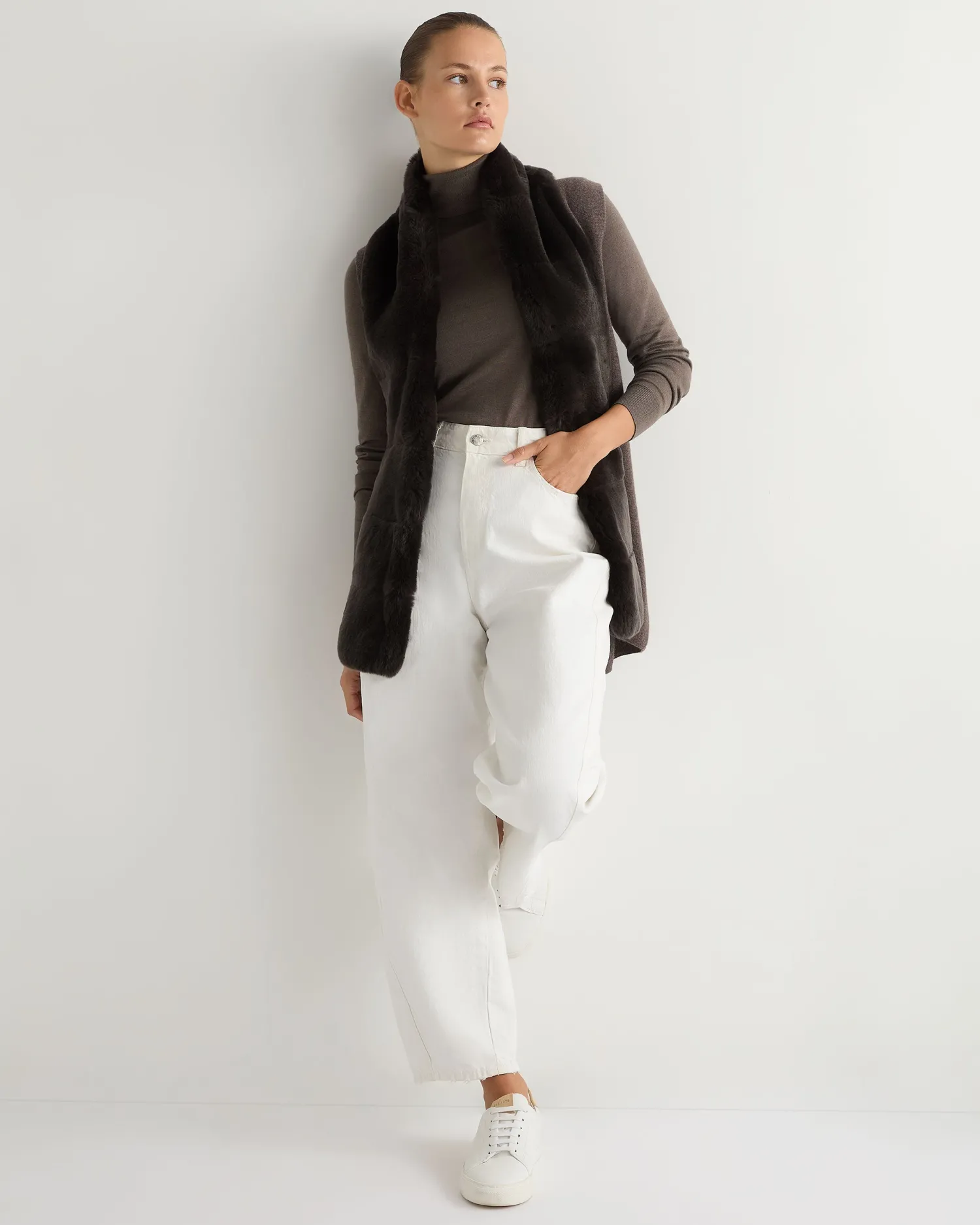This popular style combines Milano stitch and fur trim – surely the perfect gilet? 100% Mongolian cashmere with Rex fur trim – Milano stitch cashmere for texture – Dark brown Rex rabbit fur placket trim – Stylish and flattering – 1ply – Model is wearing size Small – Care: Dry Clean Only