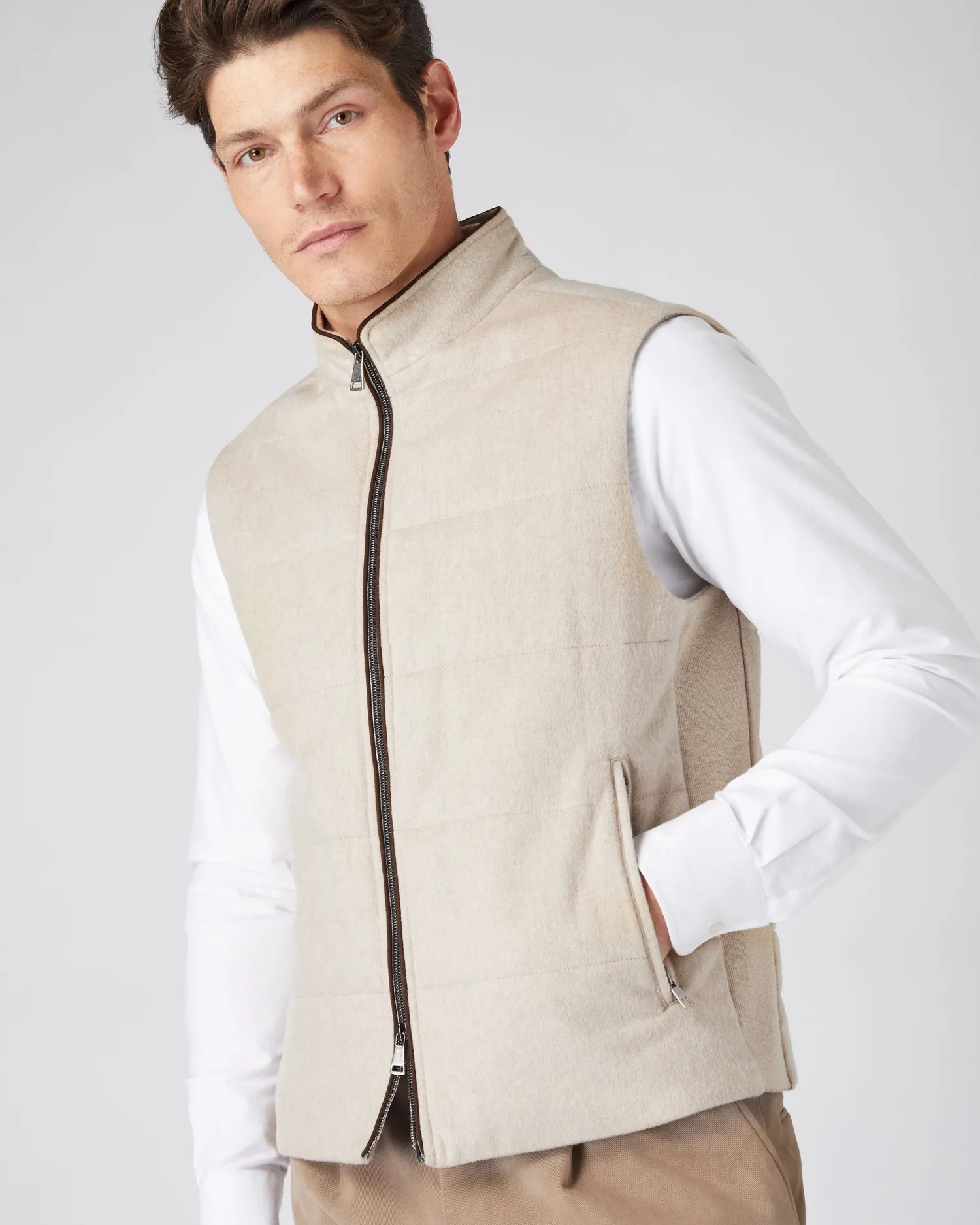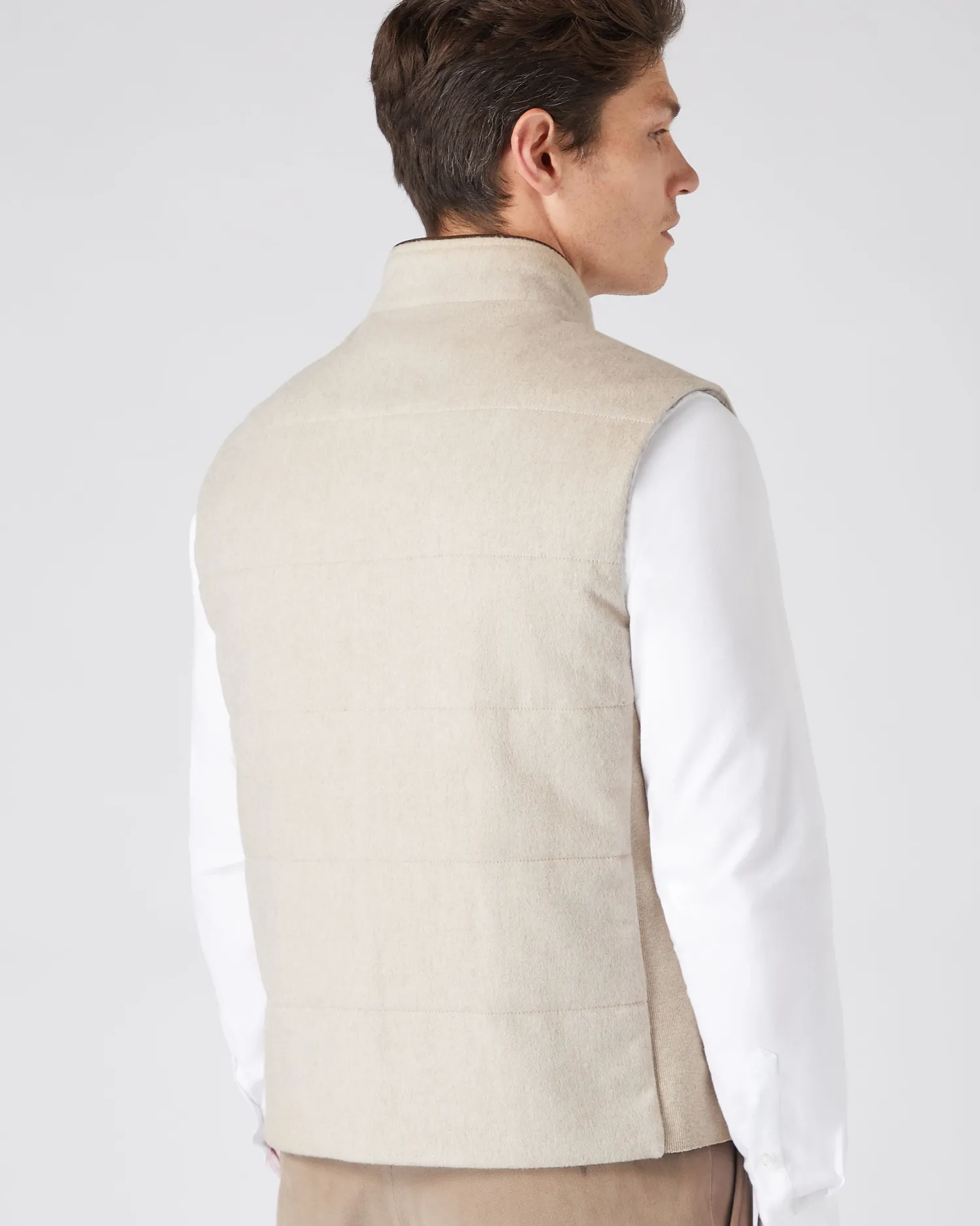 A classically fitted gilet with flattering silhouette and noteworthy knitted details in our lightweight Belgravia cashmere gilet. The addition of a thin bonded layer with our London Weather Systemâ„¢ enhances protection from the elements without compromising breathability. Made from 100% Mongolian cashmere woven fabric body with 100% wool side panels- Two way zip and zip up side pockets – Subtle horizontal stitch design – Contrast piping – Knitted side panel for comfort and stretch – Model is wearing size Medium – Care: Dry Clean Only