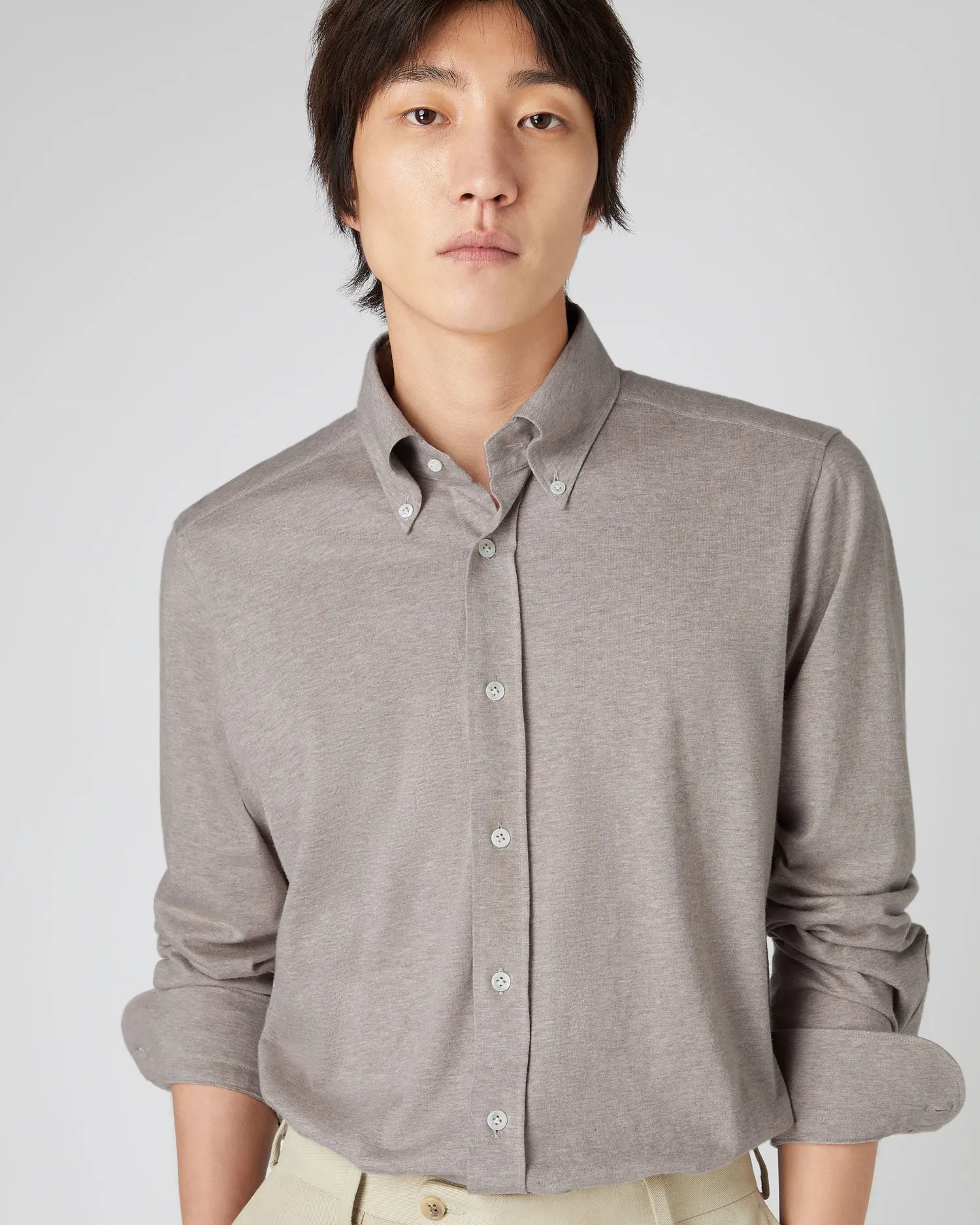 Introducing our Men’s jersey stretch shirts in a cotton cashmere blend with an 85%/15% mix. Unlike a traditional woven shirt with no ‘give’, our Jersey shirts are created on circular knitting machines, providing a natural stretch, ultimately delivering an incredibly comfortable wear, not normally associated with a shirt.nFeaturing an ‘Italian’ button down collar which creates an elegant roll to its shaping. A true wardrobe cornerstone, strong enough when paired with our trousers or layer under your favourite N.Peal knitwear for ultimate elegance.nModel is wearing size Medium.Care: Dry Clean Only.