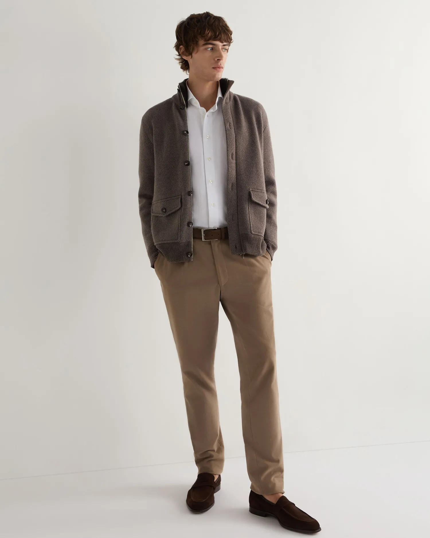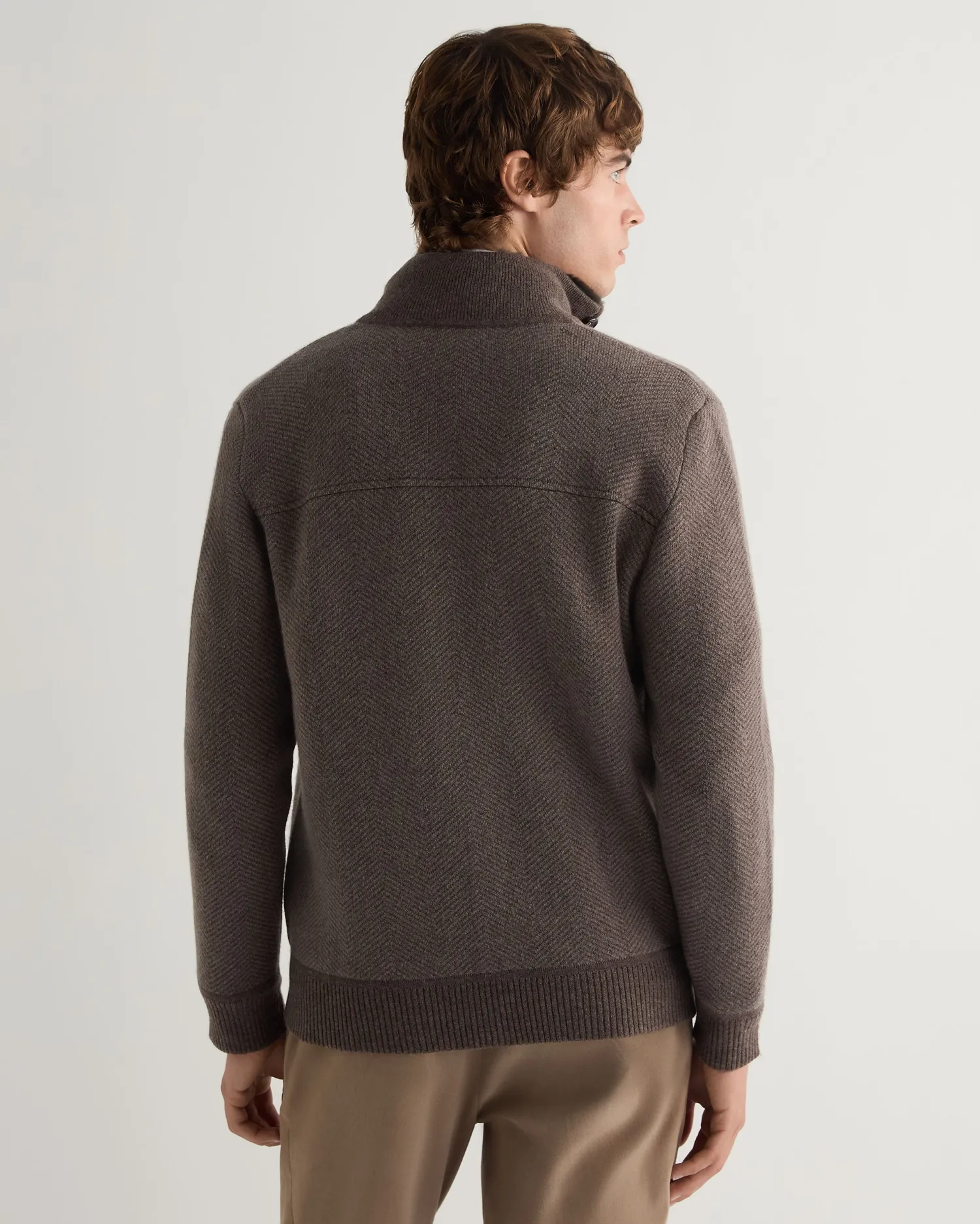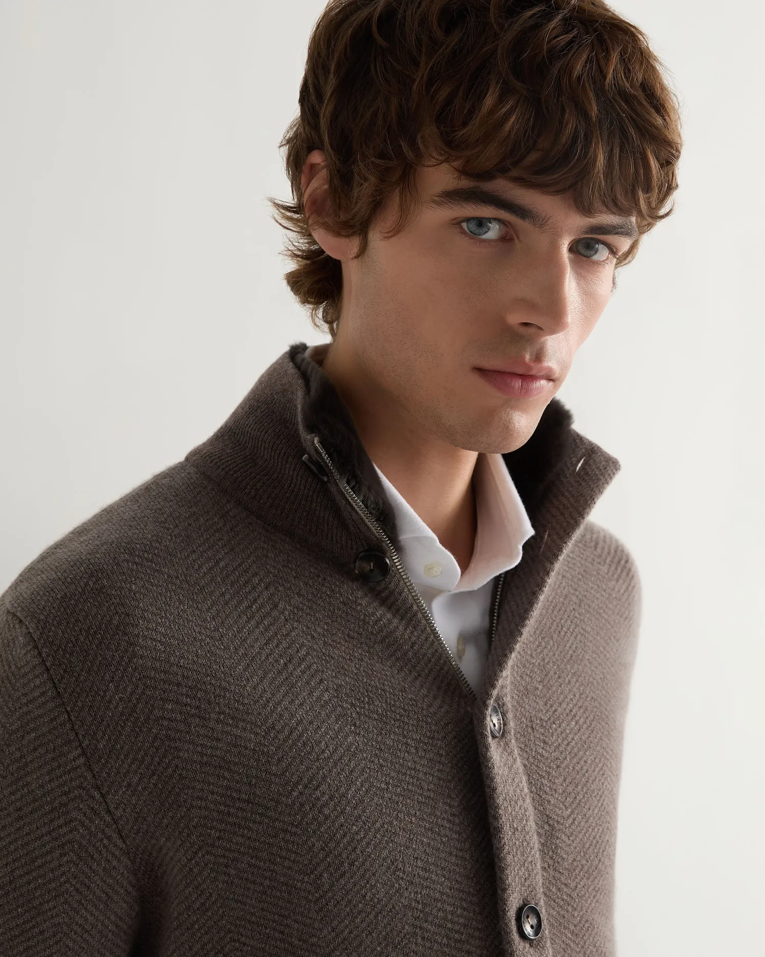 A smart new jacket from the N.Peal designers for this season. Made from 100% Mongolian cashmere with dark brown fur lined collar- Biscotti and taupe brown body and arms with biscotti brown ribbed finish on hem, cuffs and collar – Two distinctive buttoned patch pockets – Zip fastening with button placket over – Attractive herringbone design – 1ply – Model is wearing size Medium – Care: Dry Clean Only