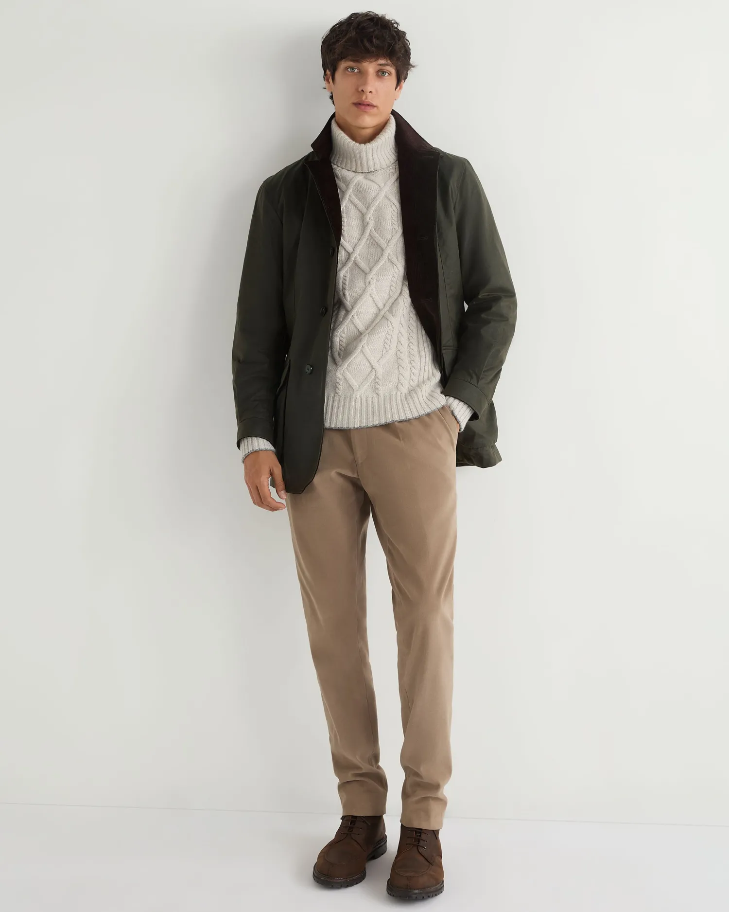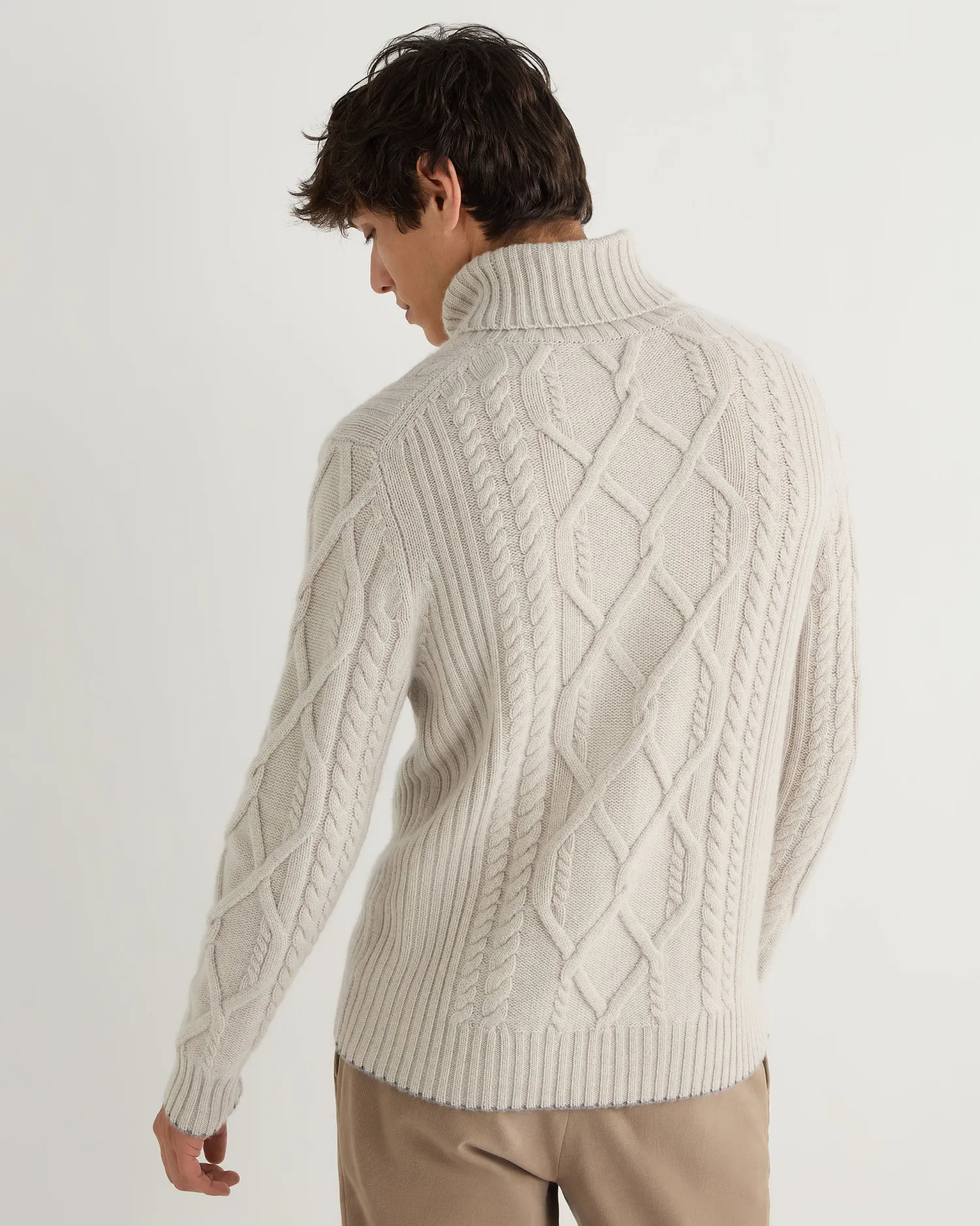 Introducing our new chunky cable roll neck sweater, the varied cable knit patterns add a touch of traditional elegance to your wardrobe. Made from 100% Mongolian organic cashmere – A luxurious layering piece – Perfect for skiing and cold pursuits – Matching ribbed design on the cuff, hem and neck – Flannel grey contrast trim- 4ply – Model is wearing size Medium – Care: Hand Wash Organic cashmere: organic dyes and detergents, free from fertilizer and pesticides, find out more here