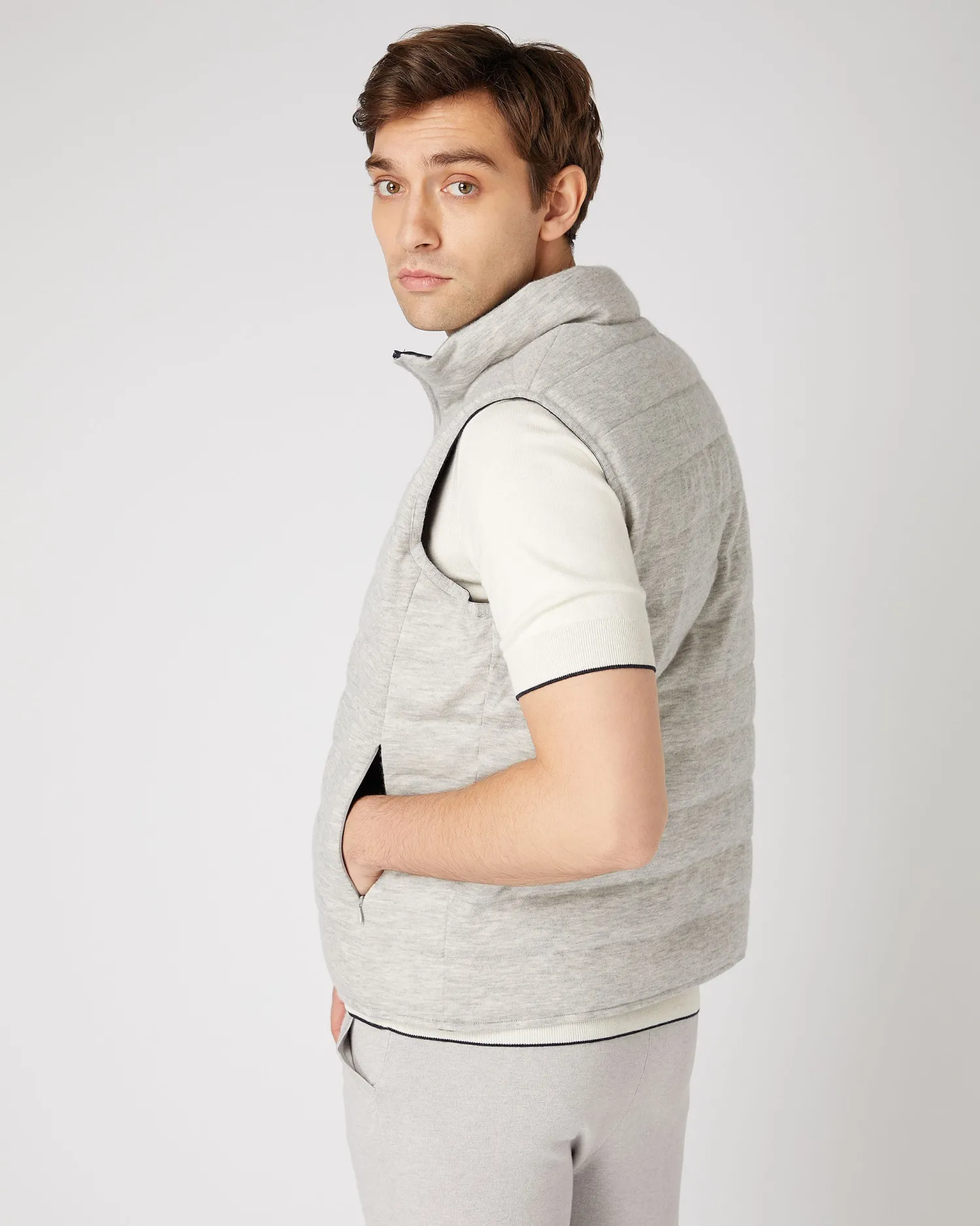 A whole new gilet style, reversible and padded with down. Carefully designed with a London Weather System™ outer finish which offers the finest comfort whilst providing water repellence and wind resistance. Made from 100% organic cashmere teamed with a gentle nylon – Two way zip – Horizontal stitch pattern – Side pockets – Fumo grey with navy blue reverse – Reversible style for ultimate versatility – 1ply – Model is wearing size Medium – Care: Dry Clean Only