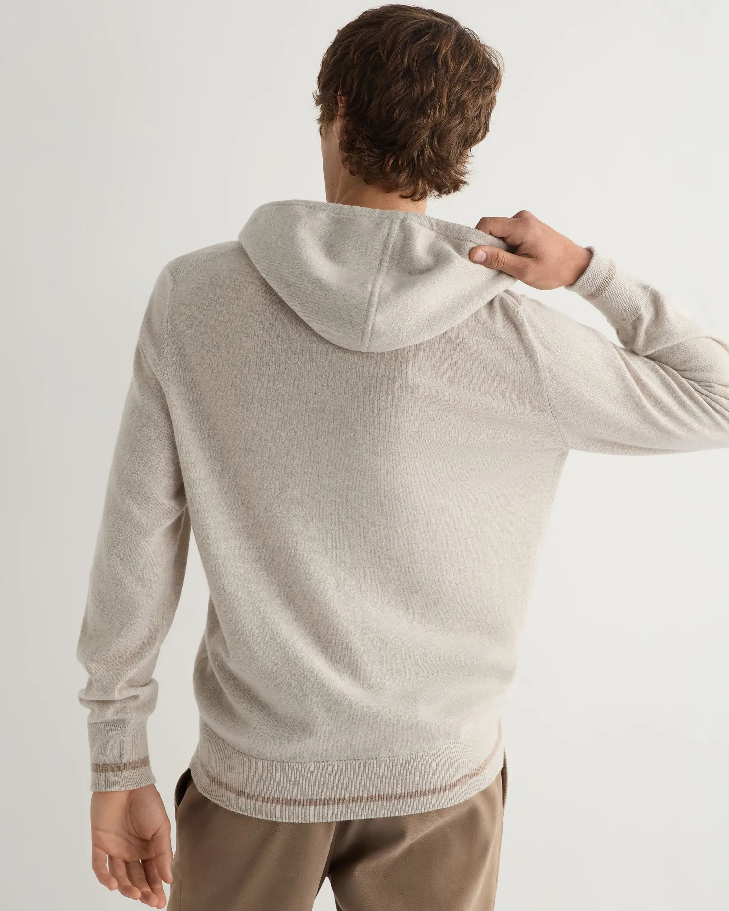 This fabulous new sweatshirt style hoodie has arrived just in time for winter, perfect for lounging at home in or layering up for the cold. Made from 100% Mongolian organic cashmere – Subtle v design on the chest – Delicate oatmeal brown trim on the hem, cuffs and drawstring – Soft and comfortable on the skin – 1ply – Model is wearing size Medium – Care: Dry Clean Only Organic cashmere: organic dyes and detergents, free from fertilizer and pesticides, find out more here