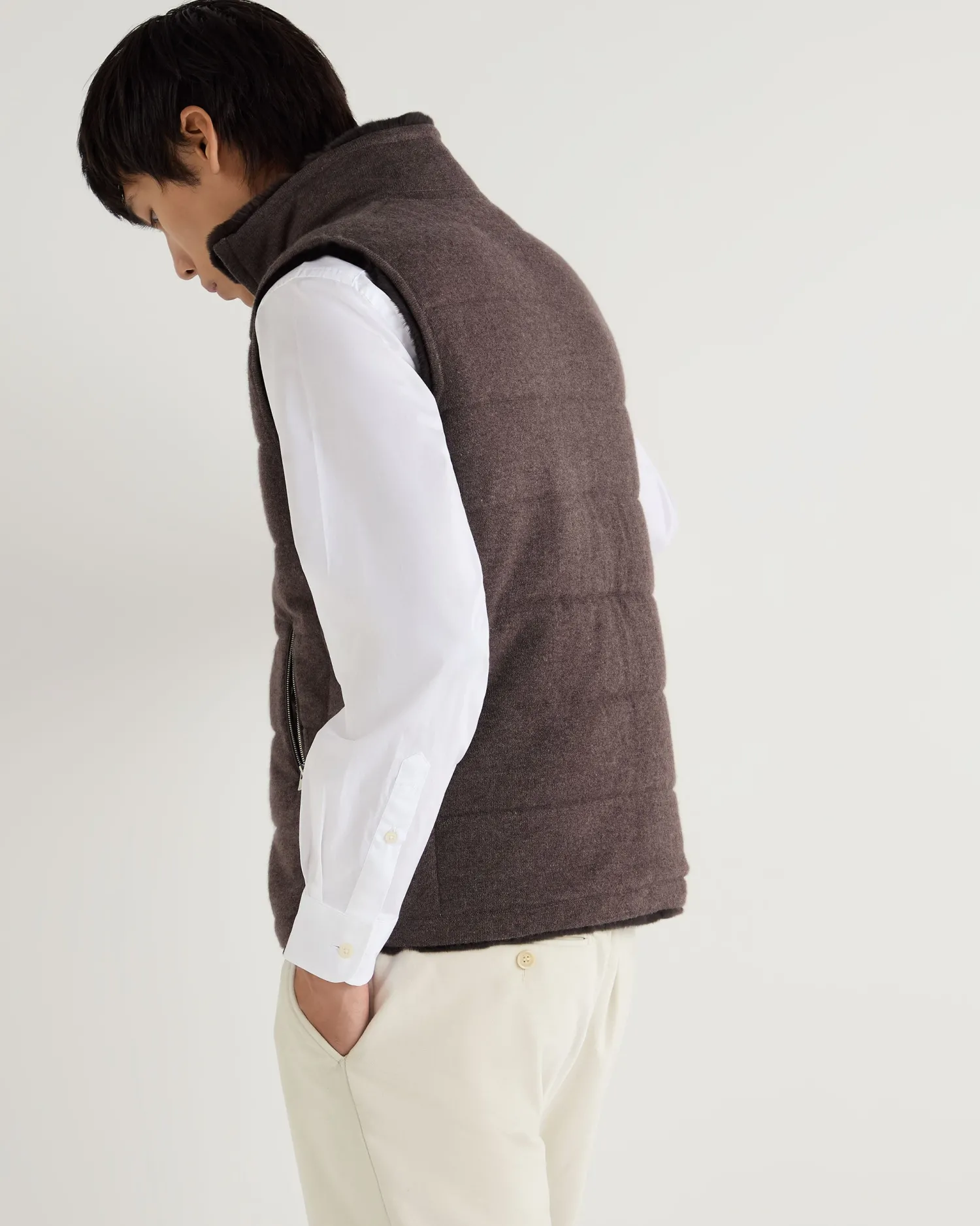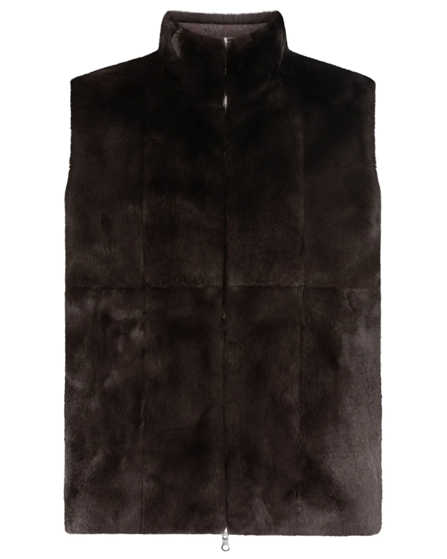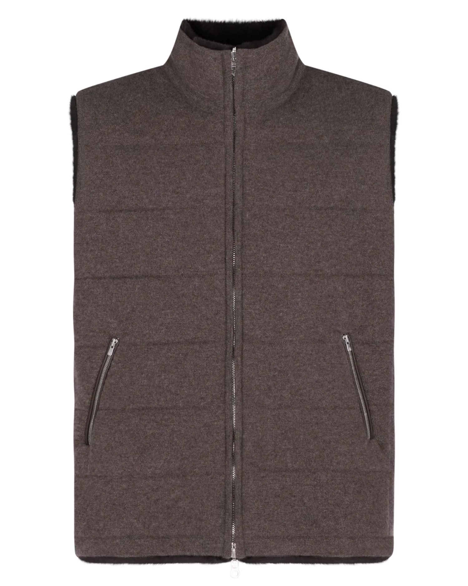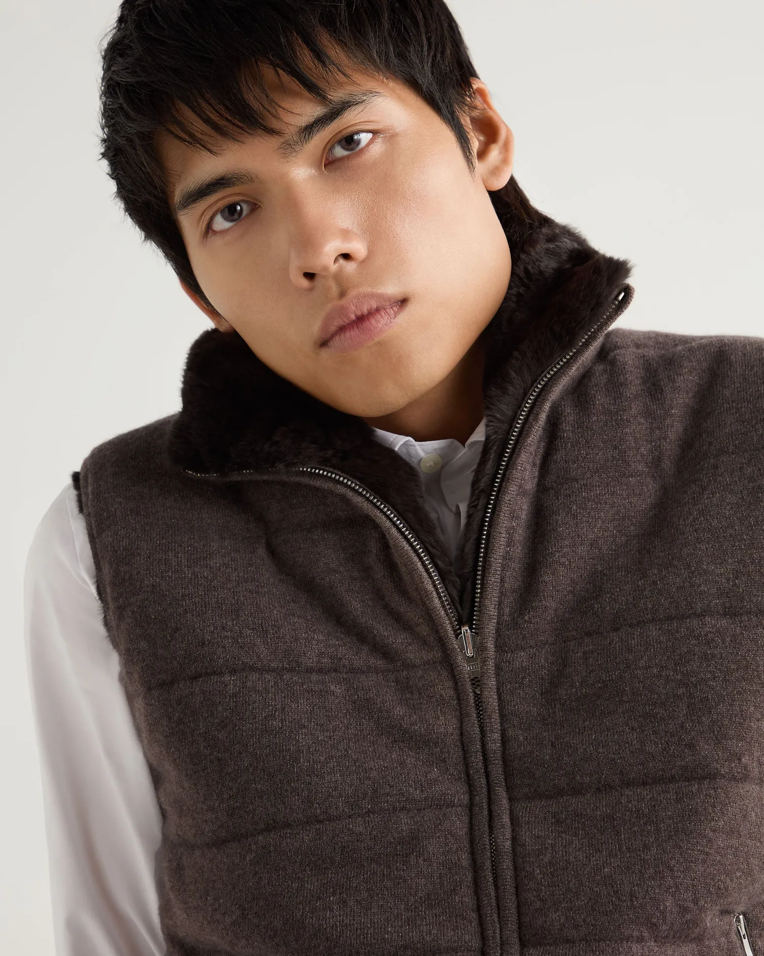True luxury in a gilet – fur lined cashmere, what could be better? 100% cashmere and dark brown Rex fur – Quilted two layers of cashmere – Inner cotton down filling – Reverse in 100% rex fur with deep pile – Velvety texture – Fur attached by hand – Stunning gilet providing warmth, comfort and style – 1ply – Model is wearing size Medium – Care: Dry Clean Only