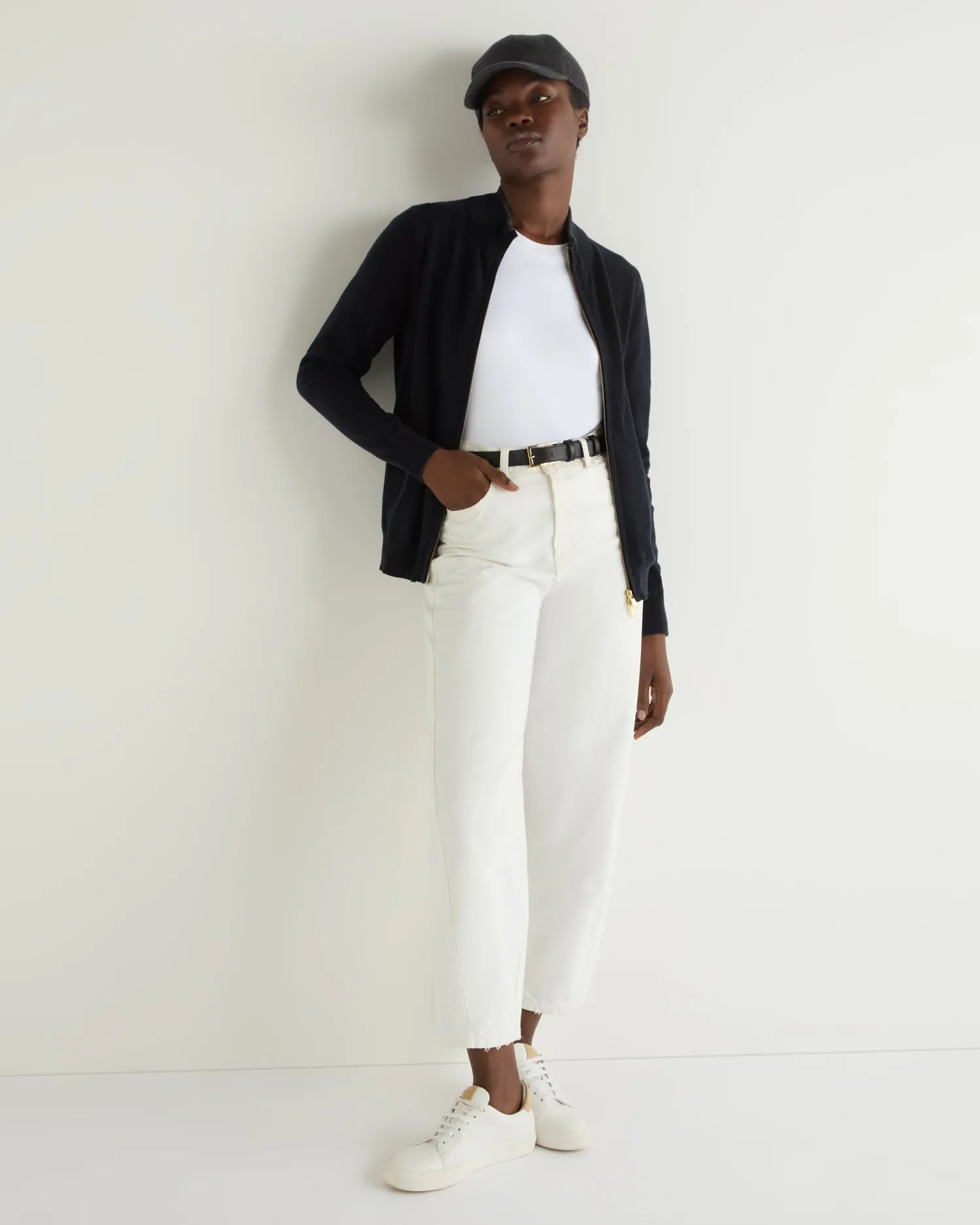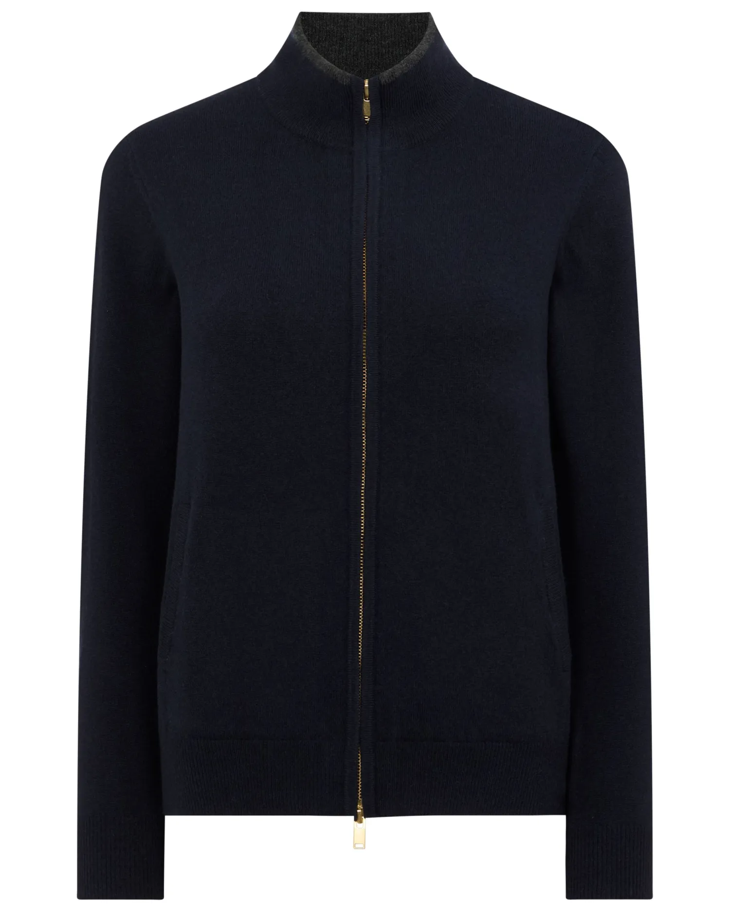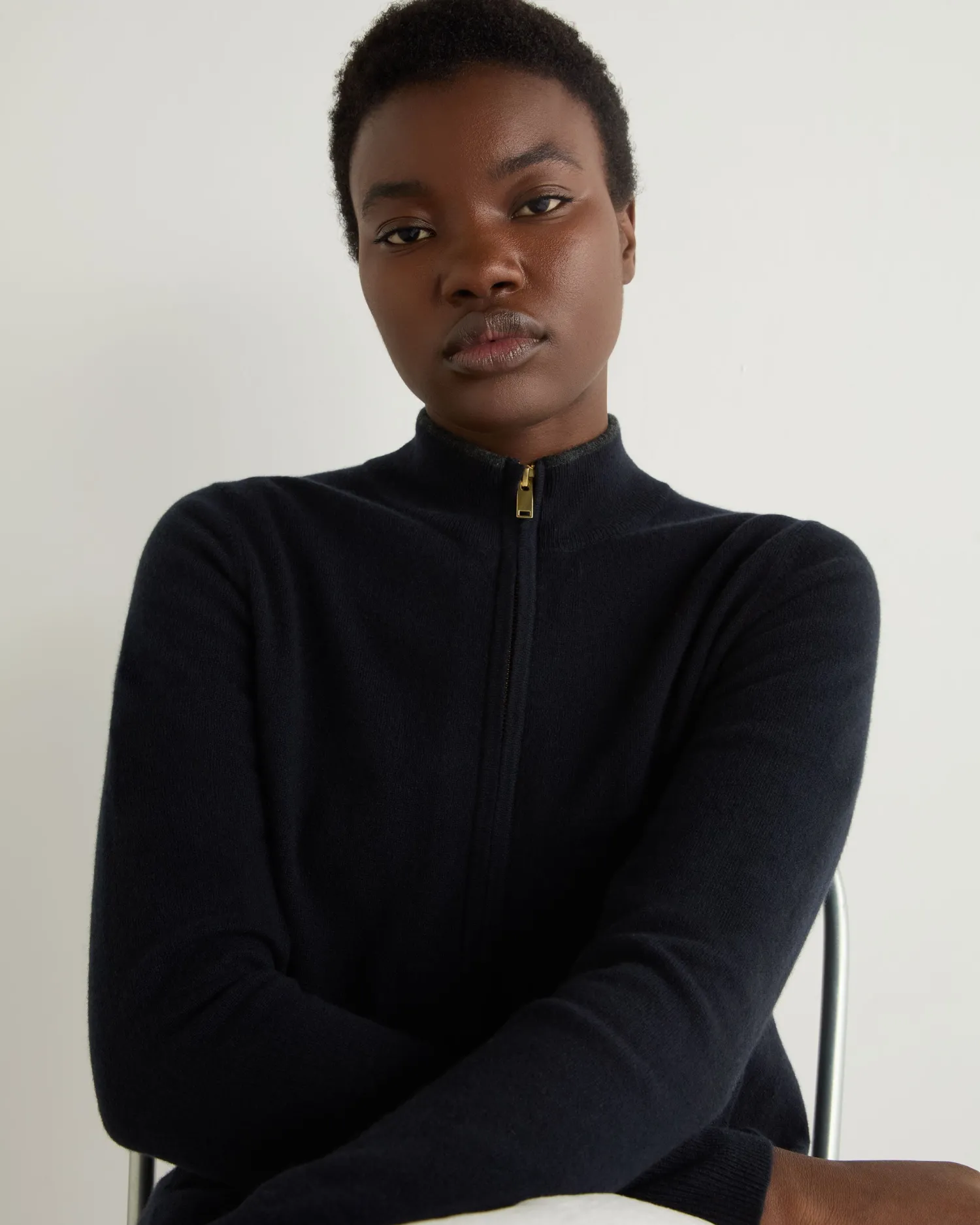 Keep warm and stylish in our funnel neck cashmere zip through. 100% Mongolian organic cashmere – Elegant two-way zip – Dark charcoal grey contrast trim- Jacket style piece – Perfect layering style – 1ply – Model is wearing size Small – Care: Hand Wash Organic cashmere: organic dyes and detergents, free from fertilizer and pesticides, find out more here
