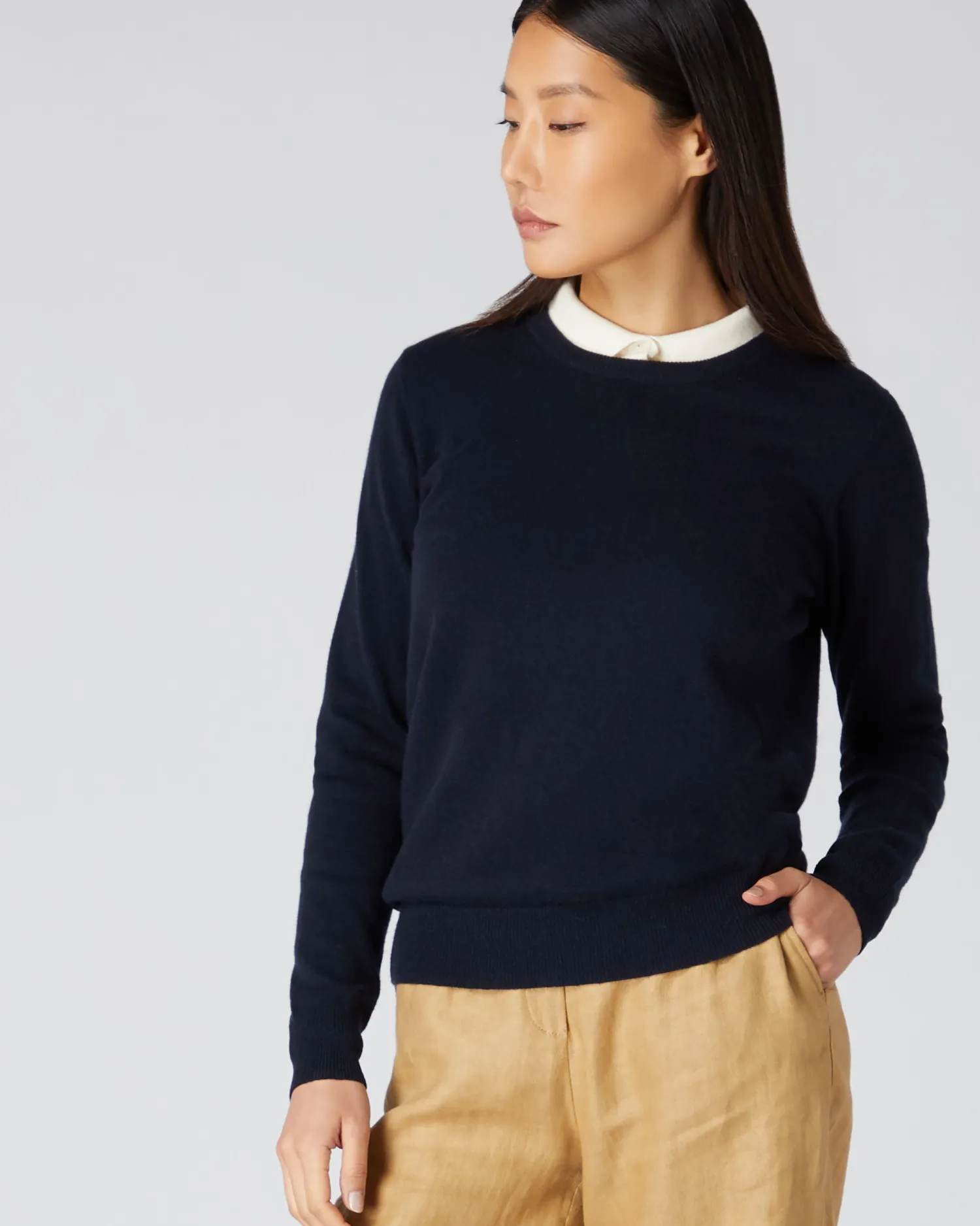 Our classic cashmere round neck sweater available in lovely shades. 100% Mongolian Organic Cashmere – Elegant round neck style – Wardrobe staple – Luxuriously soft – Perfectly cut – Neat trim finishing – Fabulous colour selection- Model is wearing size Small- Care: Hand Wash Organic cashmere: organic dyes and detergents, free from fertilizer and pesticides, find out more herenFind our full range of Women’s Cashmere Jumpers here.