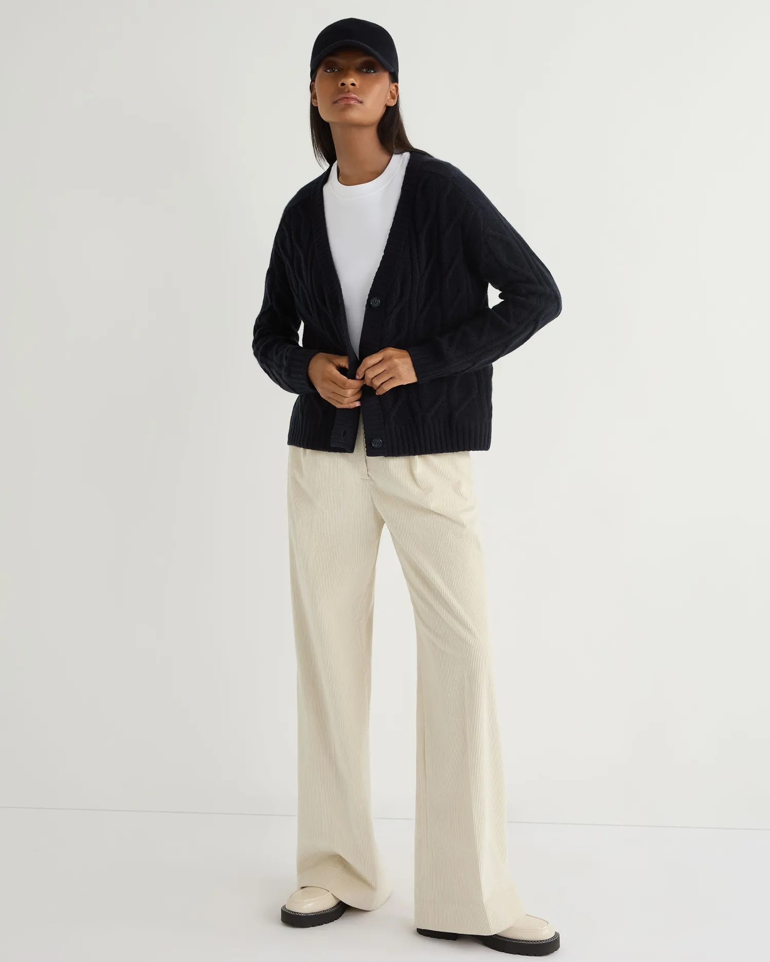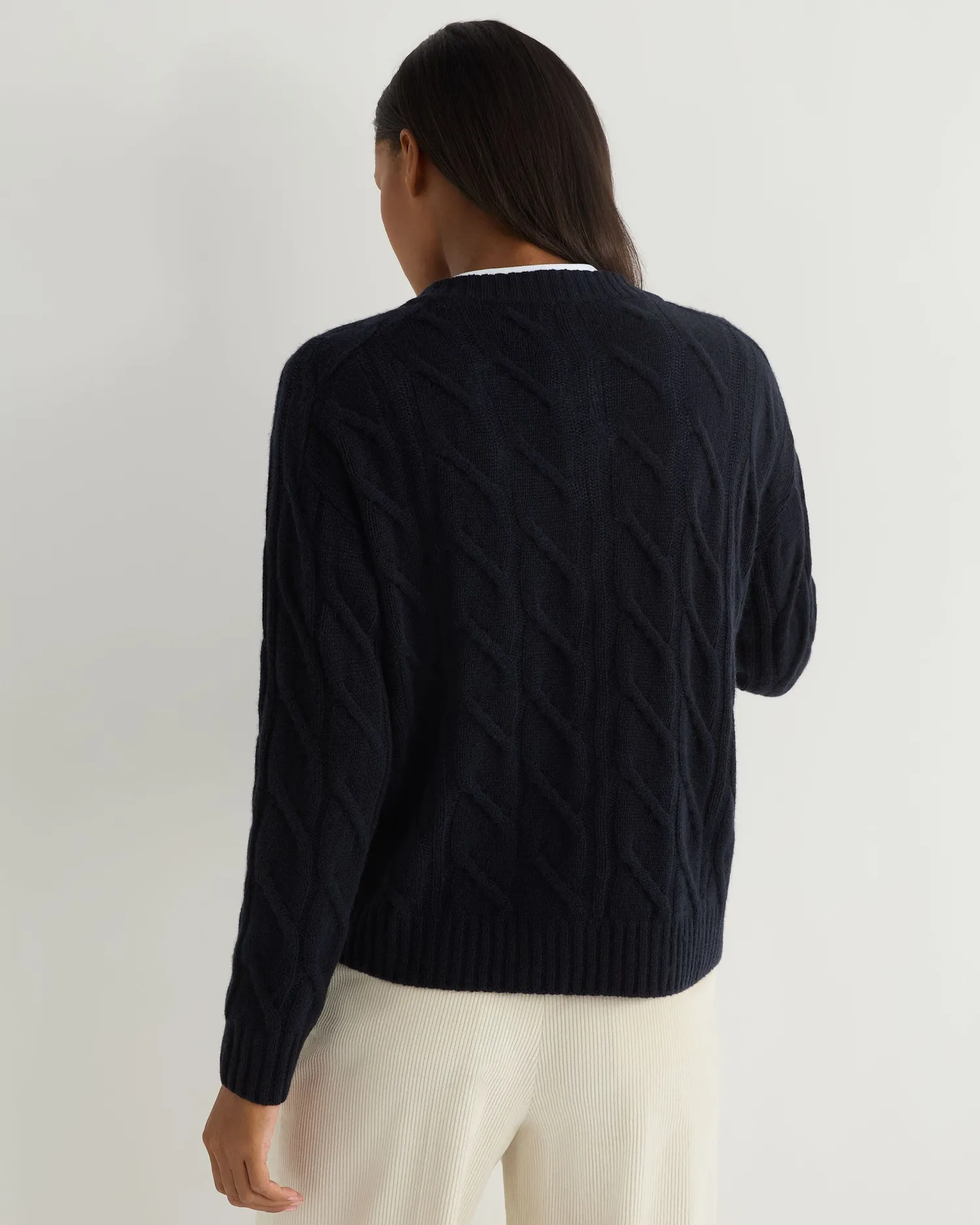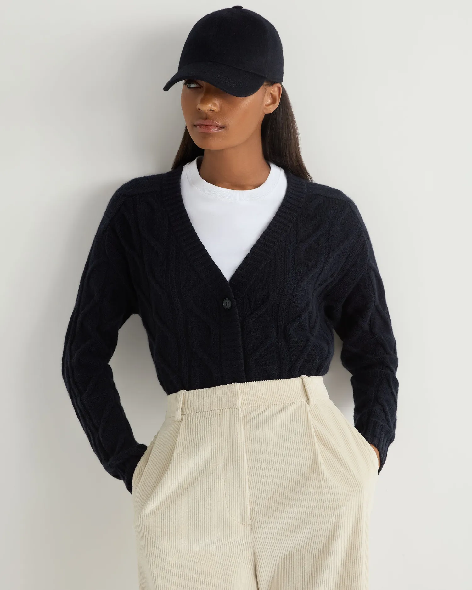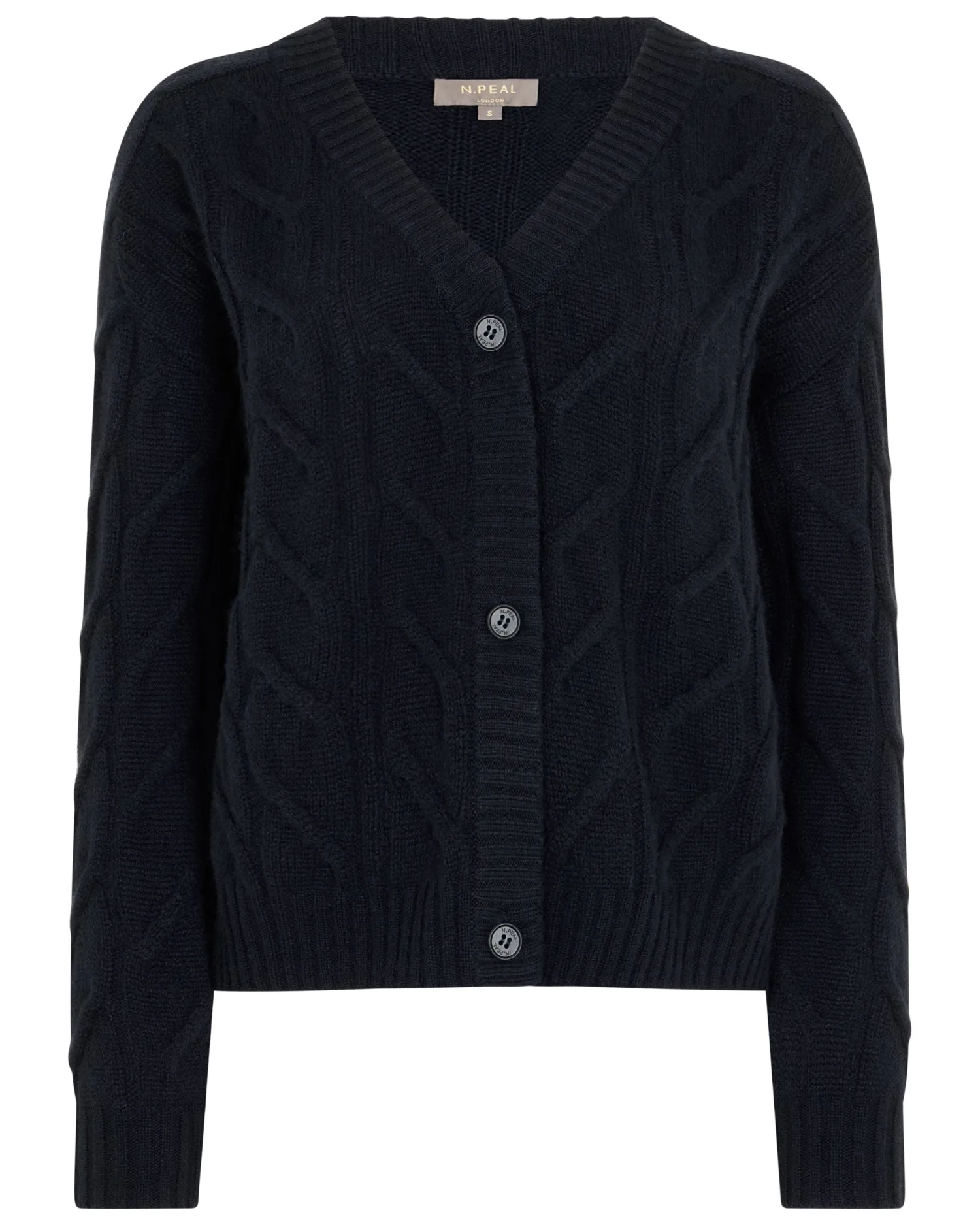 Elevate your wardrobe with N.Peals new V- neck cable cardigan, a quintessential blend of luxury and comfort. Made from 100% Mongolian organic cashmere – Popular cable design – Elegant V-Neck style – 3 smart buttons – Thick rib design on cuff, hem and down the front of the body – Luxurious and comfortable – Fabulous worn casually with jeans or upgraded with a crisp shirt and tailored trousers – 2ply – Model is wearing size Small – Care: Dry Clean Only Organic cashmere: organic dyes and detergents, free from fertilizer and pesticides, find out more here