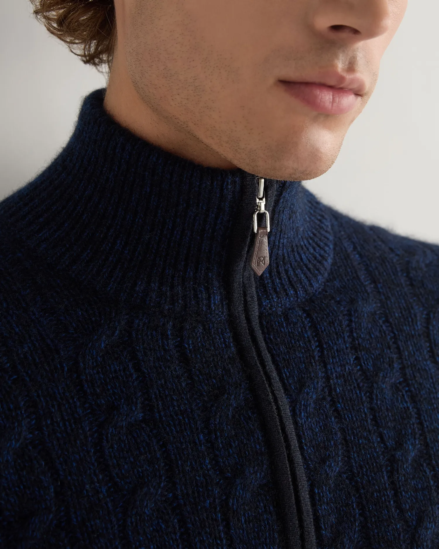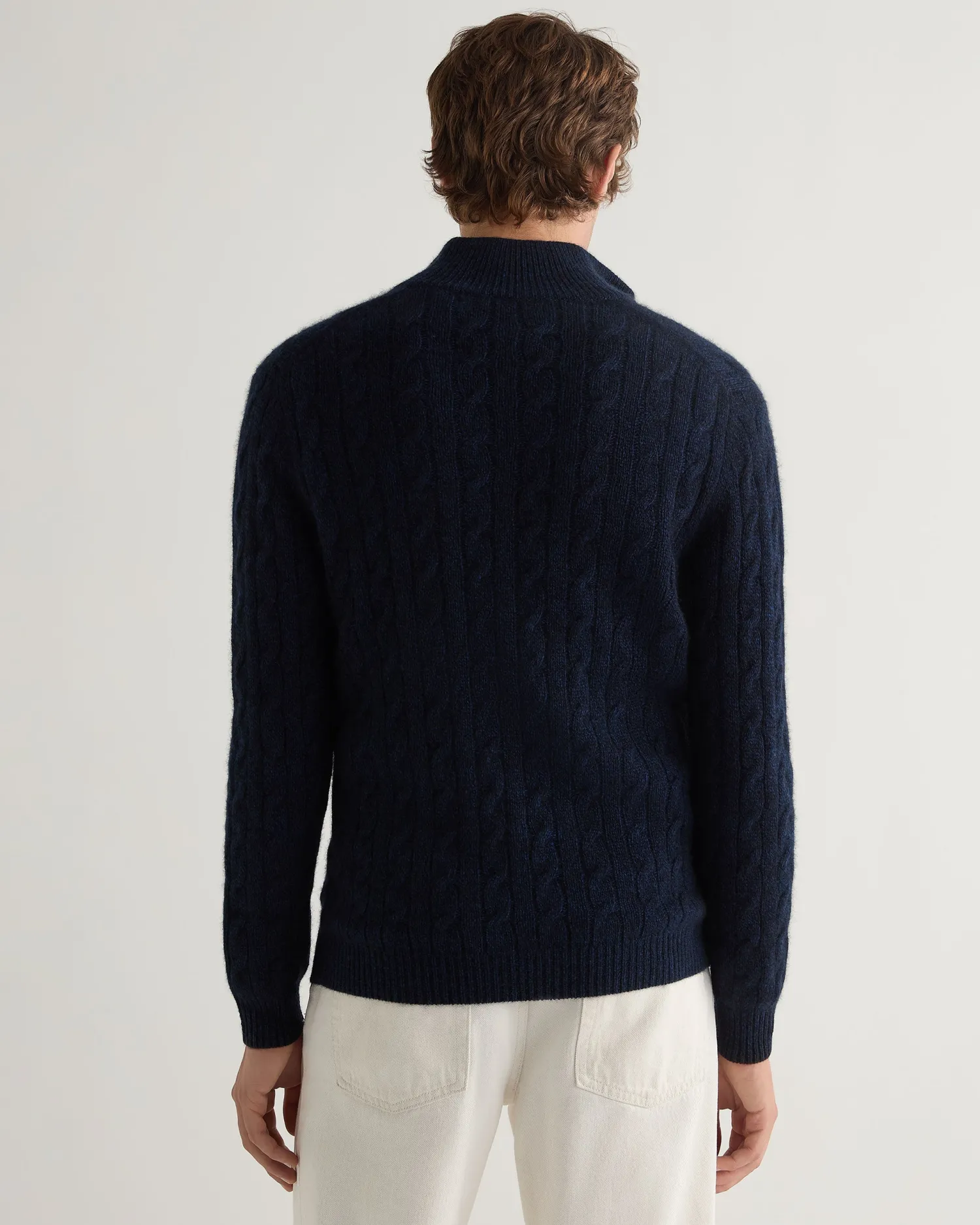 Here is a cable half zip cashmere sweater, beautiful and luxurious. 100% Mongolian organic cashmere – Cable knit design – Elegant half zip with leather toggle – Alcantara piping – Great layering piece – Delicate navy blue contrast on the cuff tip – 2ply – Model is wearing size Medium – Care: Dry Clean Only Organic cashmere: organic dyes and detergents, free from fertilizer and pesticides, find out more here