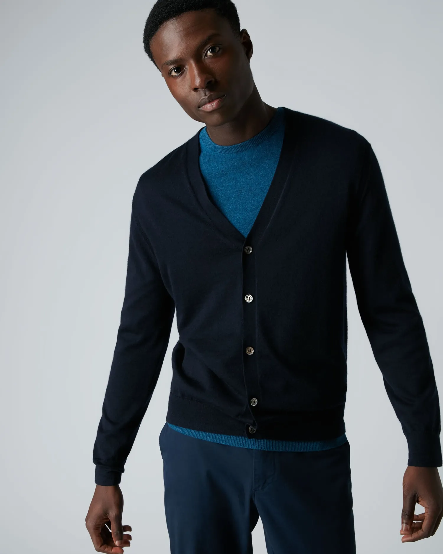 The N.Peal fine gauge cardigan, a great favourite amongst our clientele. 70% Cashmere and 30% Silk blend worsted yarn – Beautiful fine gauge weight – Silk added for a lighter smoother summer feel – Great cardigan style, so on trend – Great worn casually with a T shirt or Polo shirt – Equally good over a shirt and tie – Our fine gauge products have a naturally slimmer fit, if you’d like a looser fit (like our other products) or are between sizes, we suggest you size up- Model is wearing size Medium- Care: Hand Wash