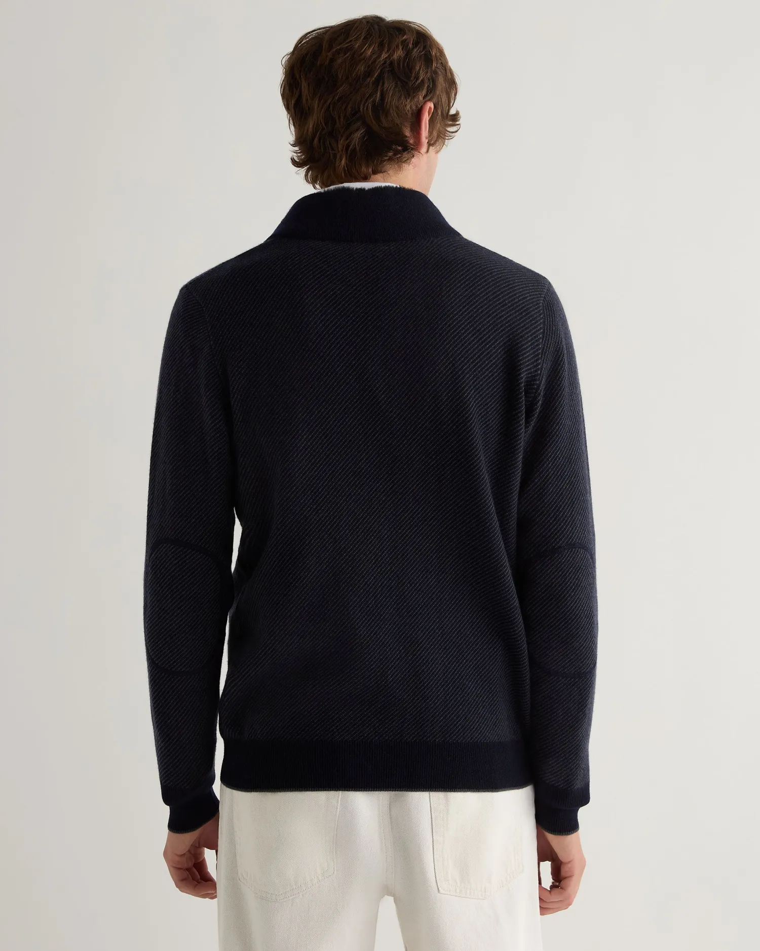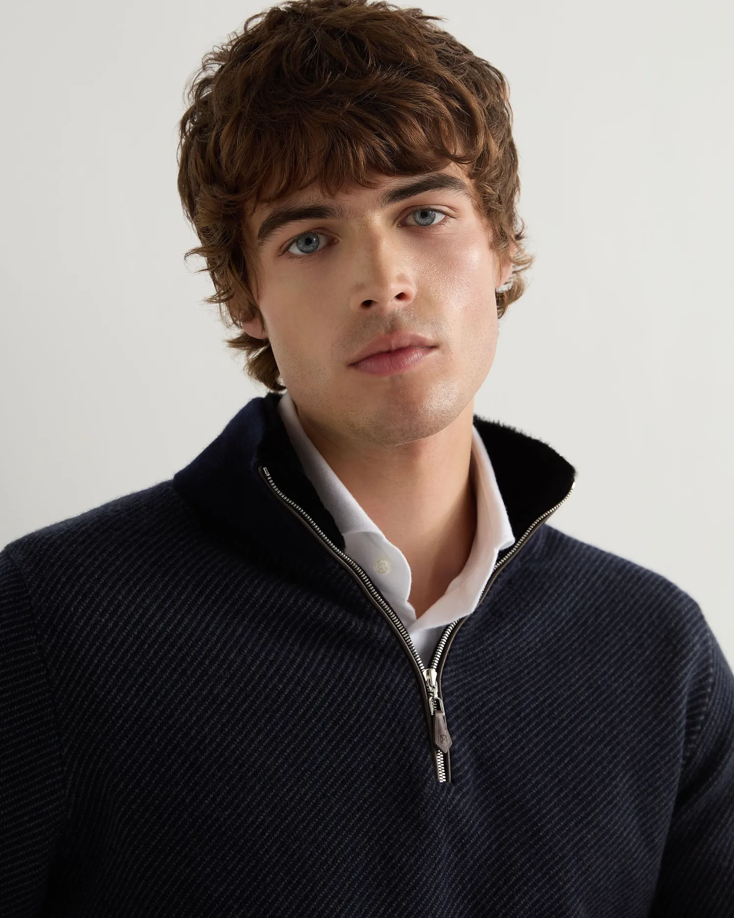 Another half zip to add to the collection, this time upscaled with a fur trim. Made from 100% organic Mongolian cashmere with a rex fur inner collar trim – Ever popular half zip style – Matching collar, cuffs and hem – Combining navy blue and anthracite grey with a navy blue coloured rex fur trim on the inner collar – Ecru tipping on hem and cuffs – Delightful stitch pattern – 1ply – Model is wearing size Medium – Care: Dry Clean Only Organic cashmere: organic dyes and detergents, free from fertilizer and pesticides, find out more here