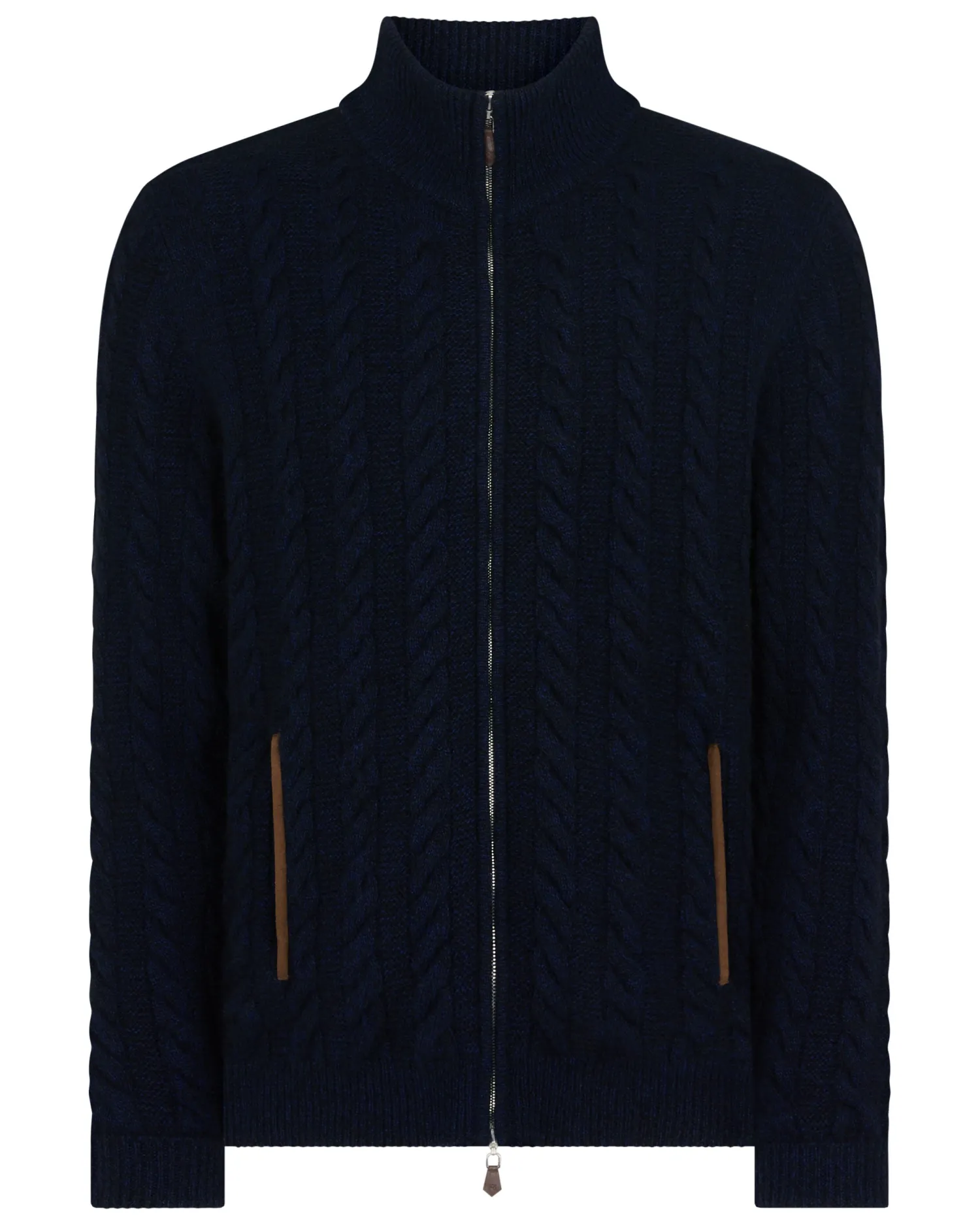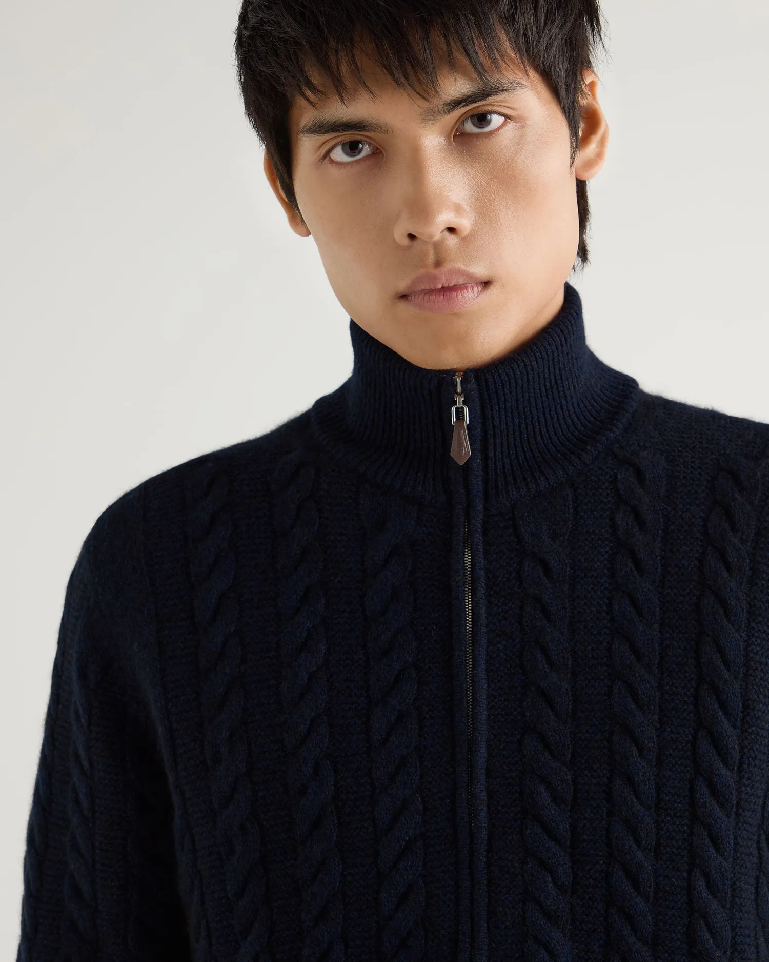 The Richmond – a cashmere cable cardigan beyond compare. n 100% Mongolian cashmere Attractive cable knit Handsome chunky knit Hand sewn Alcantara piping Two pockets Full length two way zip 3ply Model is wearing size Medium Care: Dry Clean Only